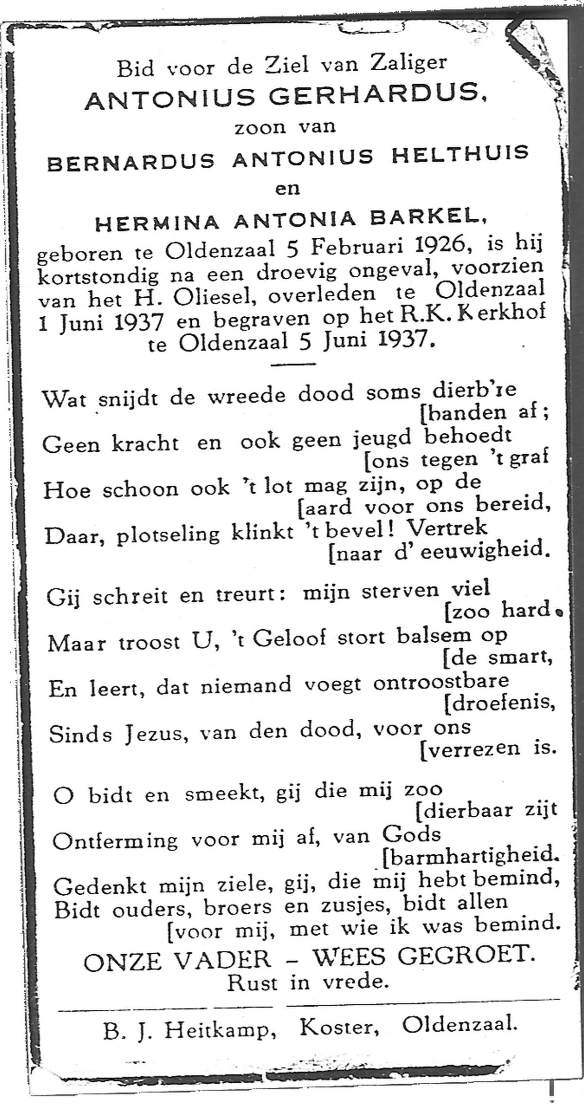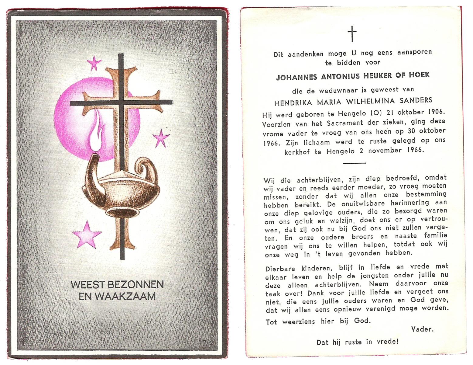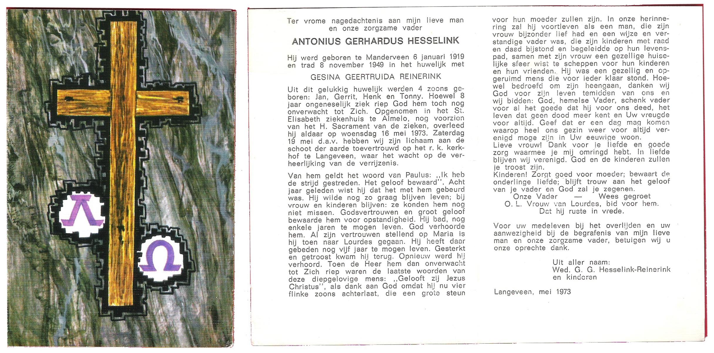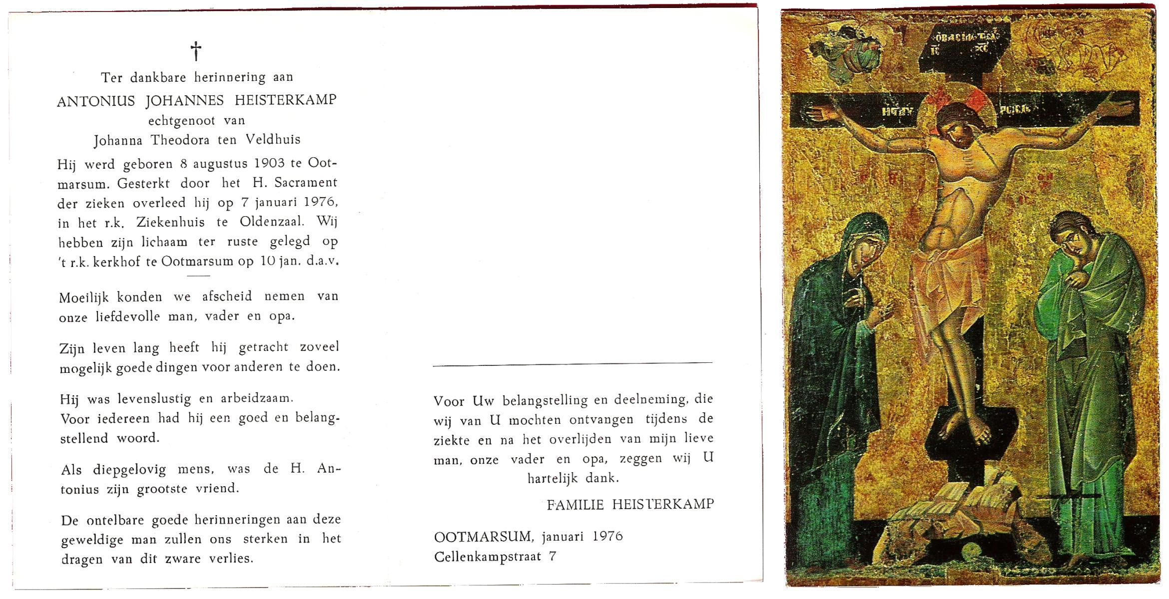 HEISTERKAMP, Antonius Johannes, geboren op 8-8-1903 te Ootmarsum, overleden op 7-1-1976 te Oldenzaal op 72-jarige leeftijd, begraven op 10-1-1976 te Ootmarsum.