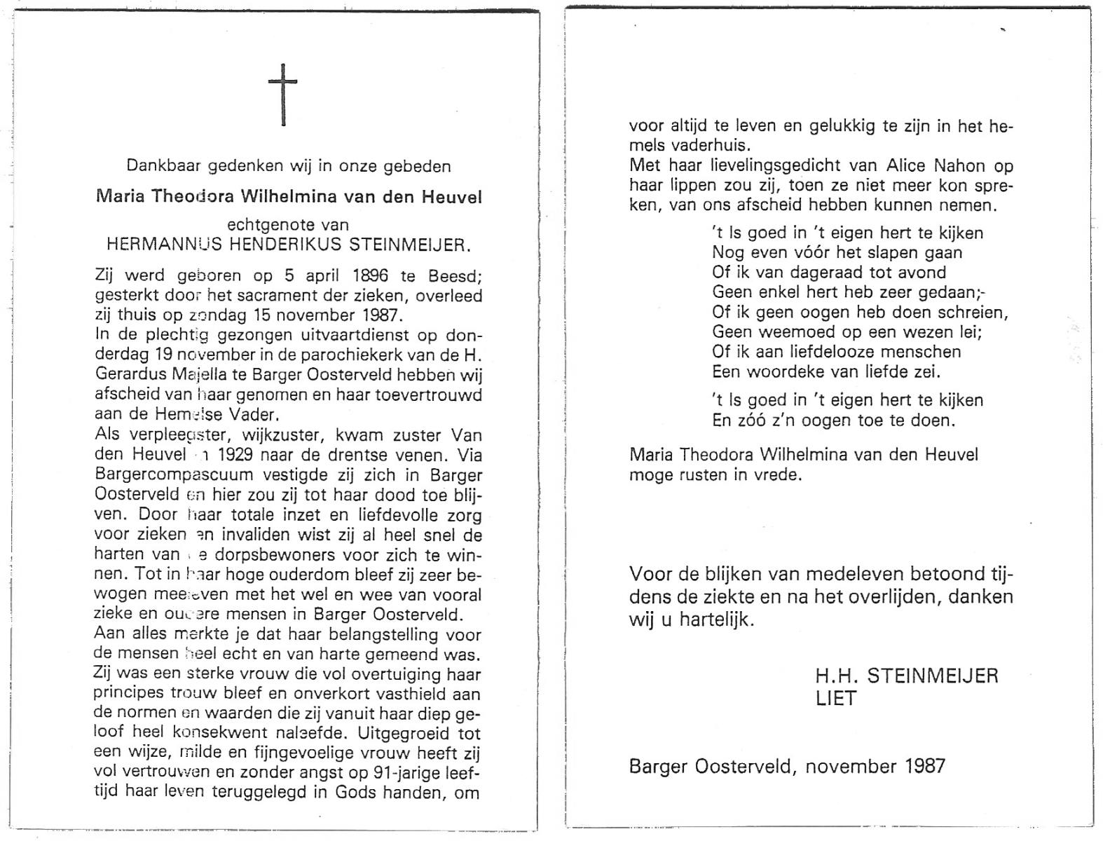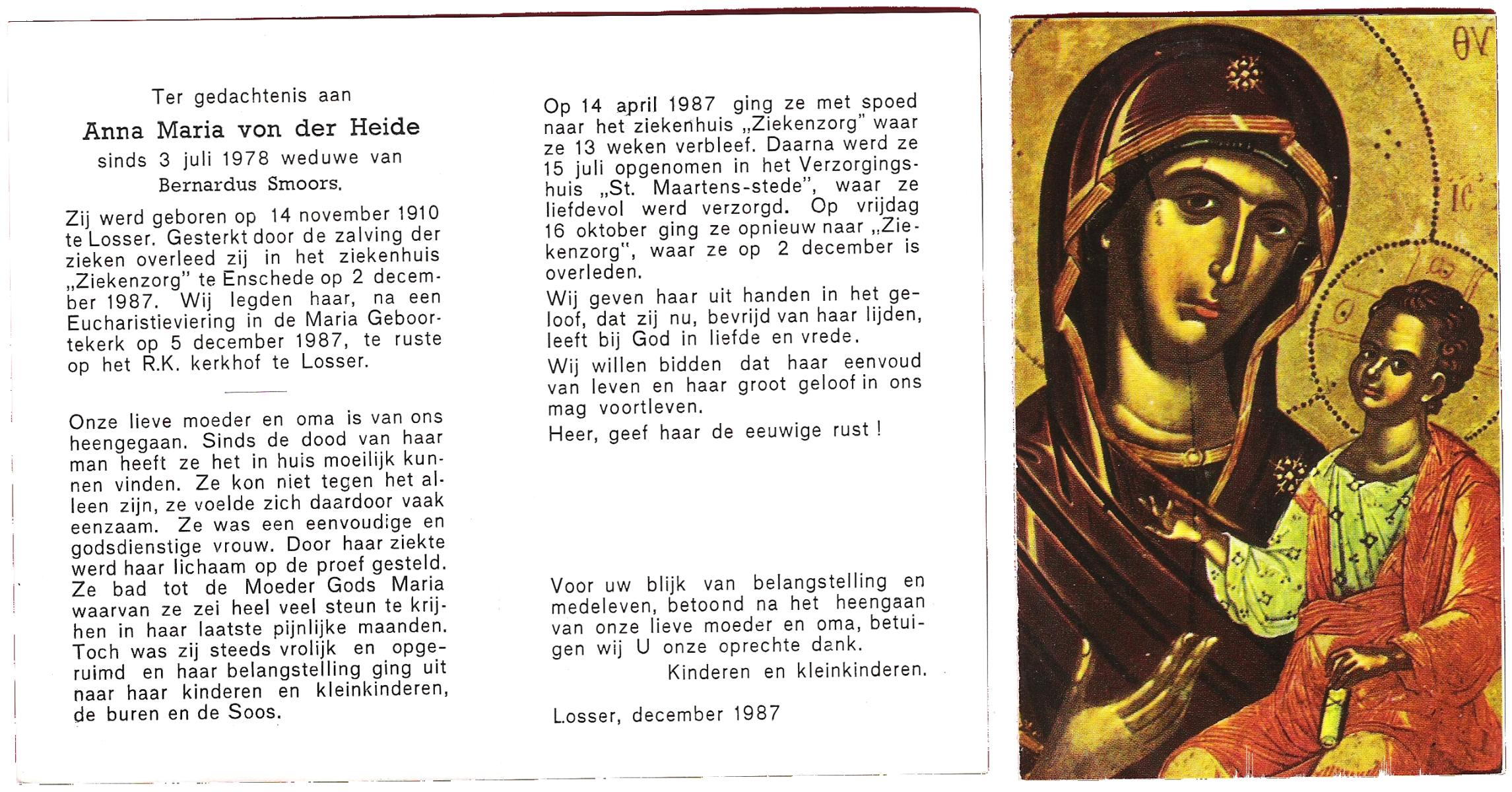 HEIDE, von der, Anna Maria, geboren op 14-11-1910 te Losser, overleden op 2-12-1987 te Enschede op 77-jarige leeftijd, begraven op 5-12-1987 te Losser.