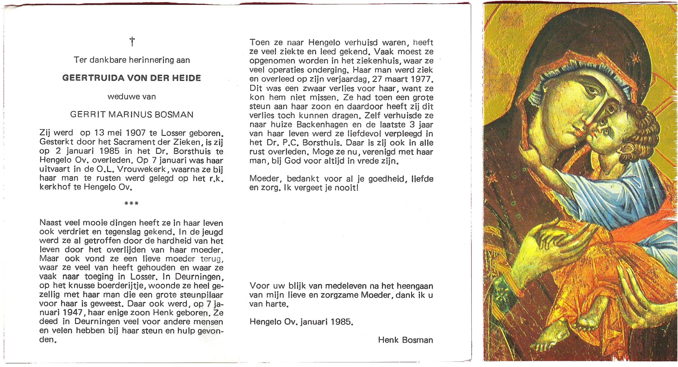 HEIDE, von der, Geertruida, geboren op 13-5-1907 te Losser, overleden op 2-1-1985 te Hengelo (Ov.) op 77-jarige leeftijd, begraven op 7-1-1985 te Hengelo (Ov.).