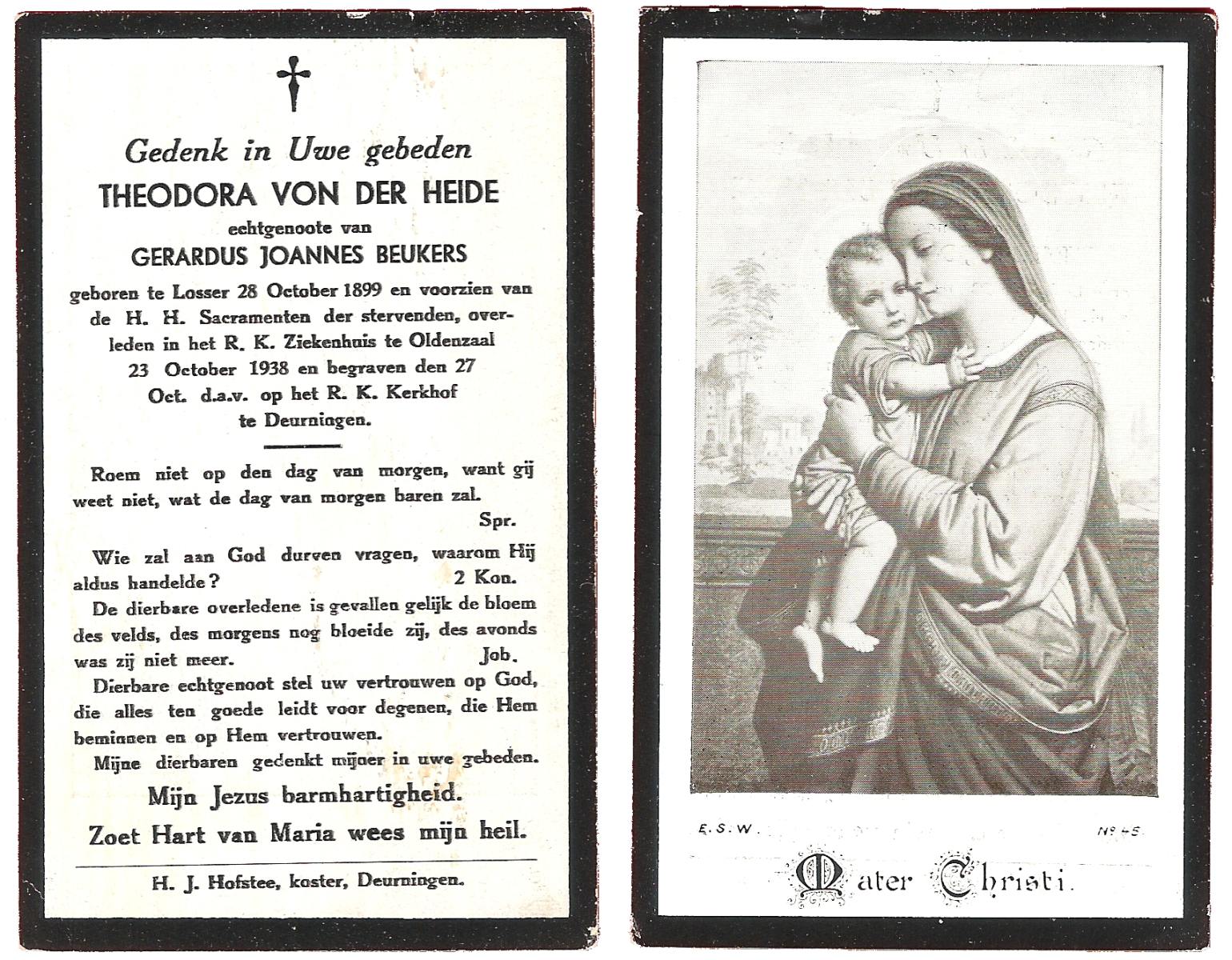 HEIDE, von der, Theodora, geboren op 28-10-1899 te Losser, overleden op 23-10-1938 te Oldenzaal op 38-jarige leeftijd, begraven op 27-10-1938 te Deurningen.