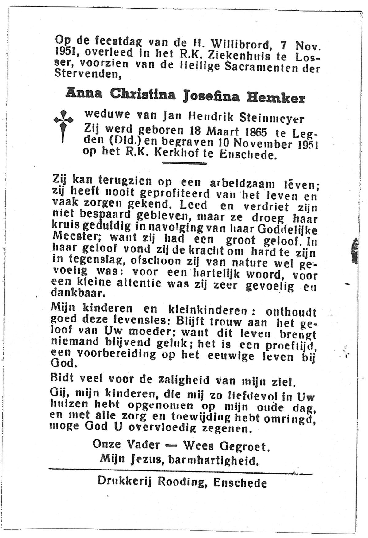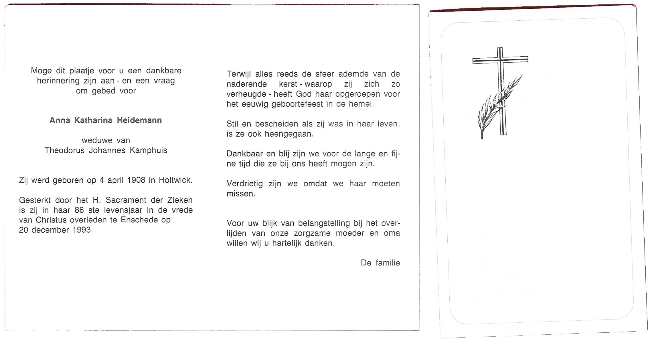HEIDEMAN, Anna Katharina, geboren op 4-4-1908 te Holtwick (Dld.), overleden op 20-12-1993 te Enschede op 85-jarige leeftijd.
