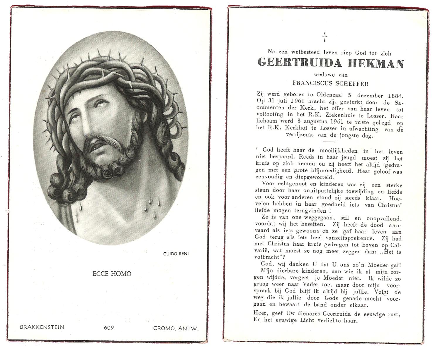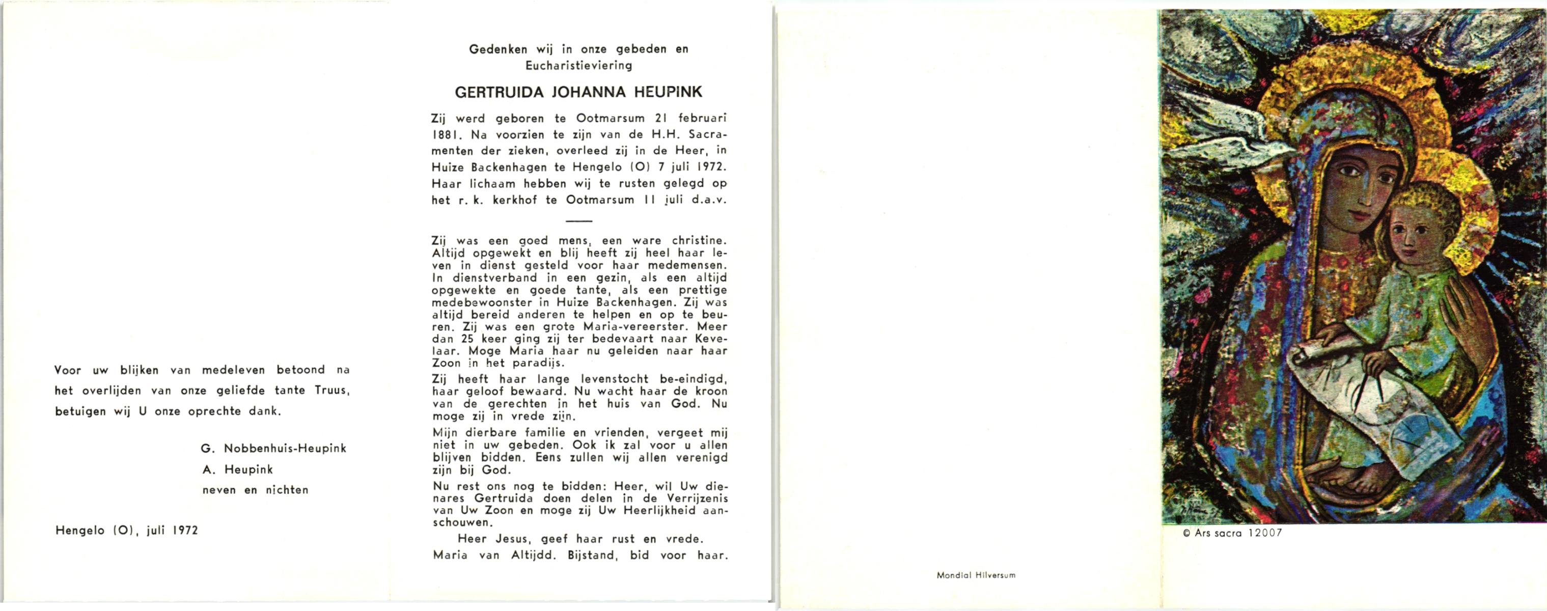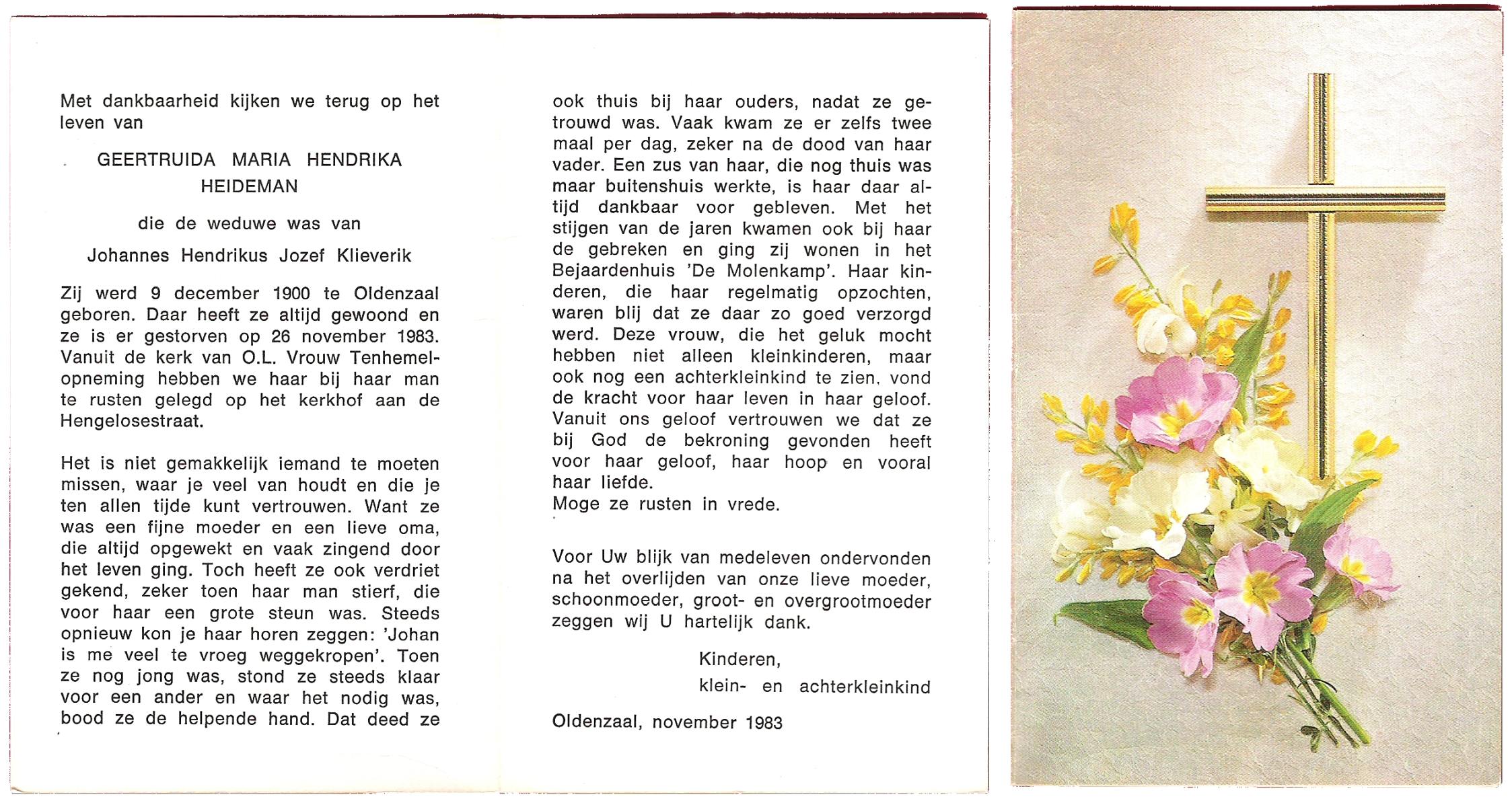 HEIDEMAN, Geetruida Maria Hendrika, geboren op 9-12-1900 te Oldenzaal, overleden op 26-11-1983 te Oldenzaal op 82-jarige leeftijd, begraven te Oldenzaal.