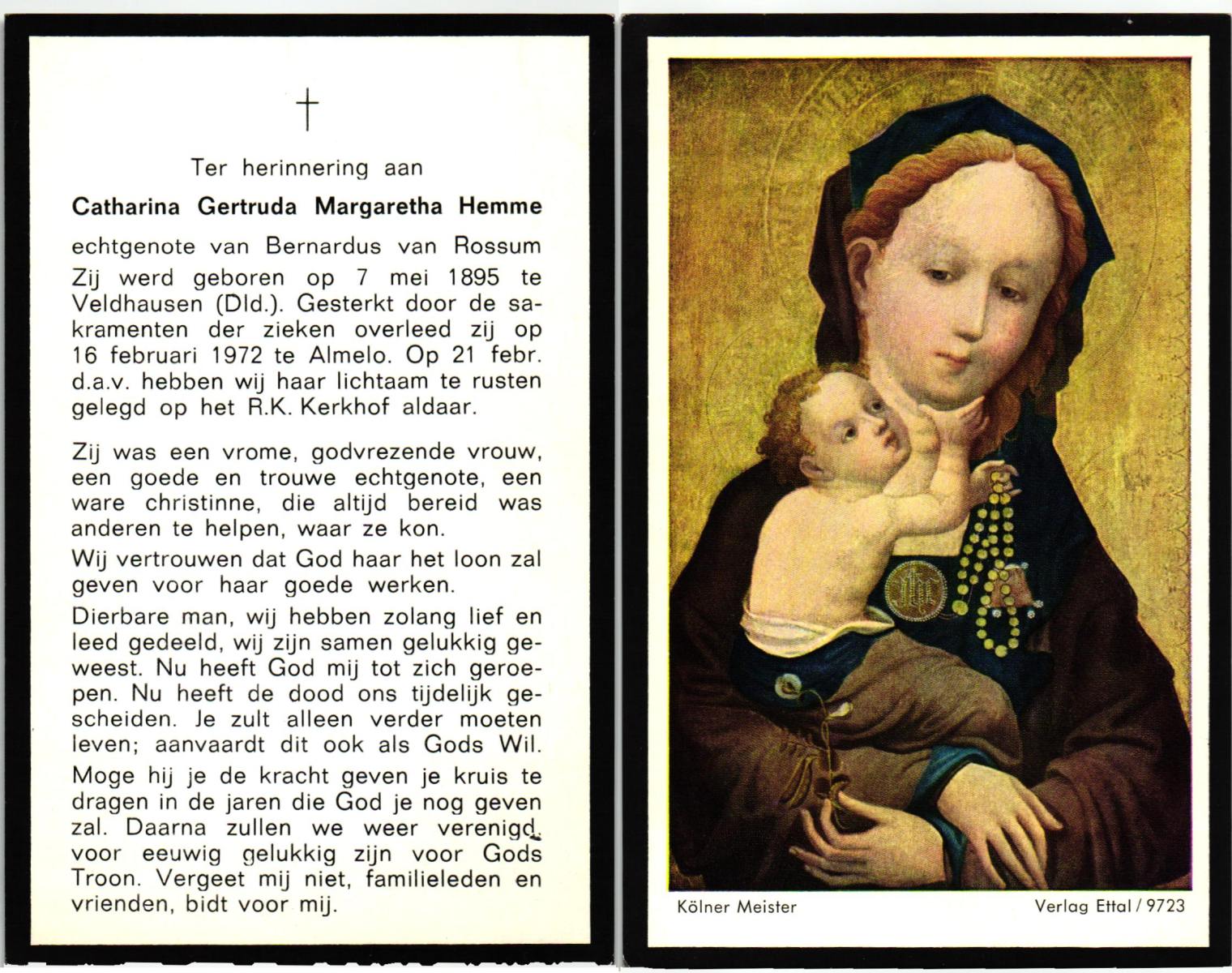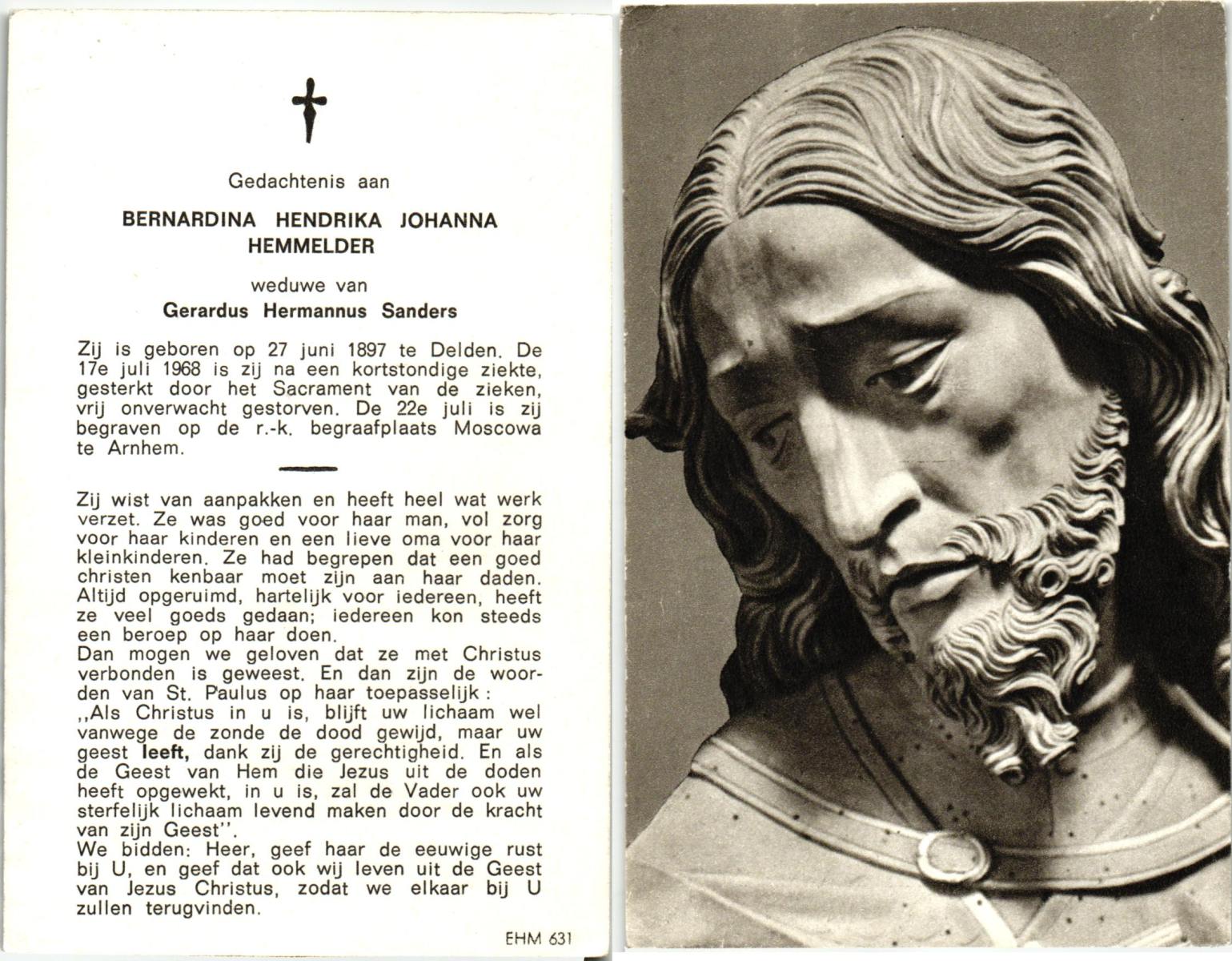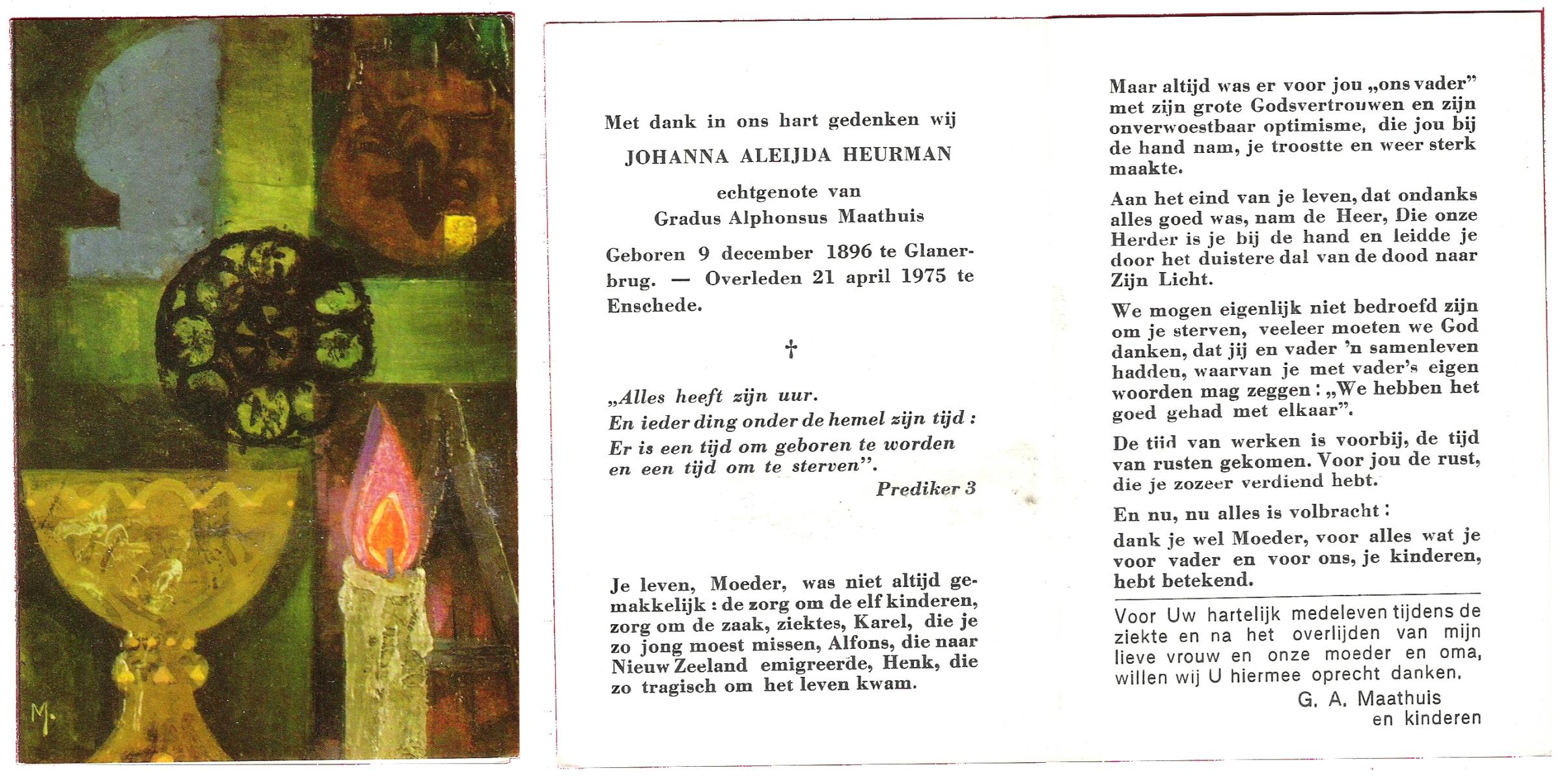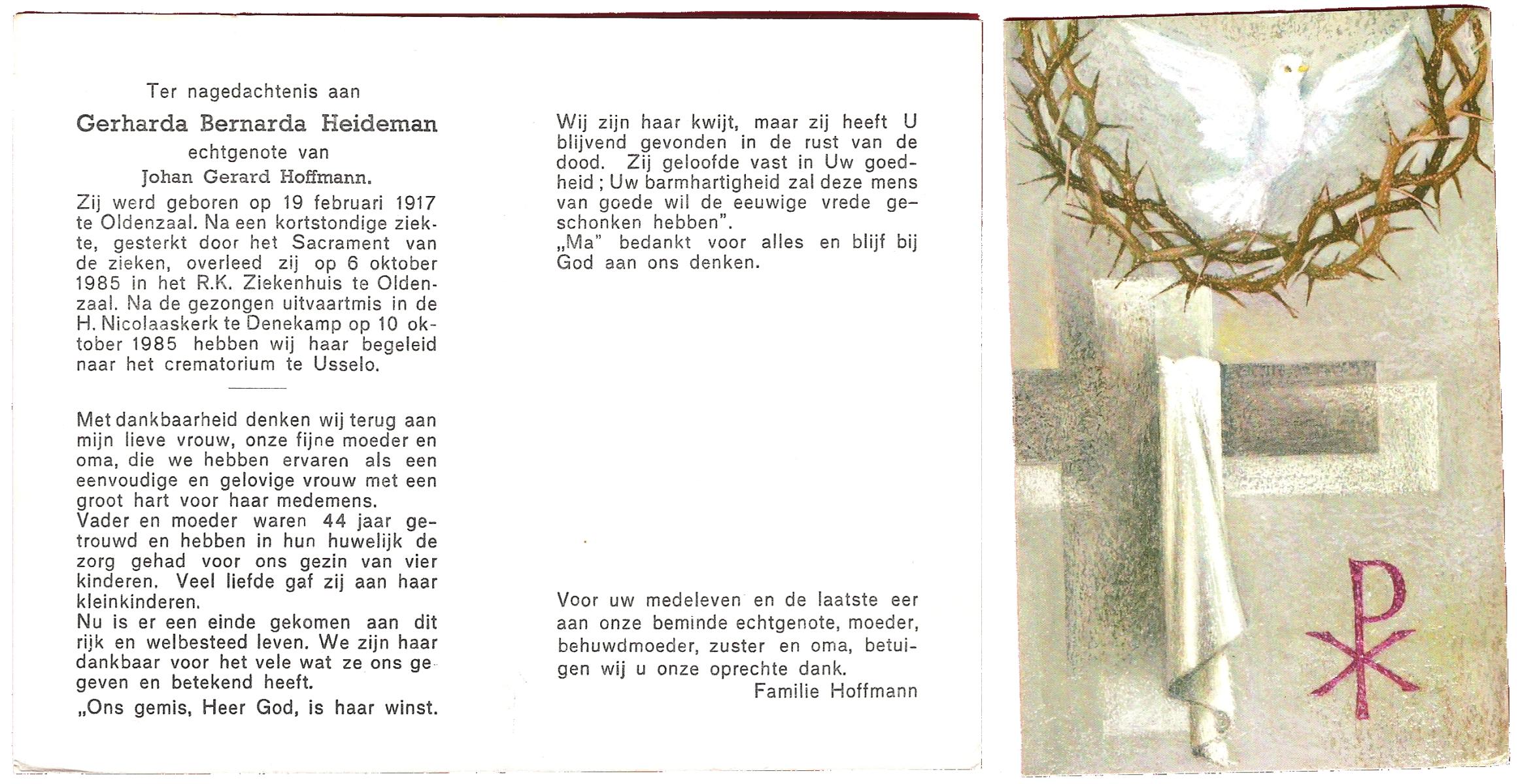 HEIDEMAN, Gerharda Bernarda, geboren op 19-2-1917 te Oldenzaal, overleden op 6-10-1985 te Oldenzaal op 68-jarige leeftijd, gecremeerd op 10-10-1985 te Usselo.