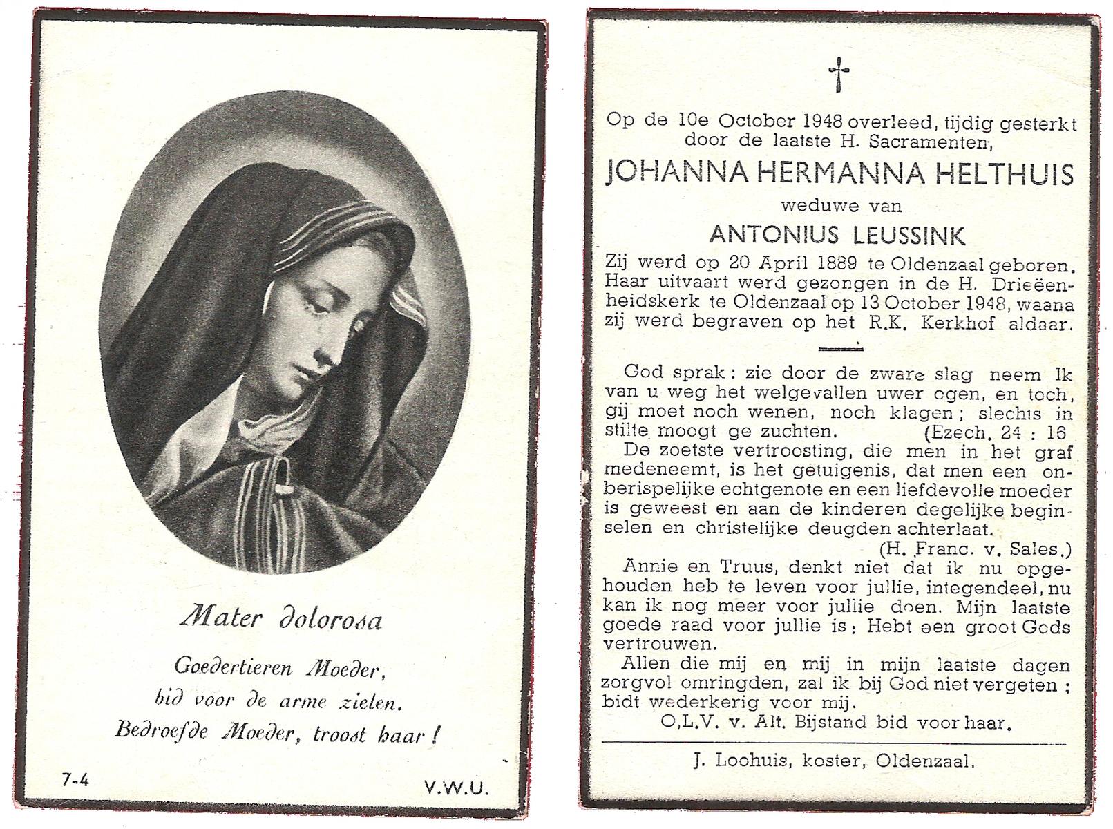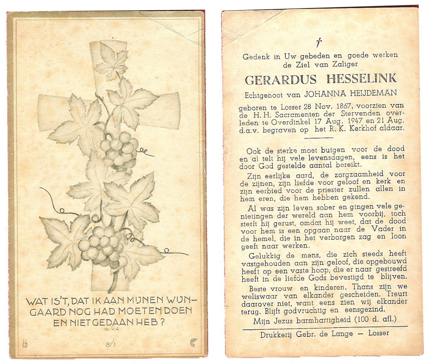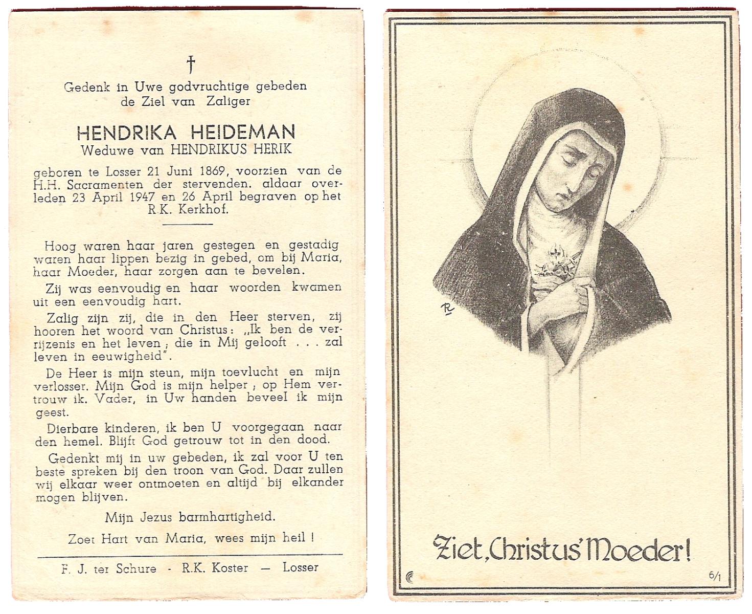 HEIDEMAN, Hendrika, geboren op 21-06-1869 te Losser, overleden op 23-4-1947 te Losser op 77-jarige leeftijd, begraven op 26-4-1947 te Losser.