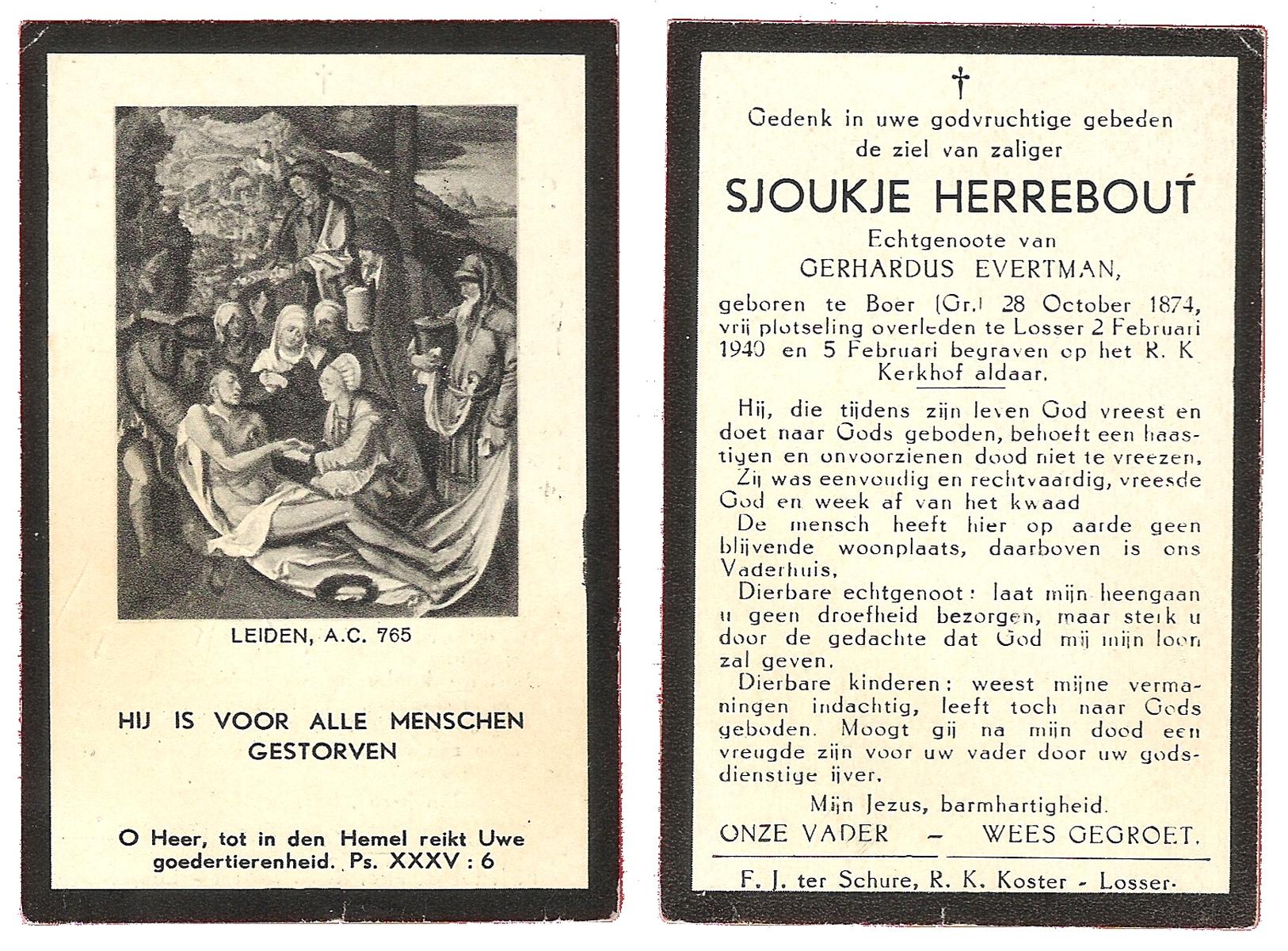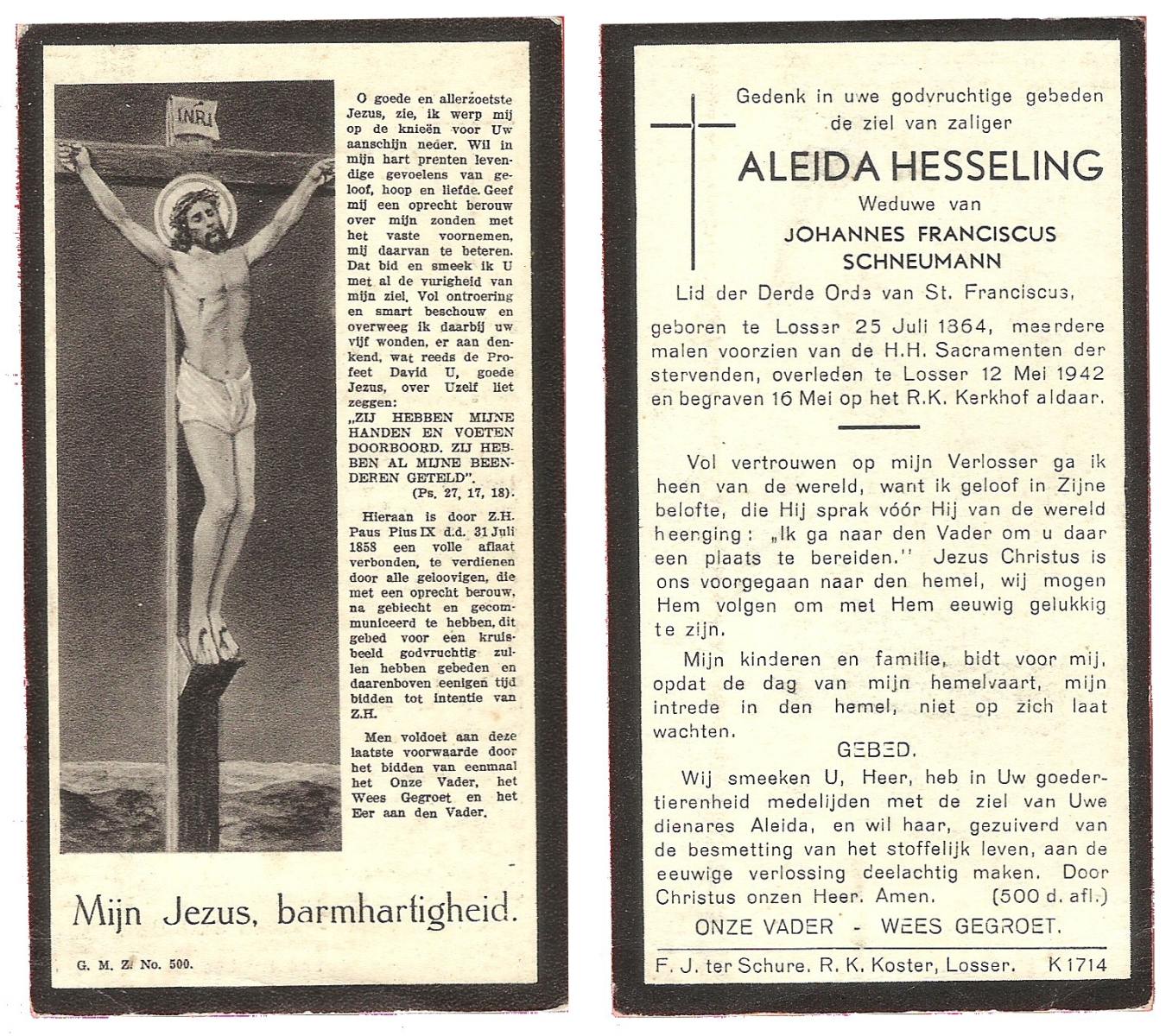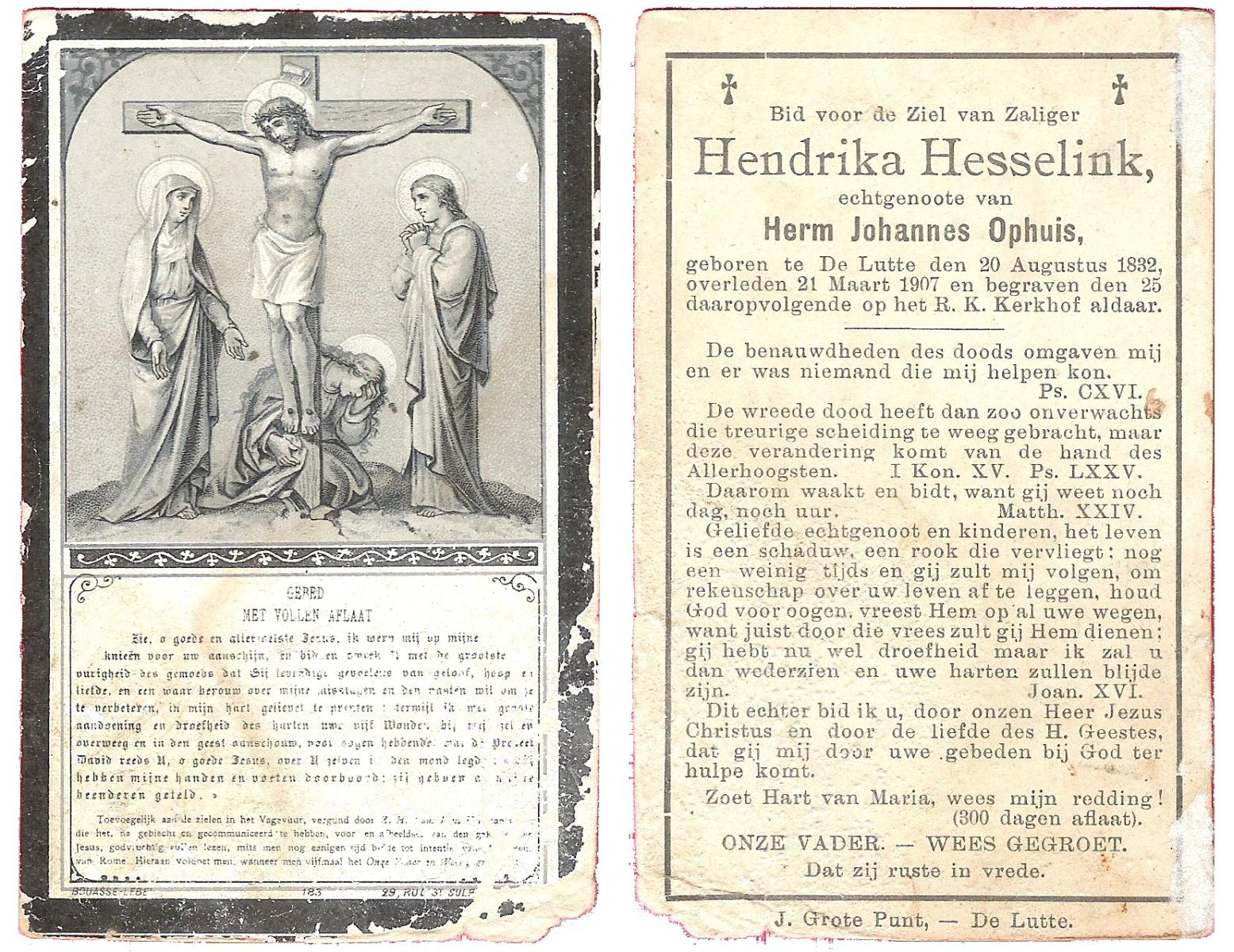 HEIDEMAN, Hendrika, geboren op 21-06-1869 te Losser, overleden op 23-4-1947 te Losser op 77-jarige leeftijd, begraven op 26-4-1947 te Losser.