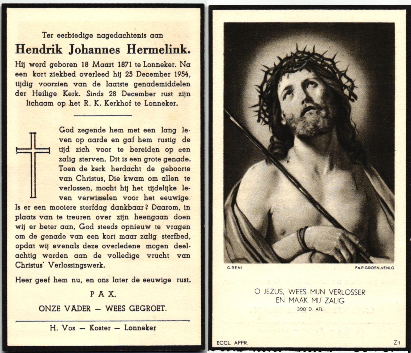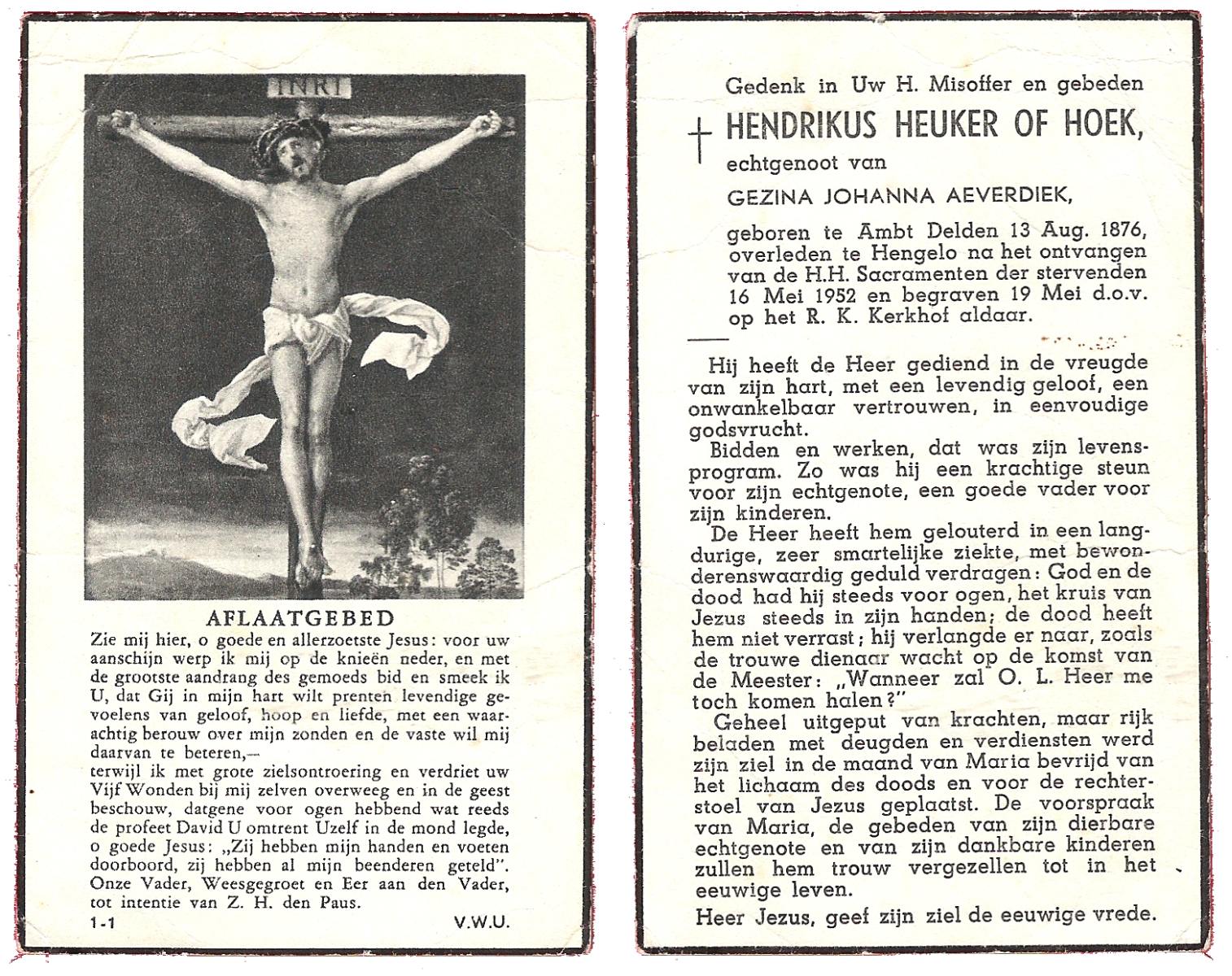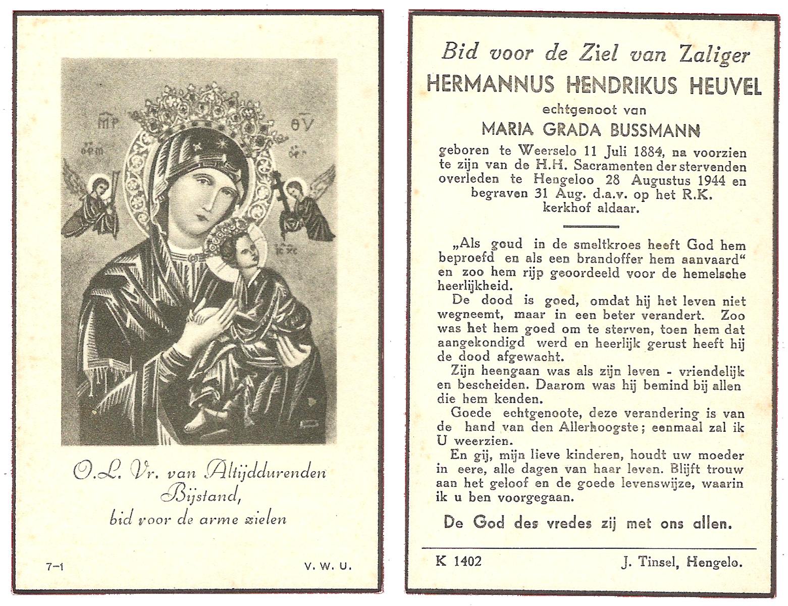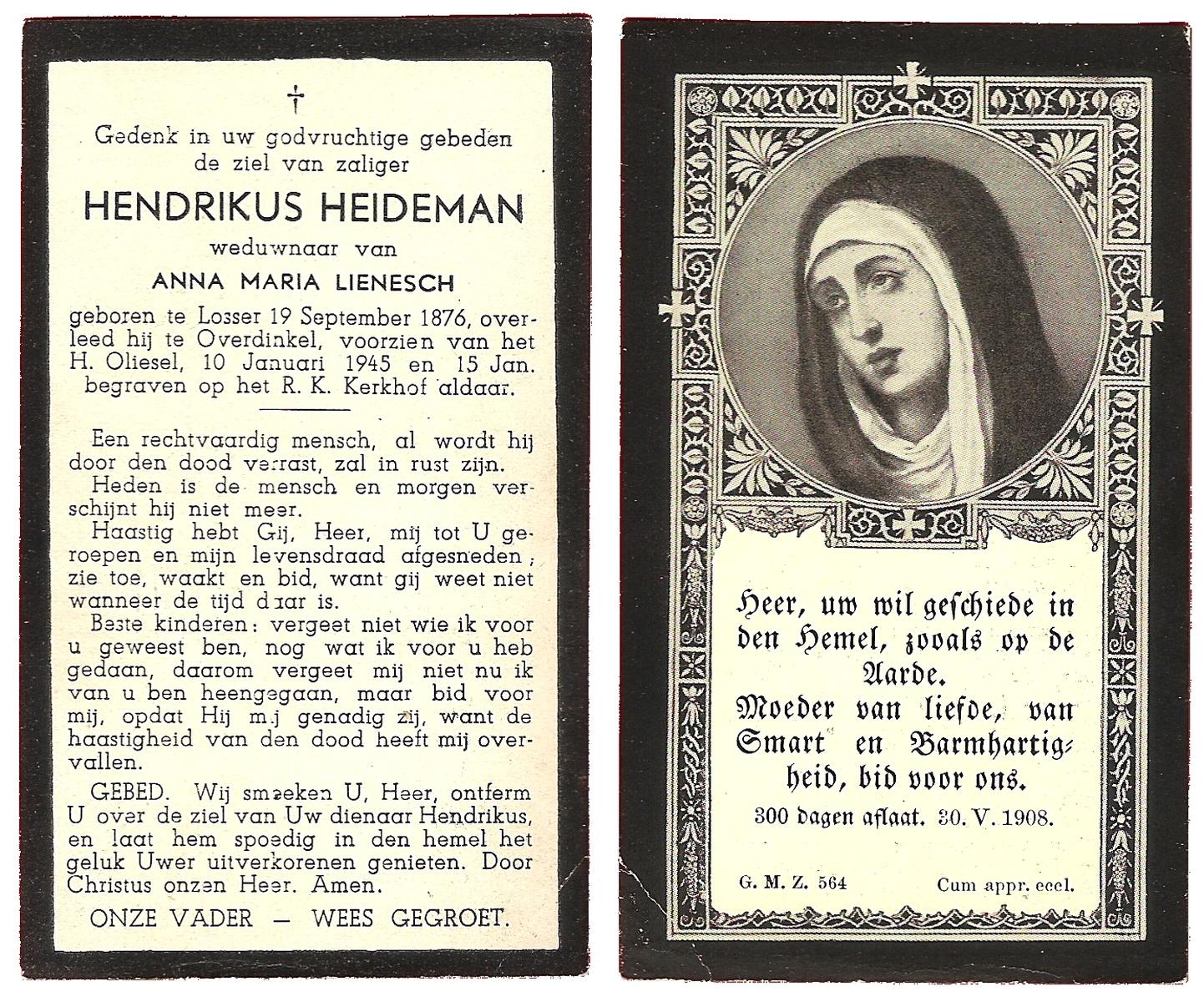 HEIDEMAN, Hendrikus, geboren op 19-09-1876 te Losser, overleden op 10-1-1945 te Overdinkel op 68-jarige leeftijd, begraven op 15-1-1945 te Overdinkel.
