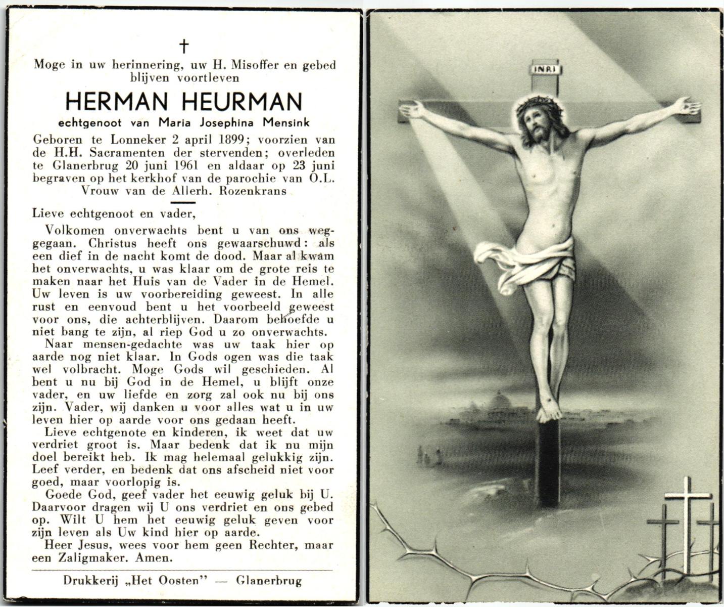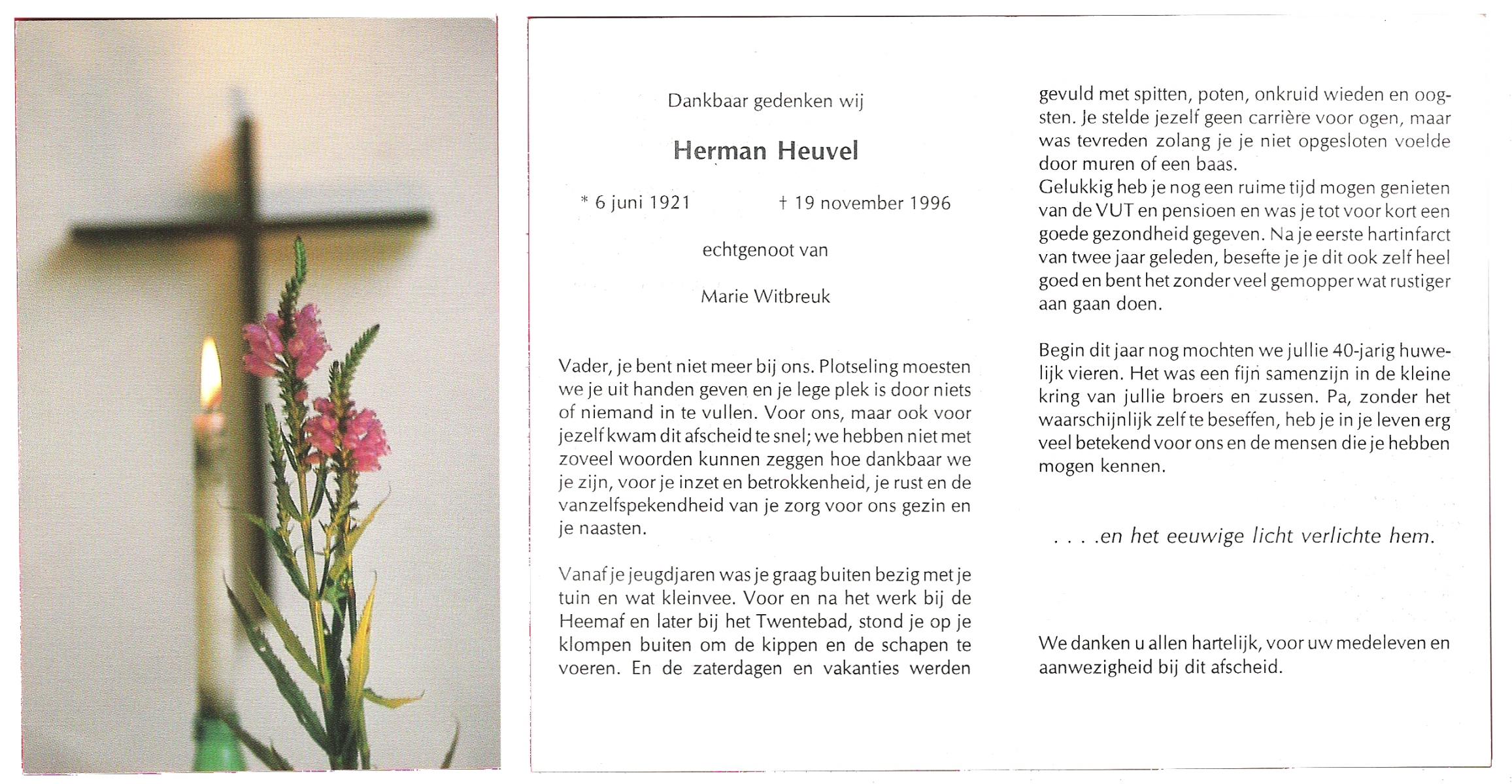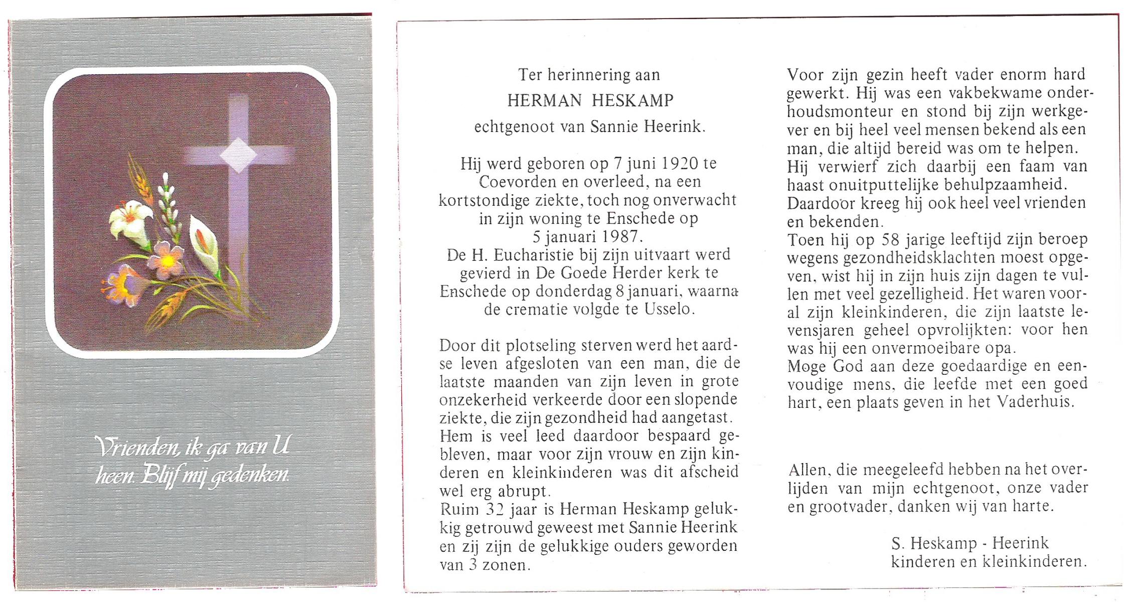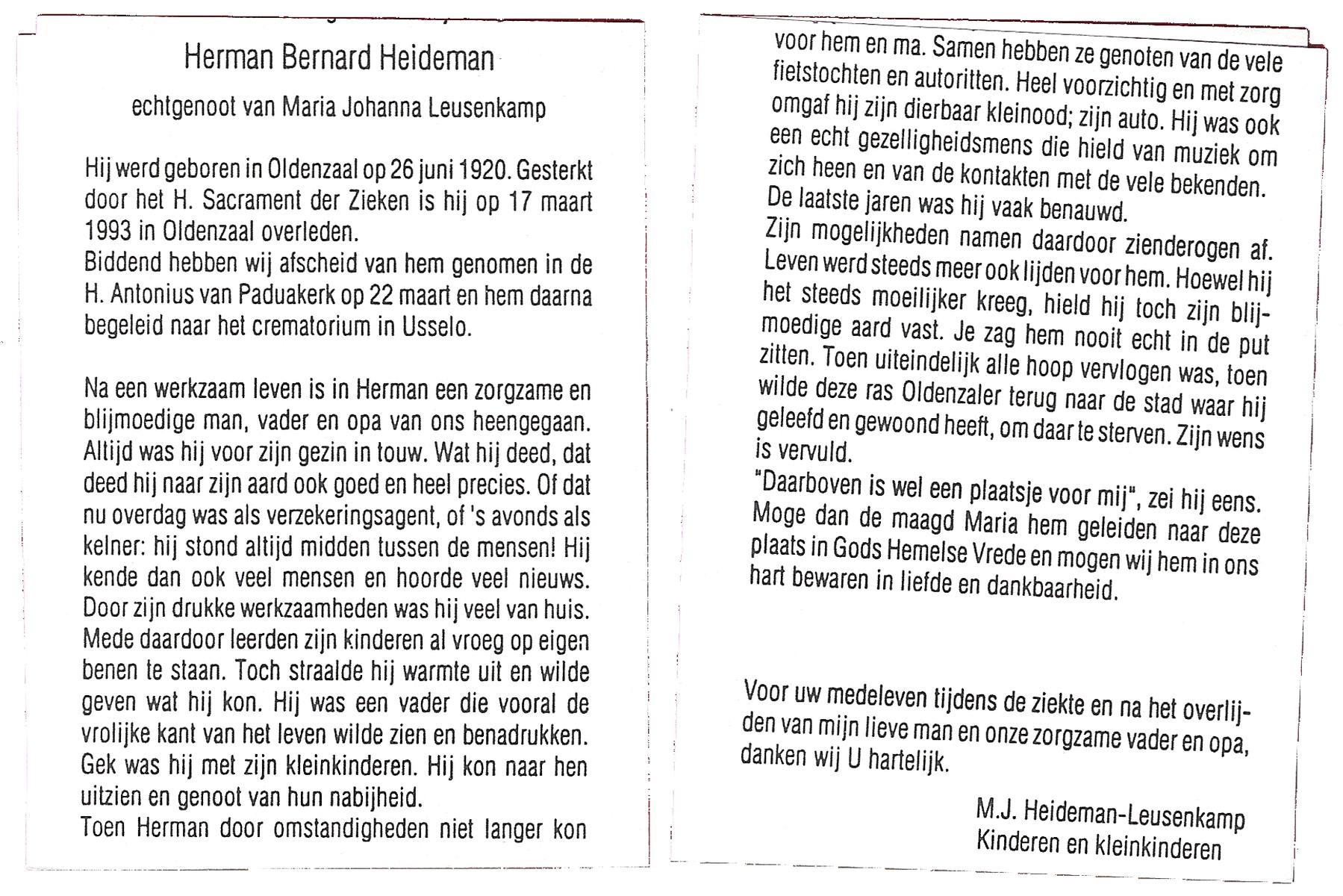HEIDEMAN, Herman Bernard, geboren op 26-6-1920 te Oldenzaal, overleden op 17-3-1993 te Oldenzaal op 72-jarige leeftijd, gecremeerd op 22-3-1993 te Usselo.