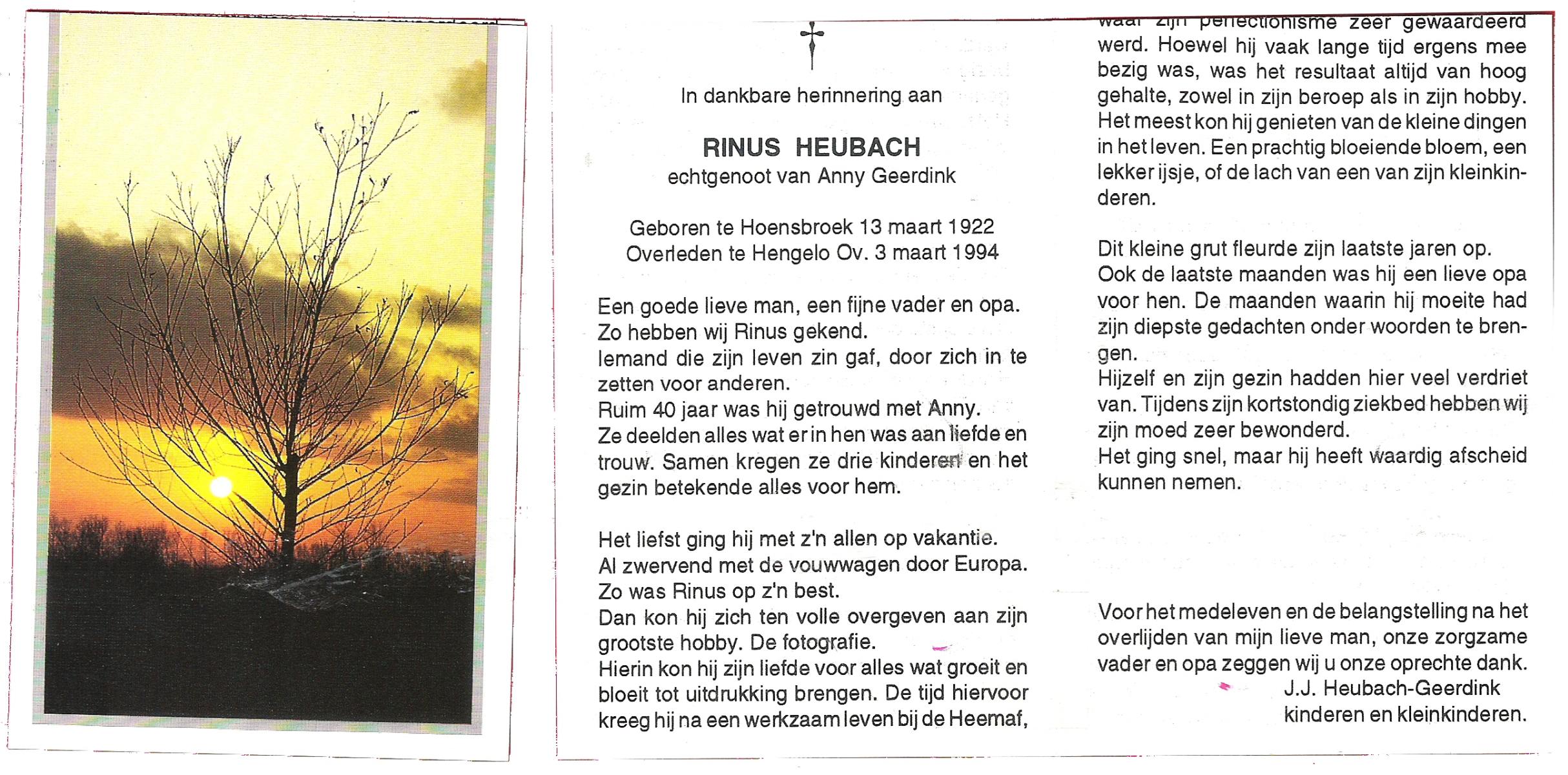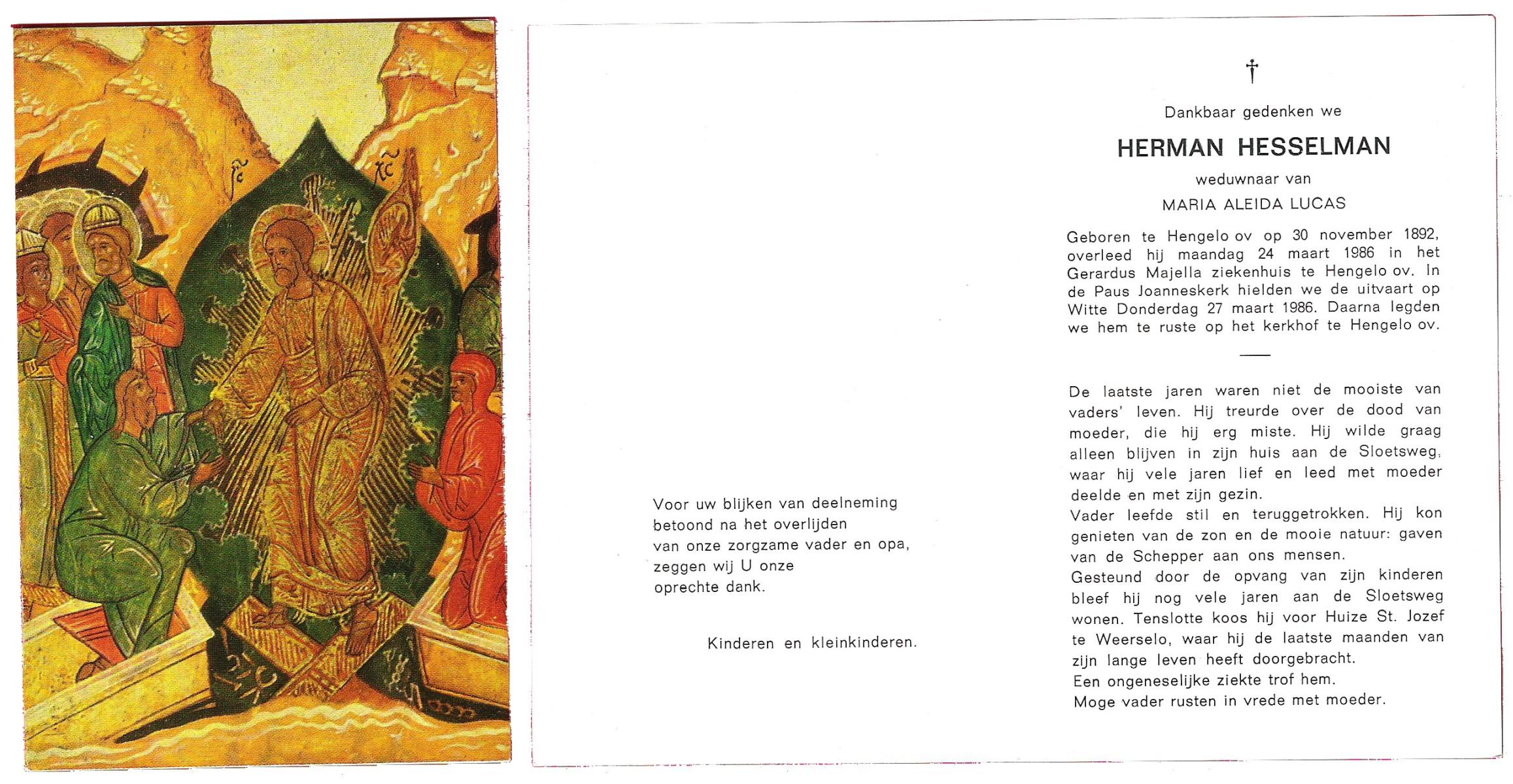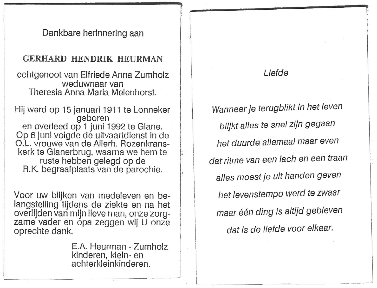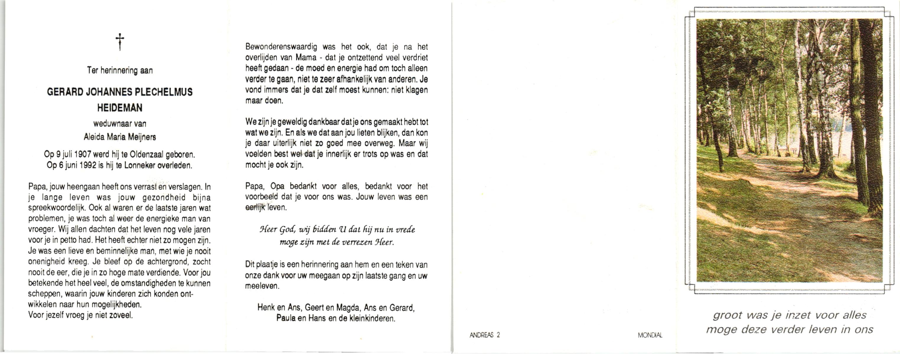 HEIDEMAN, Herman Bernard, geboren op 26-6-1920 te Oldenzaal, overleden op 17-3-1993 te Oldenzaal op 72-jarige leeftijd, gecremeerd op 22-3-1993 te Usselo.