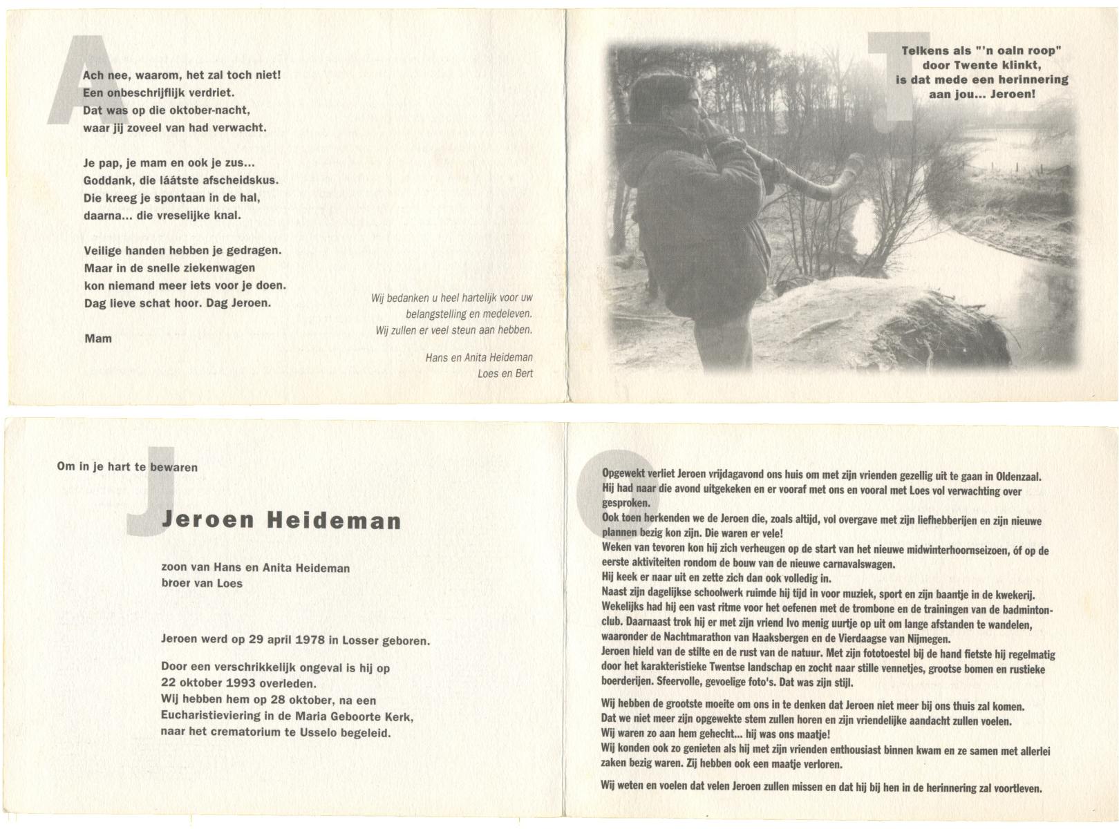 HEIDEMAN, Jeroen, geboren op 29-4-1978 te Losser, overleden op 22-10-1993 op 15-jarige leeftijd, gecremeerd op 28-10-1993 te Usselo.