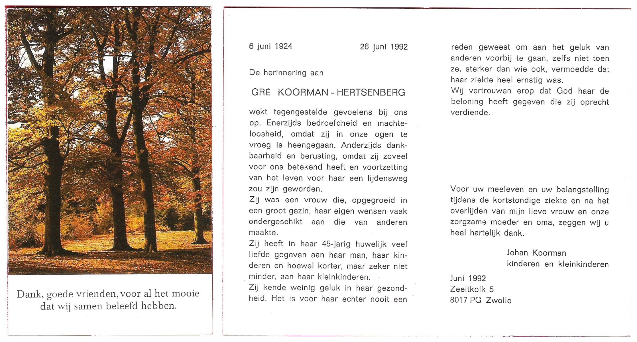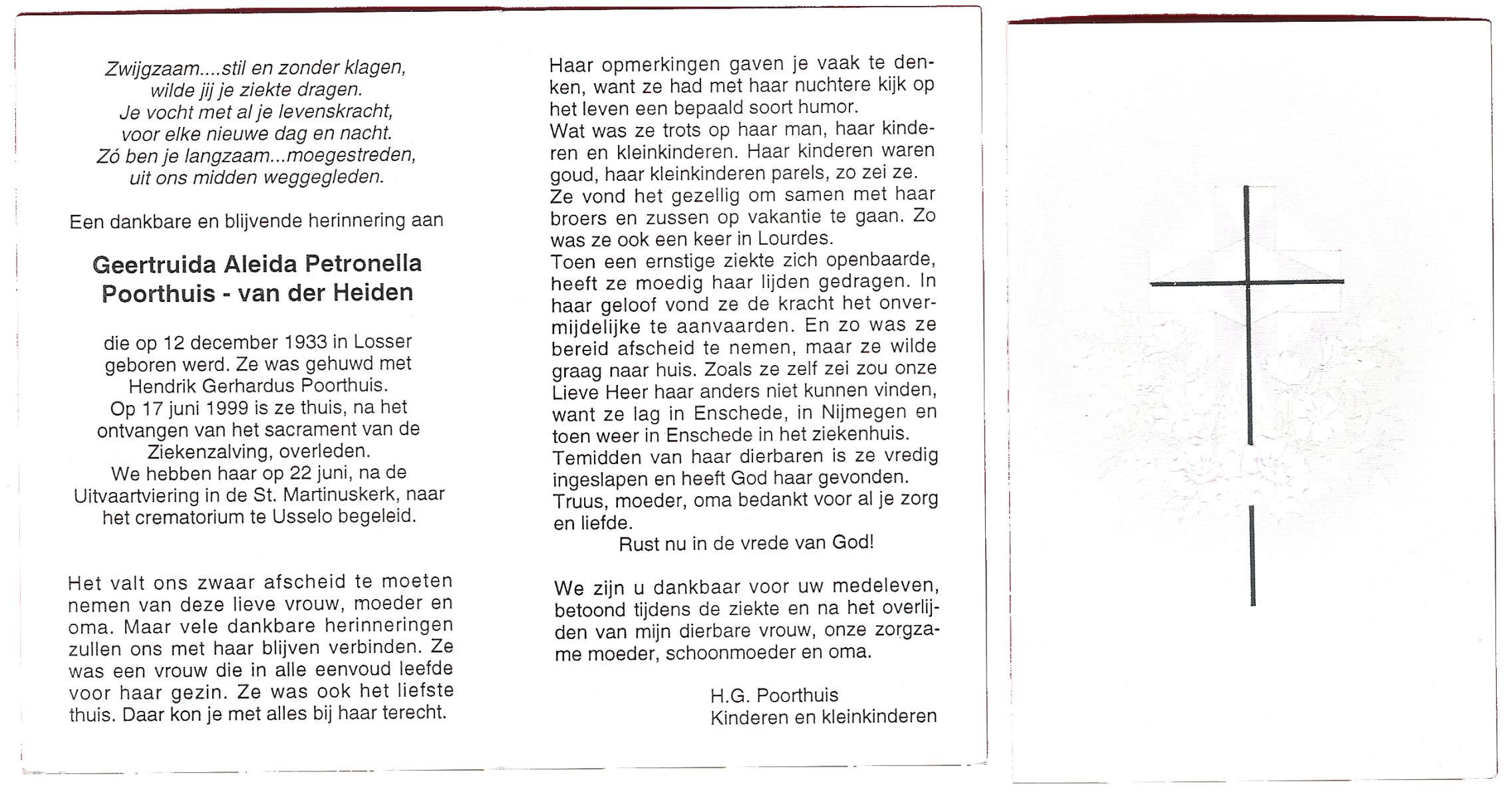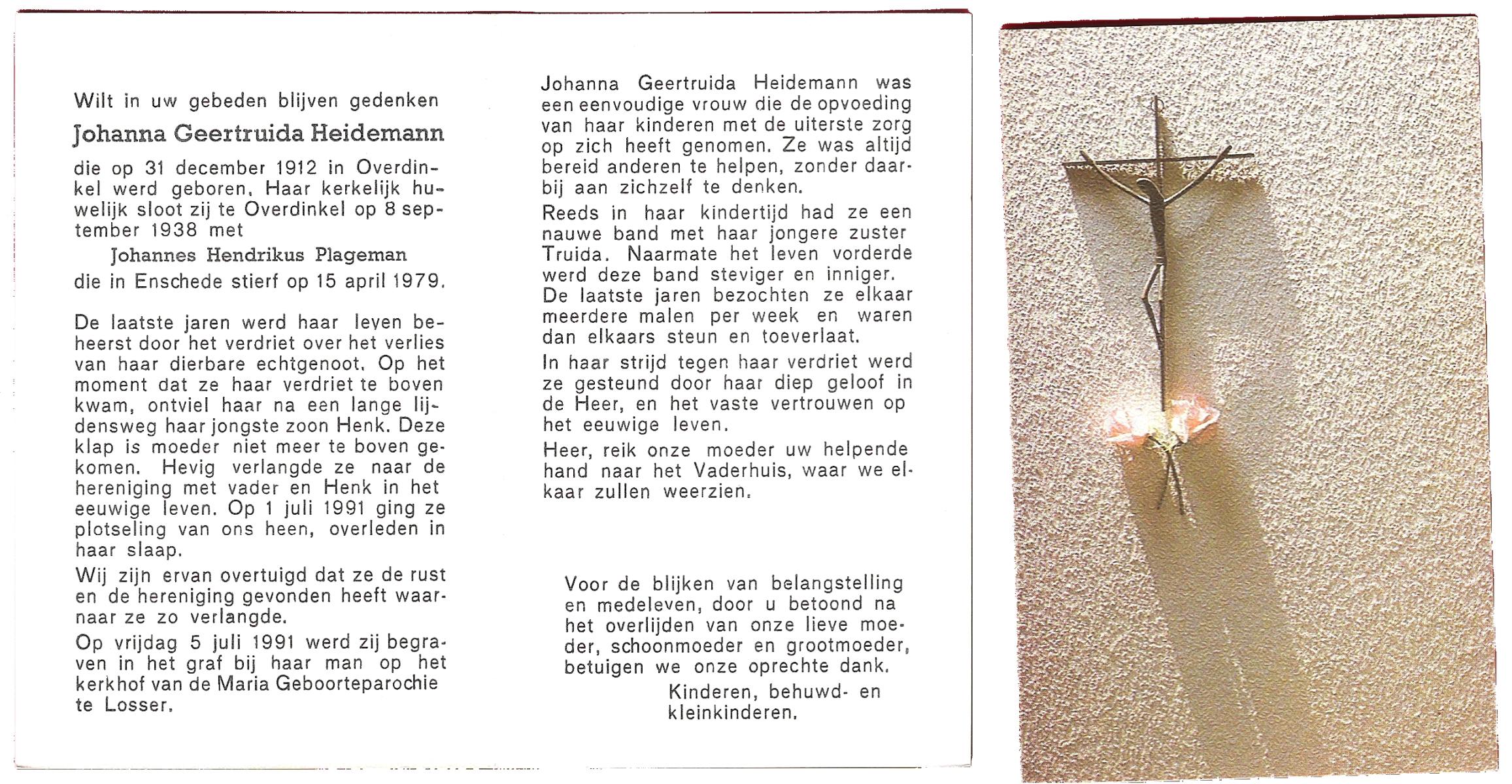 HEIDEMANN, Johanna Geertruida, geboren op 31-12-1912 te Overdinkel, overleden op 1-7-1991 op 78-jarige leeftijd, begraven op 5-7-1991 te Losser.
