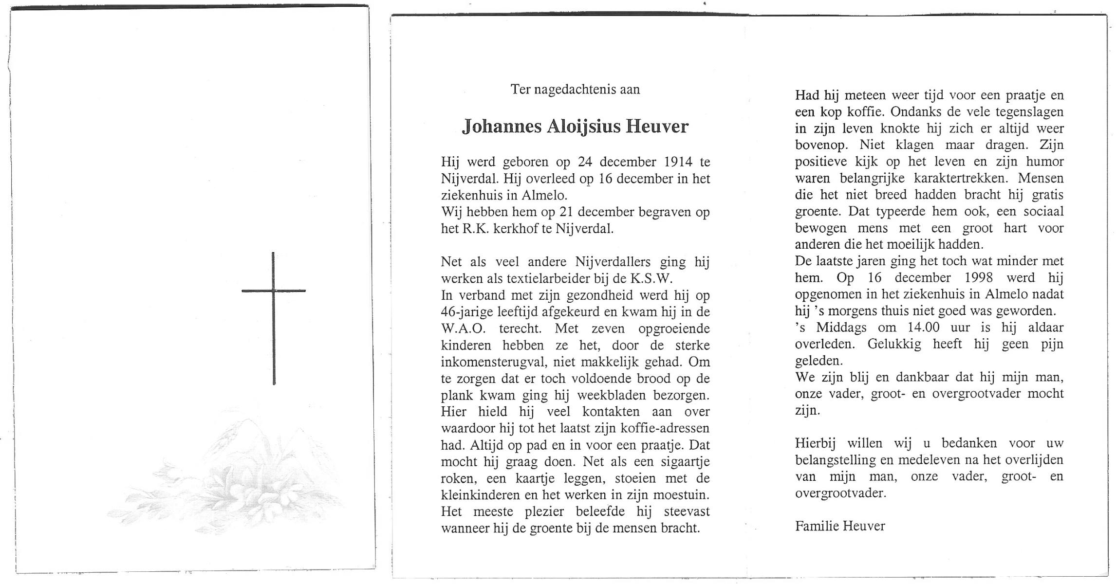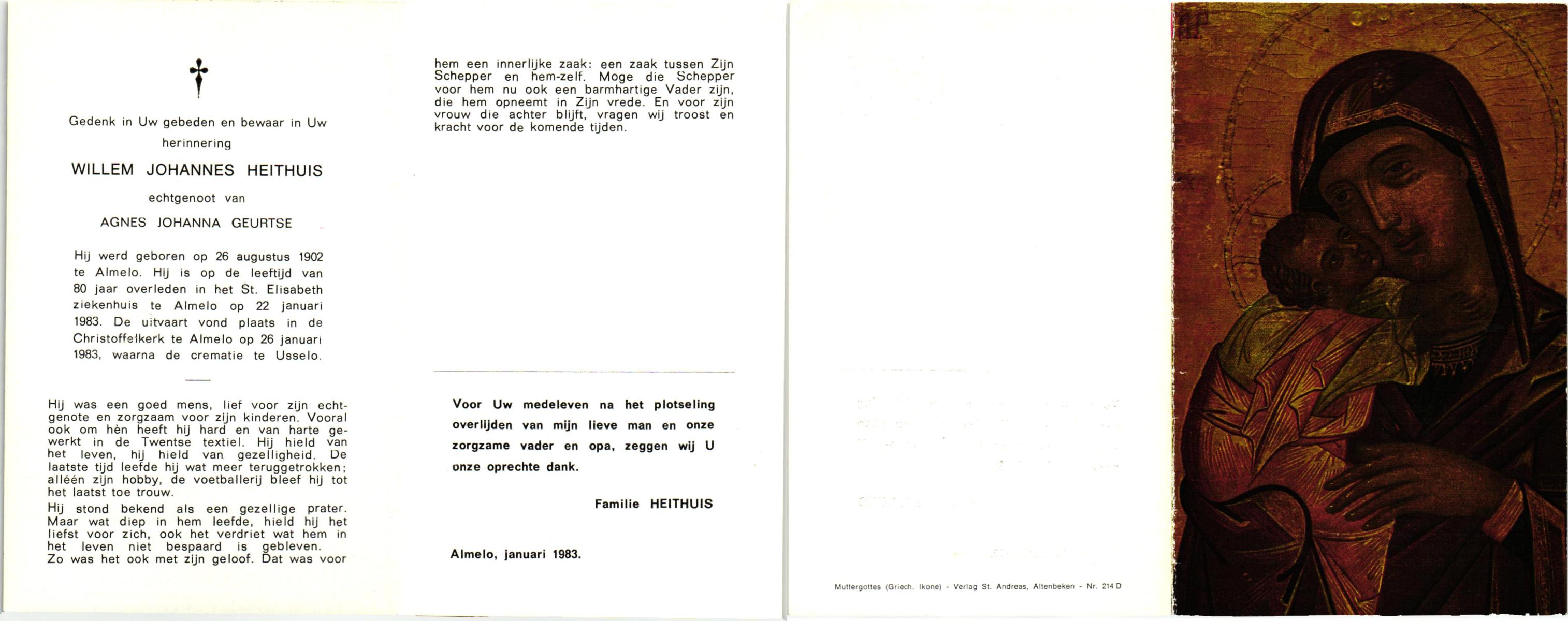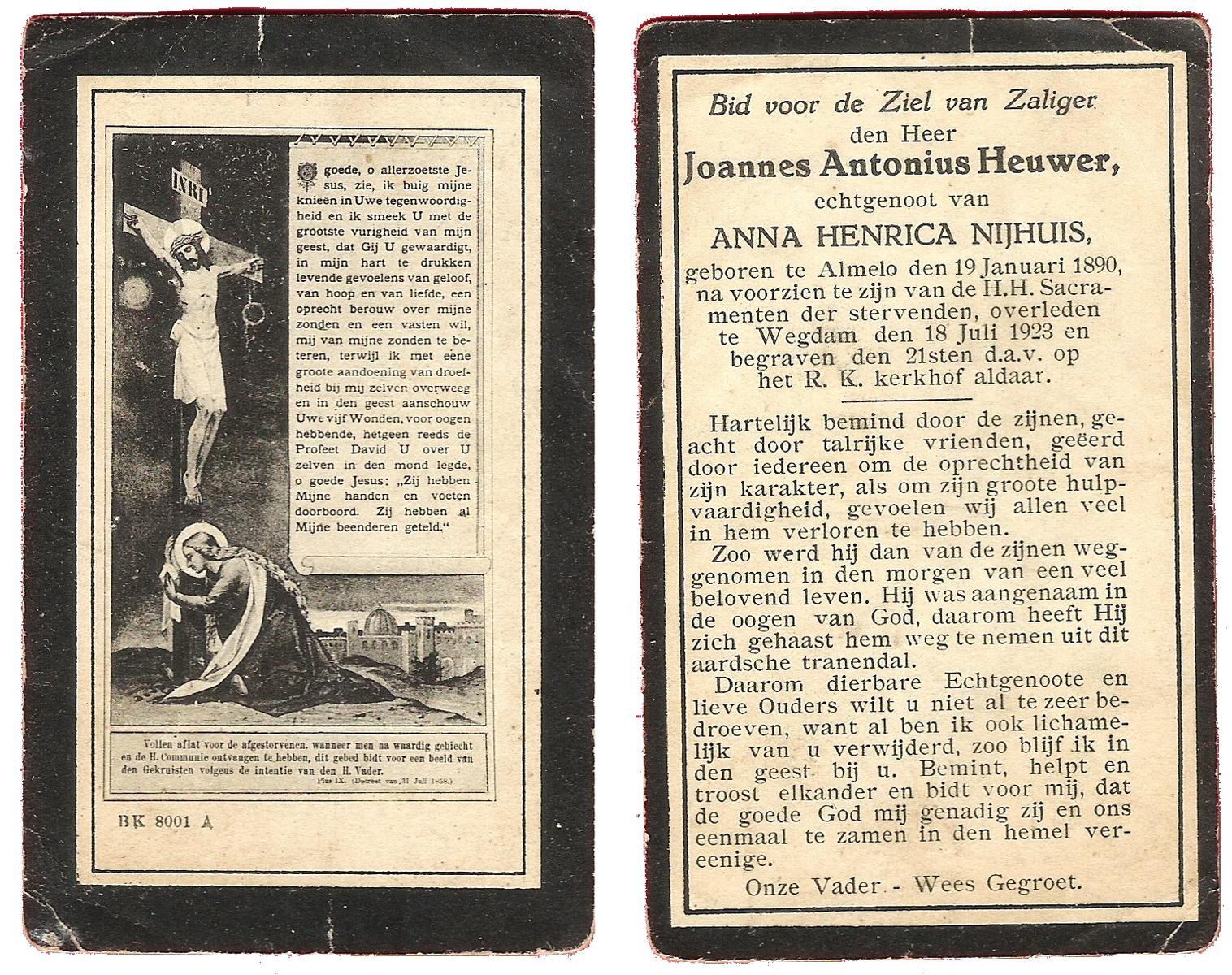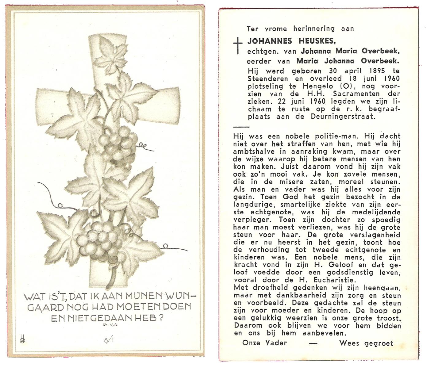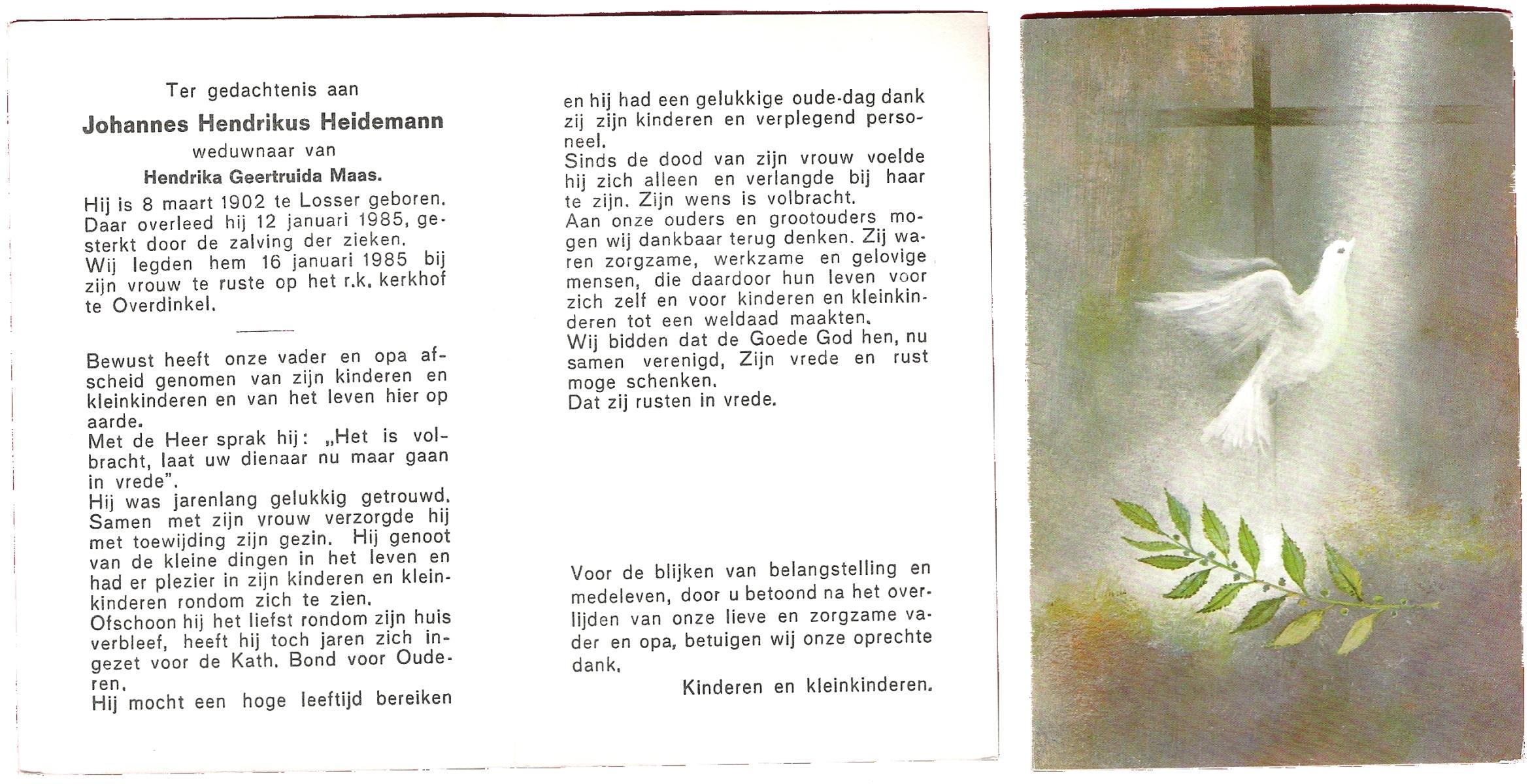 HEIDEMANN, Johannes Hendrikus, geboren op 8-3-1902 te Losser, overleden op 12-1-1985 te Losser op 82-jarige leeftijd, begraven op 16-1-1985 te Overdinkel.