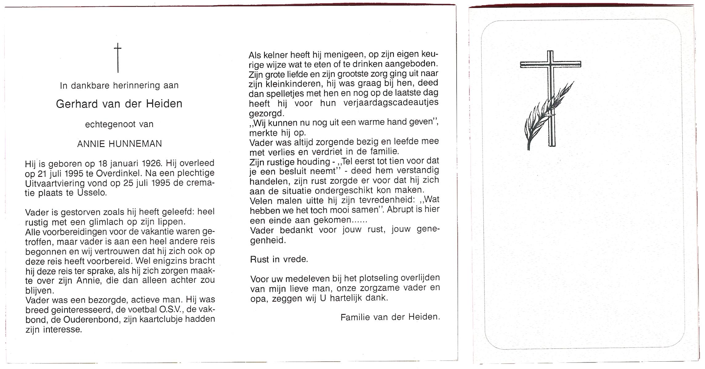 HEIDEN, van der, Gerhard, geboren op 18-1-1926, overleden op 21-7-1995 te Overdinkel op 69-jarige leeftijd, gecremeerd op 25-7-1995 te Usselo.