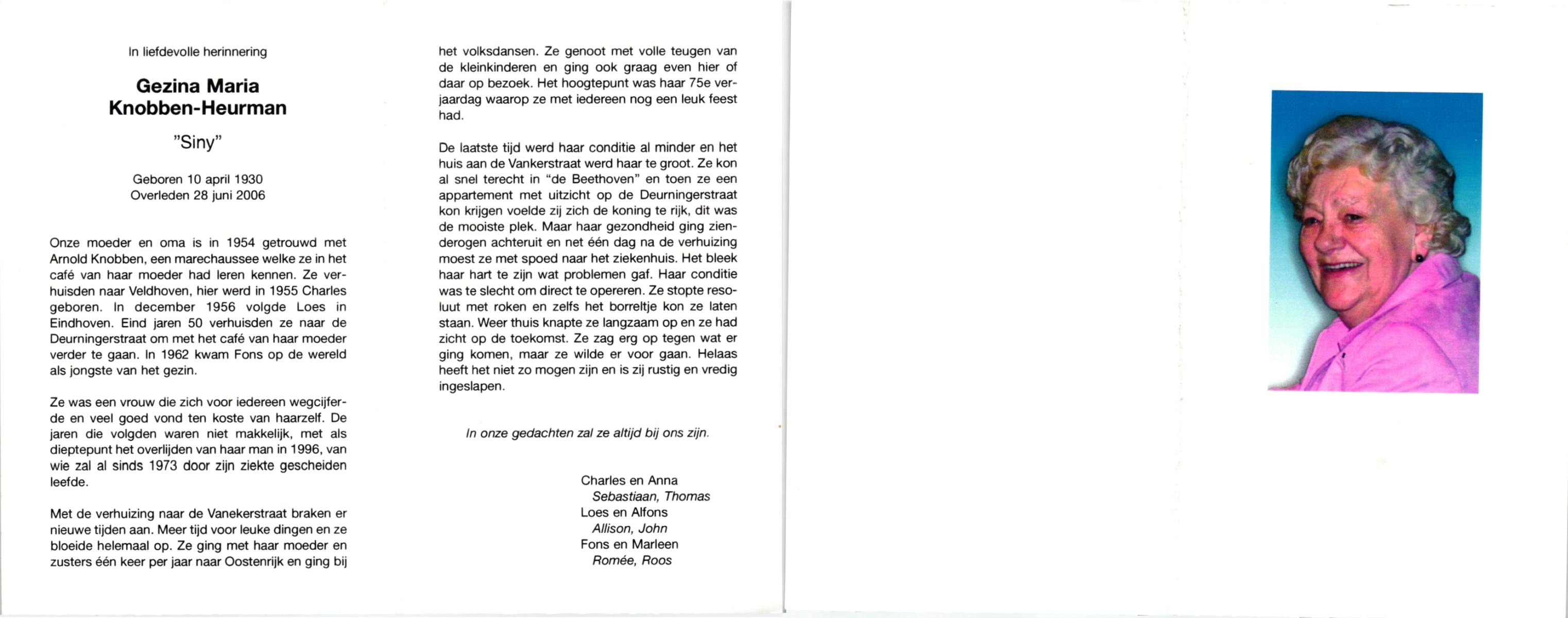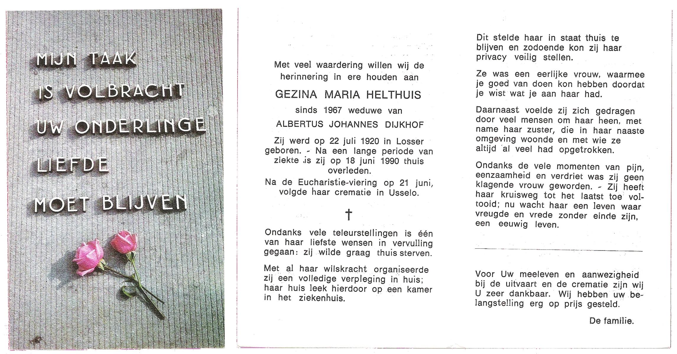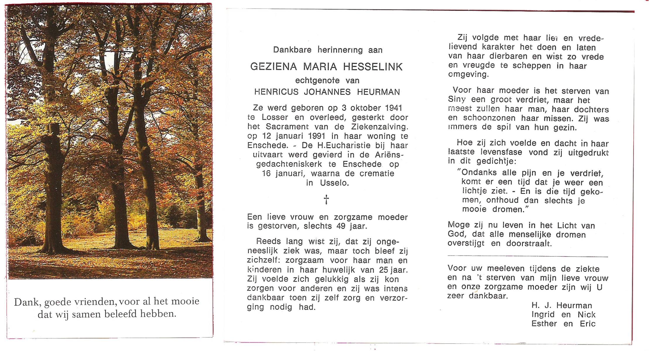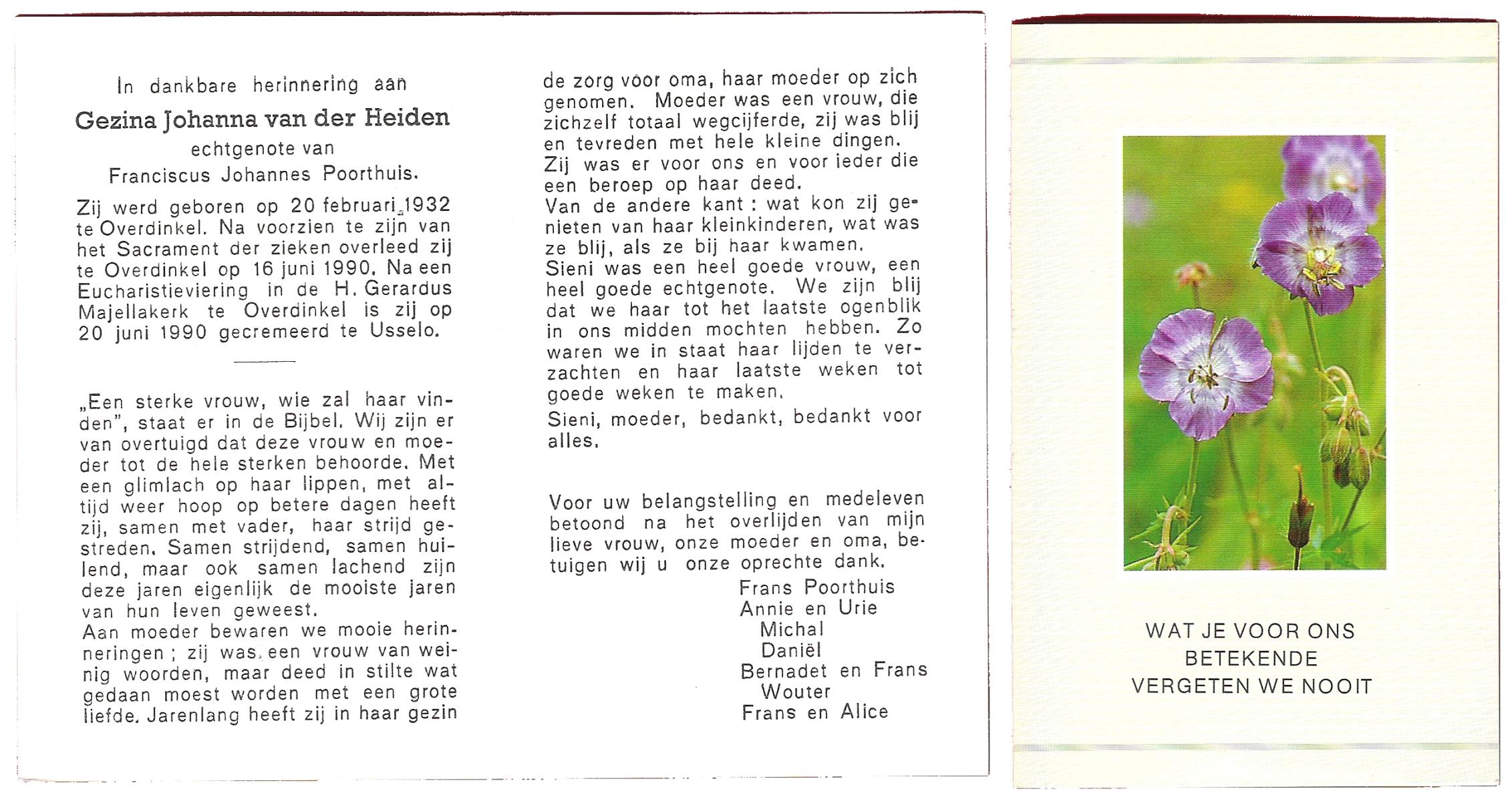 HEIDEN, van der, Gezina Johanna, geboren op 20-2-1932 te Overdinkel, overleden op 16-6-1990 te Overdinkel op 58-jarige leeftijd, gecremeerd op 20-6-1990 te Usselo.