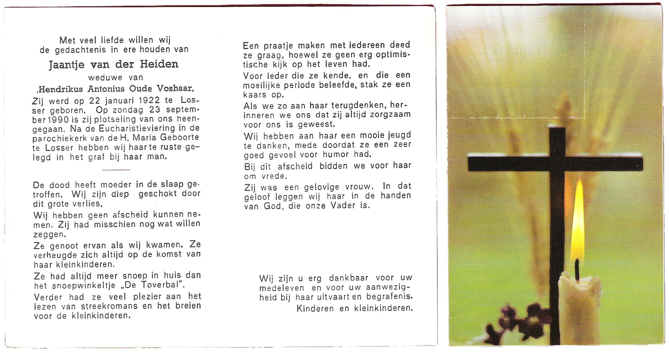 HEIDEN, van der, Jaantje, geboren op 22-1-1922 te Losser, overleden op 23-9-1990 op 68-jarige leeftijd, begraven te Losser.