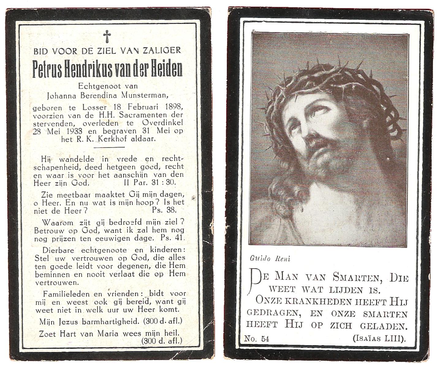 HEIDEN, van der, Petrus Hendrikus, geboren op 18-02-1898 te Losser, overleden op 28-5-1933 te Overdinkel op 35-jarige leeftijd, begraven op 31-5-1933 te Overdinkel.