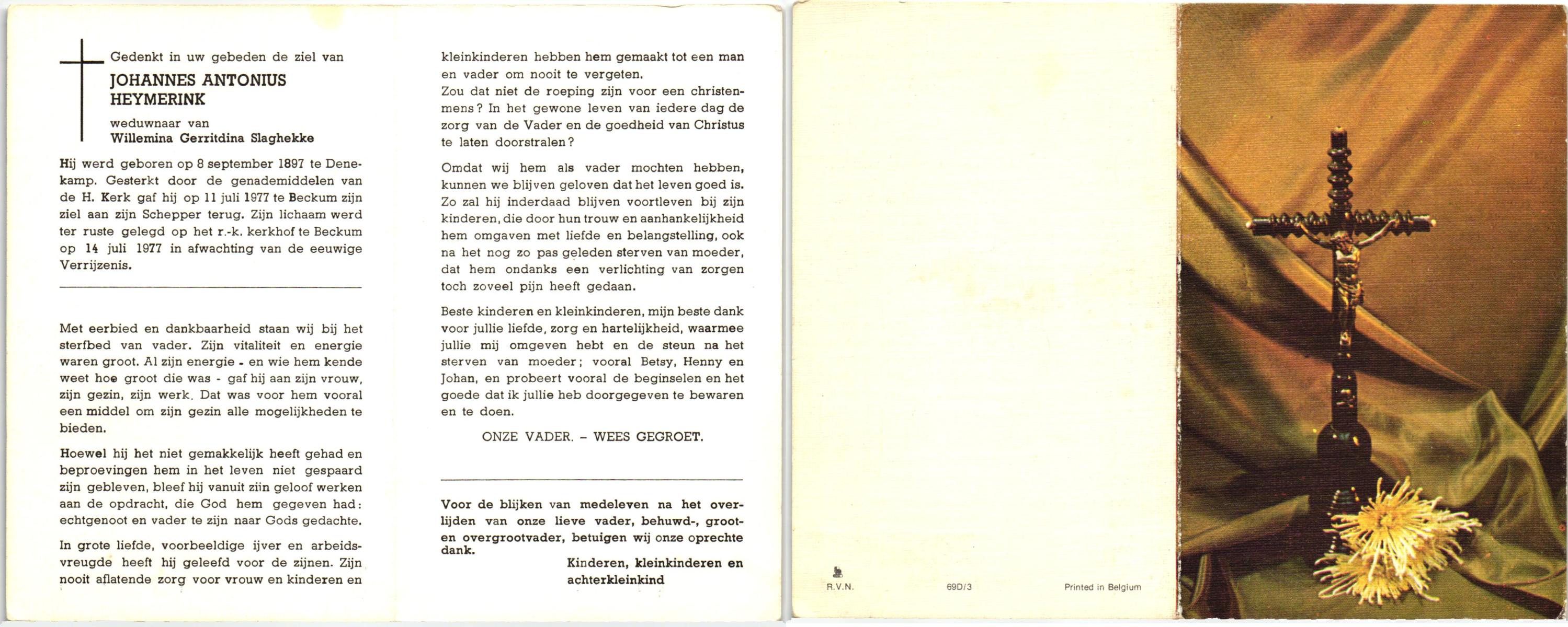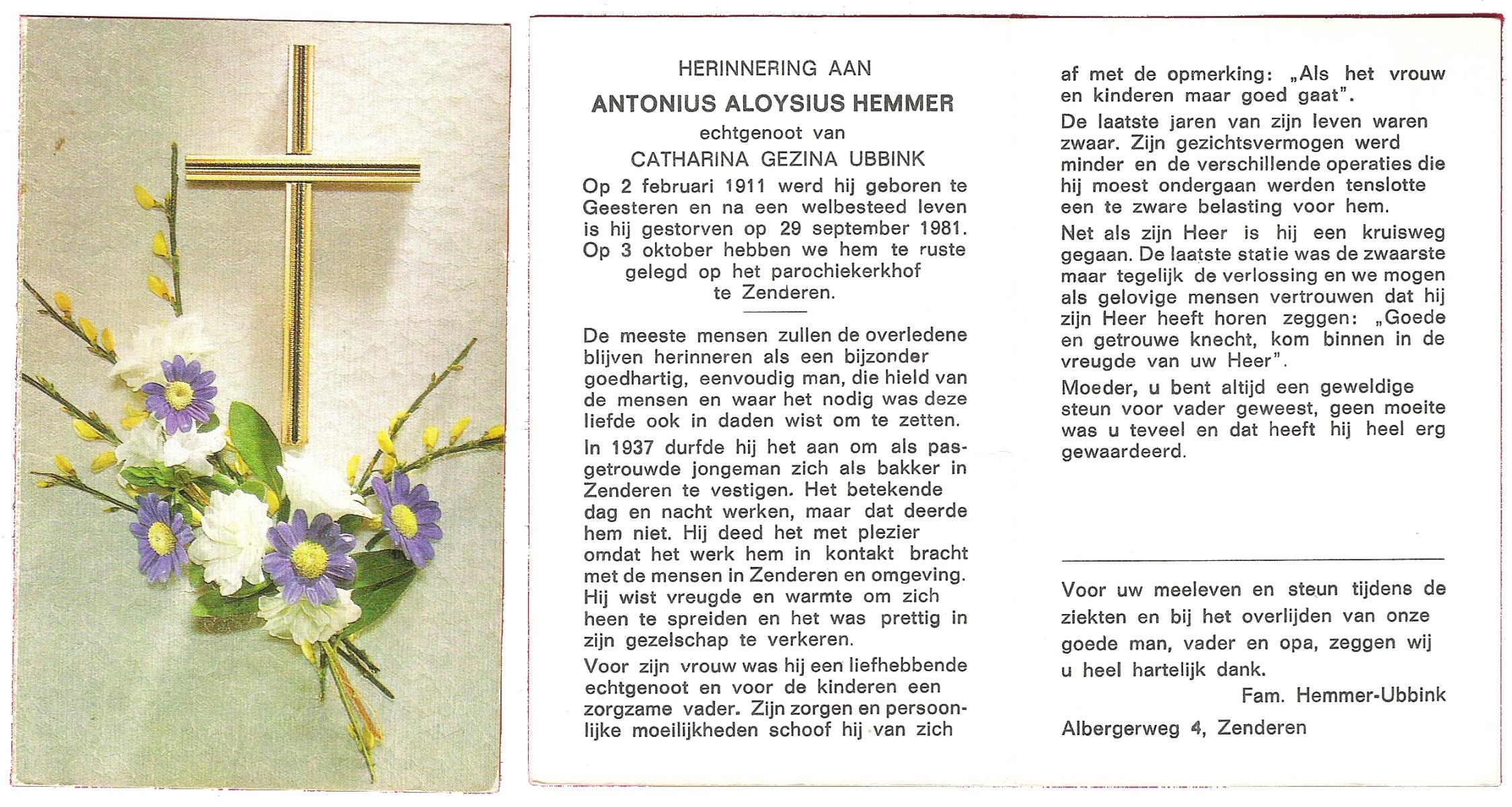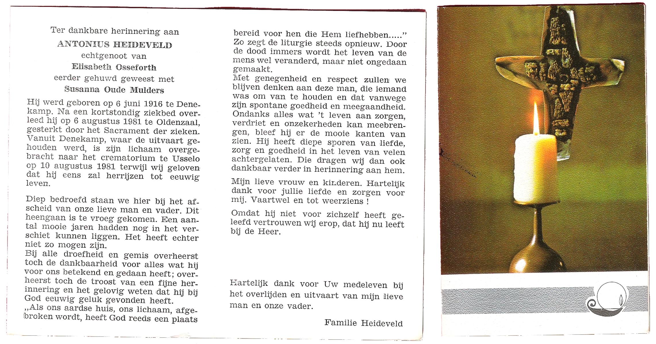 HEIDEVELD, Antonius, geboren op 6-6-1916 te Denekamp, overleden op 6-8-1981 te Oldenzaal op 65-jarige leeftijd, gecremeerd op 10-8-1981 te Usselo.