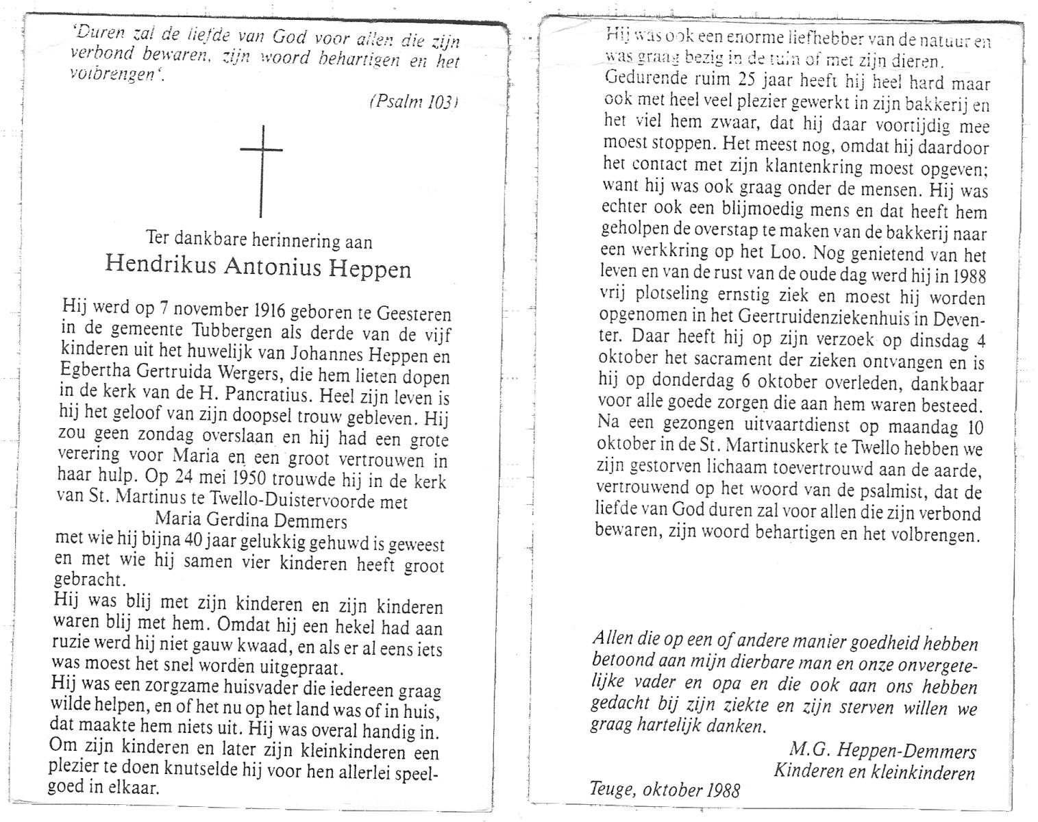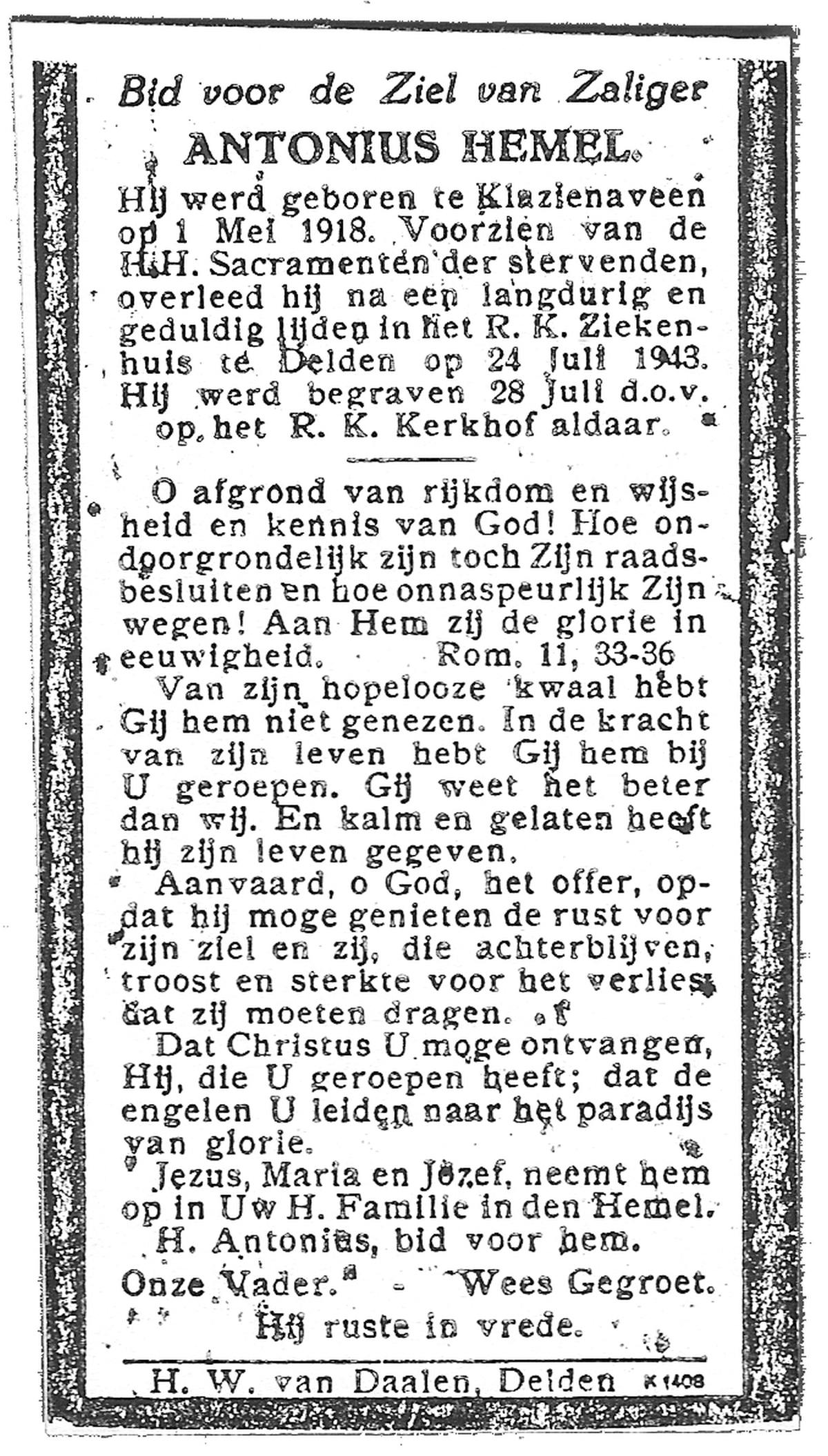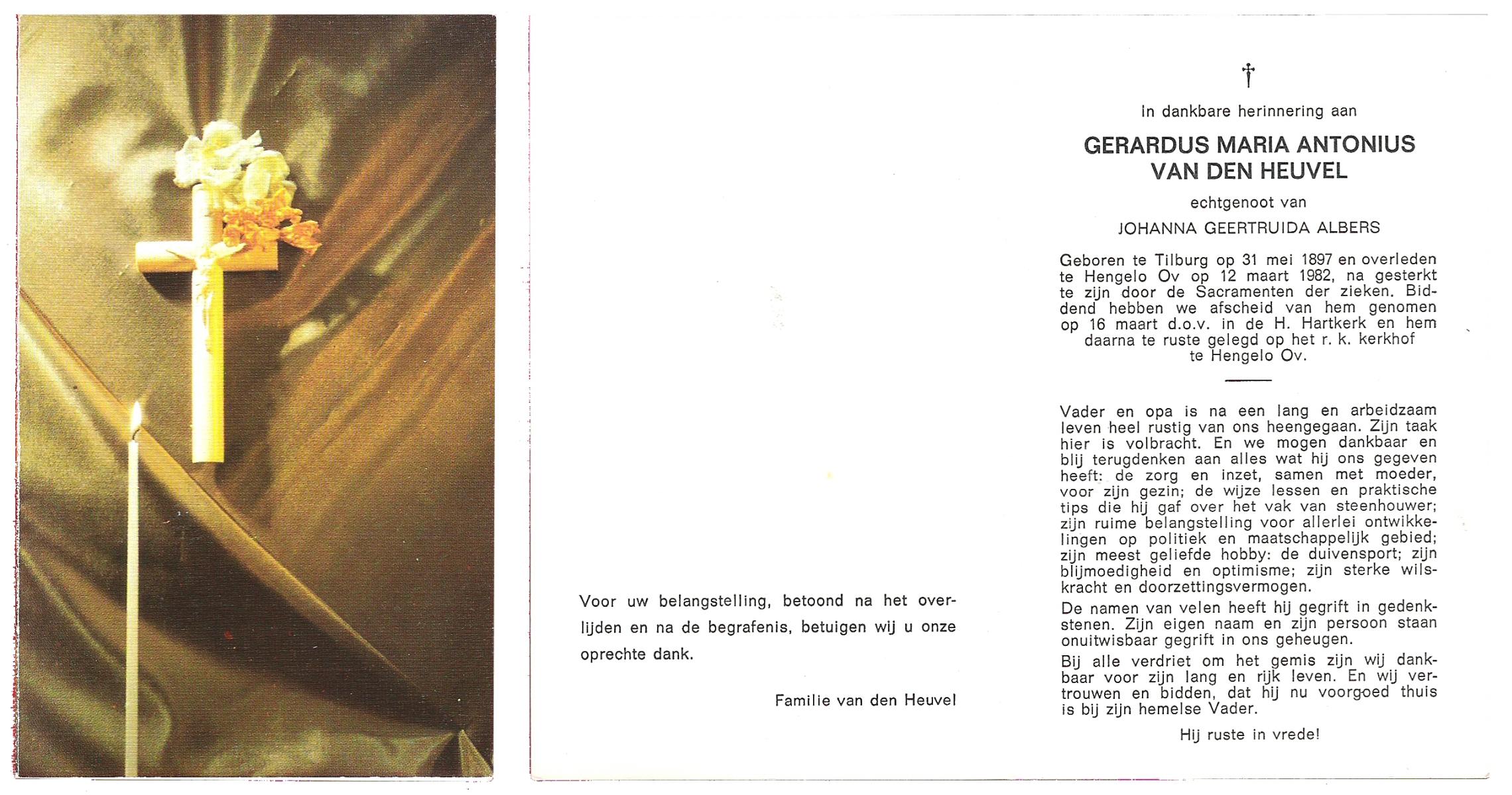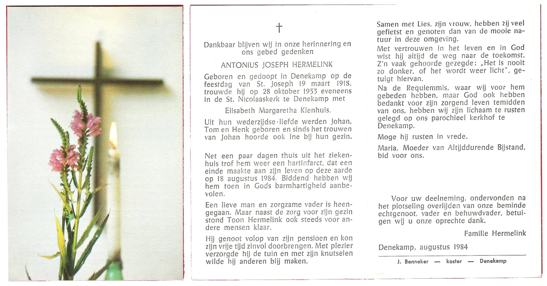 HEIDEVELD, Antonius, geboren op 6-6-1916 te Denekamp, overleden op 6-8-1981 te Oldenzaal op 65-jarige leeftijd, gecremeerd op 10-8-1981 te Usselo.