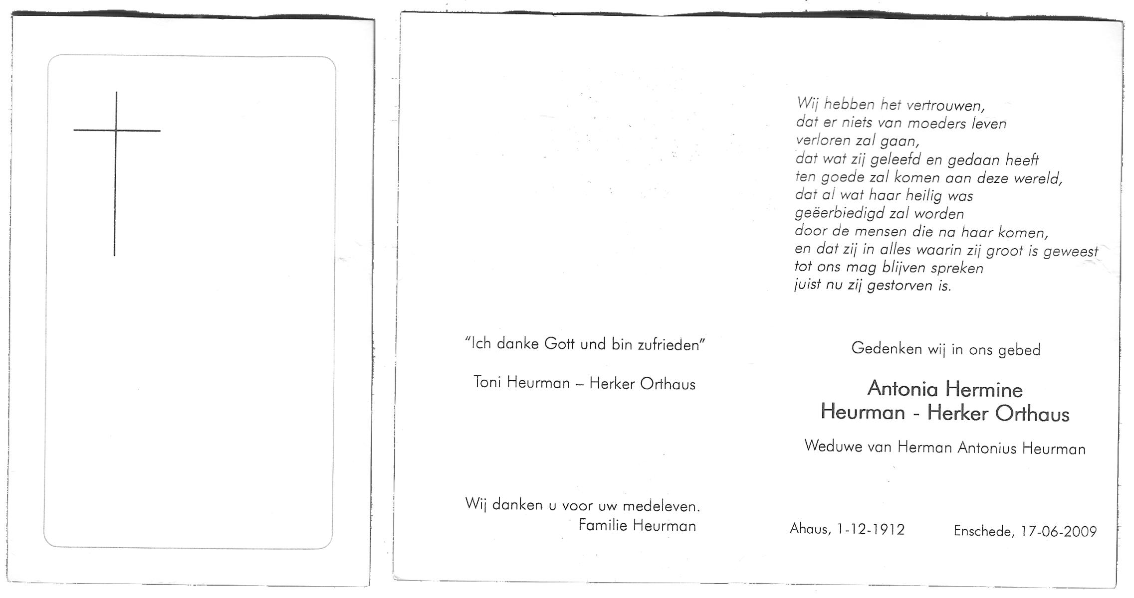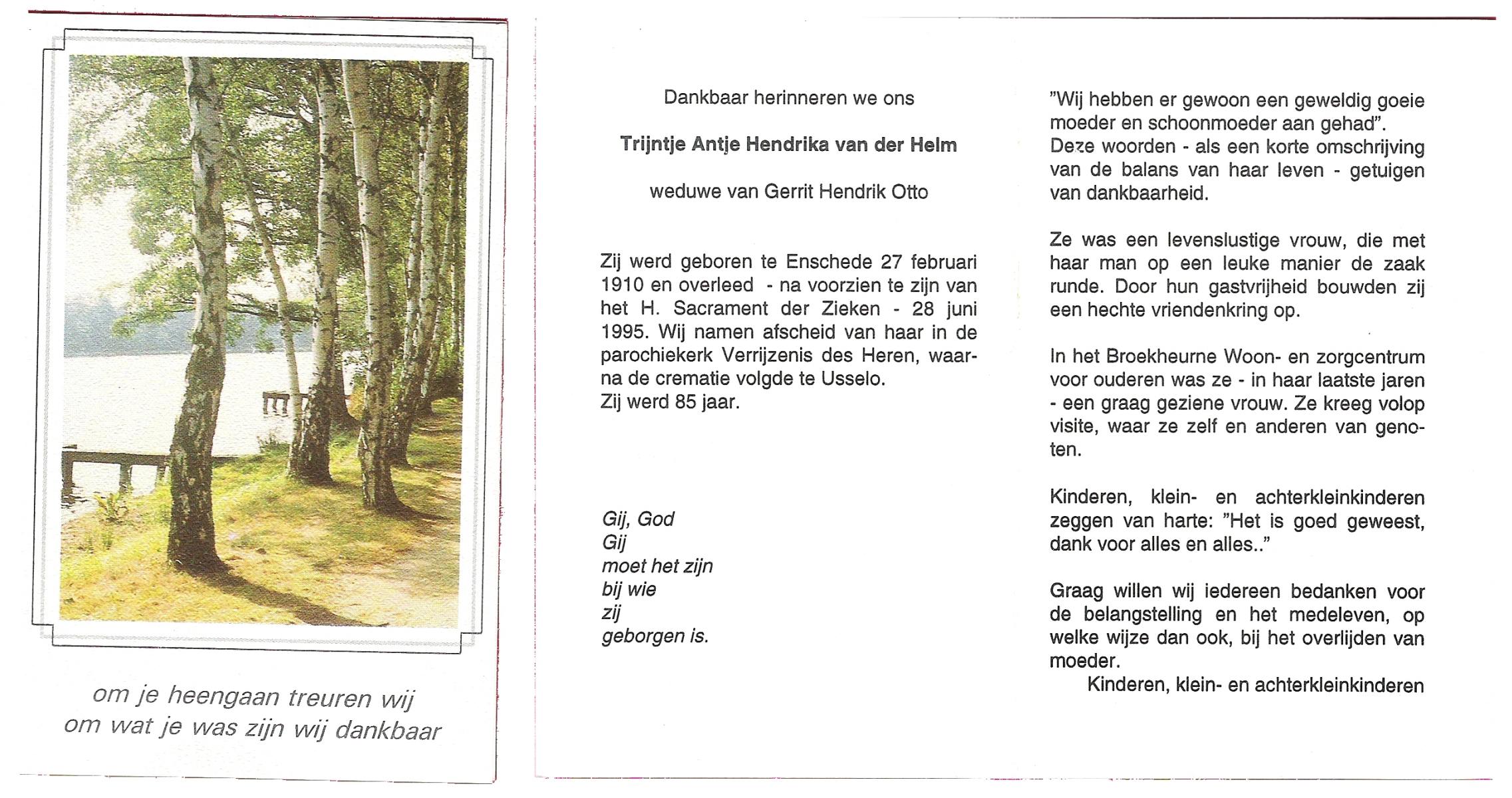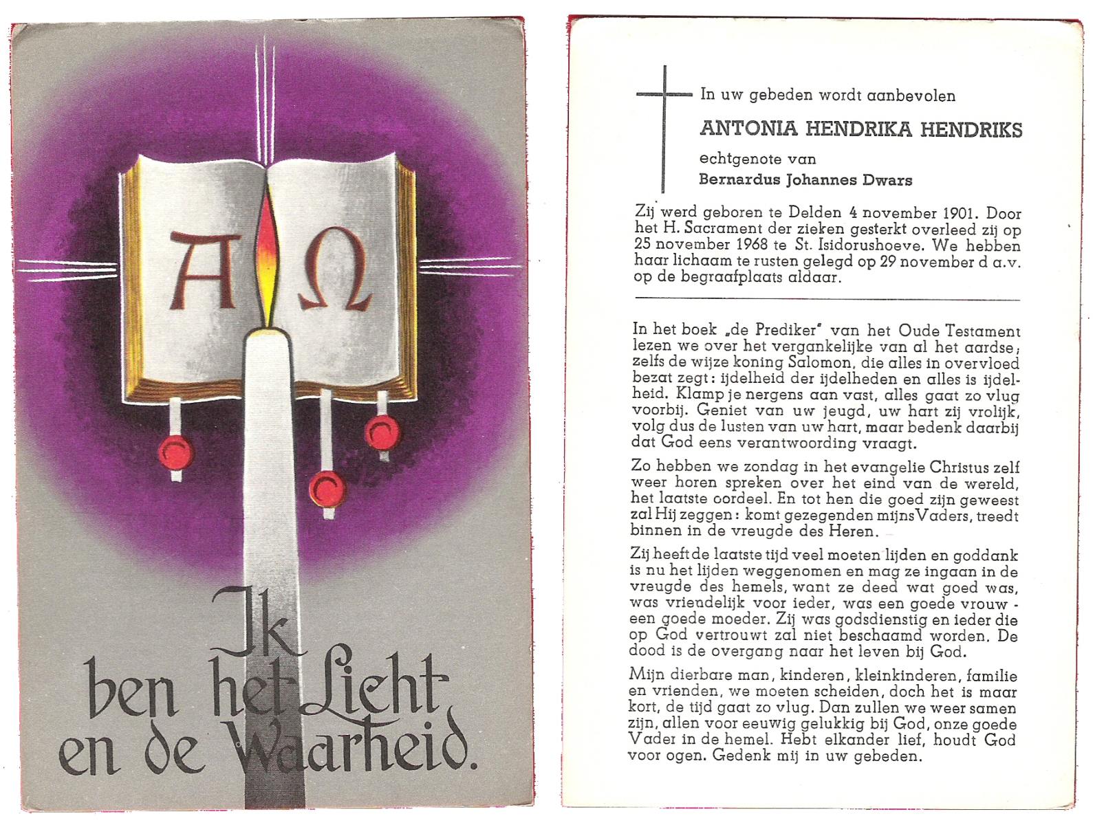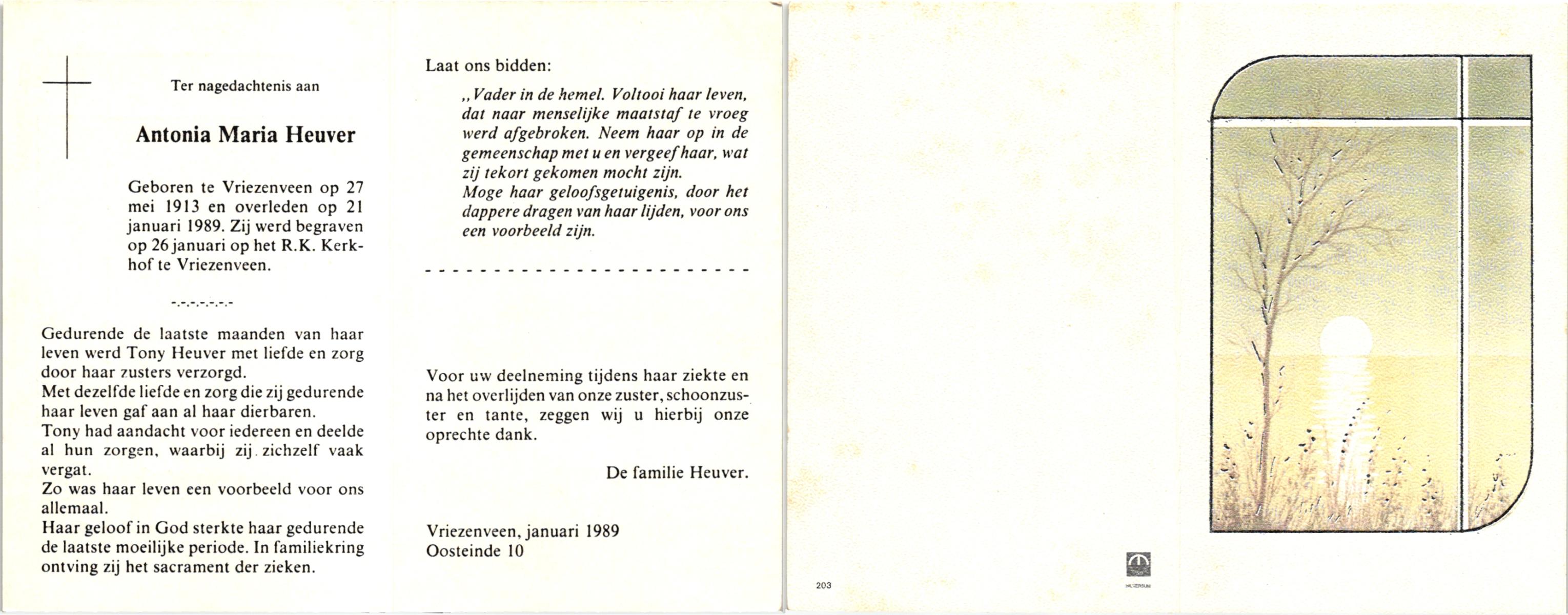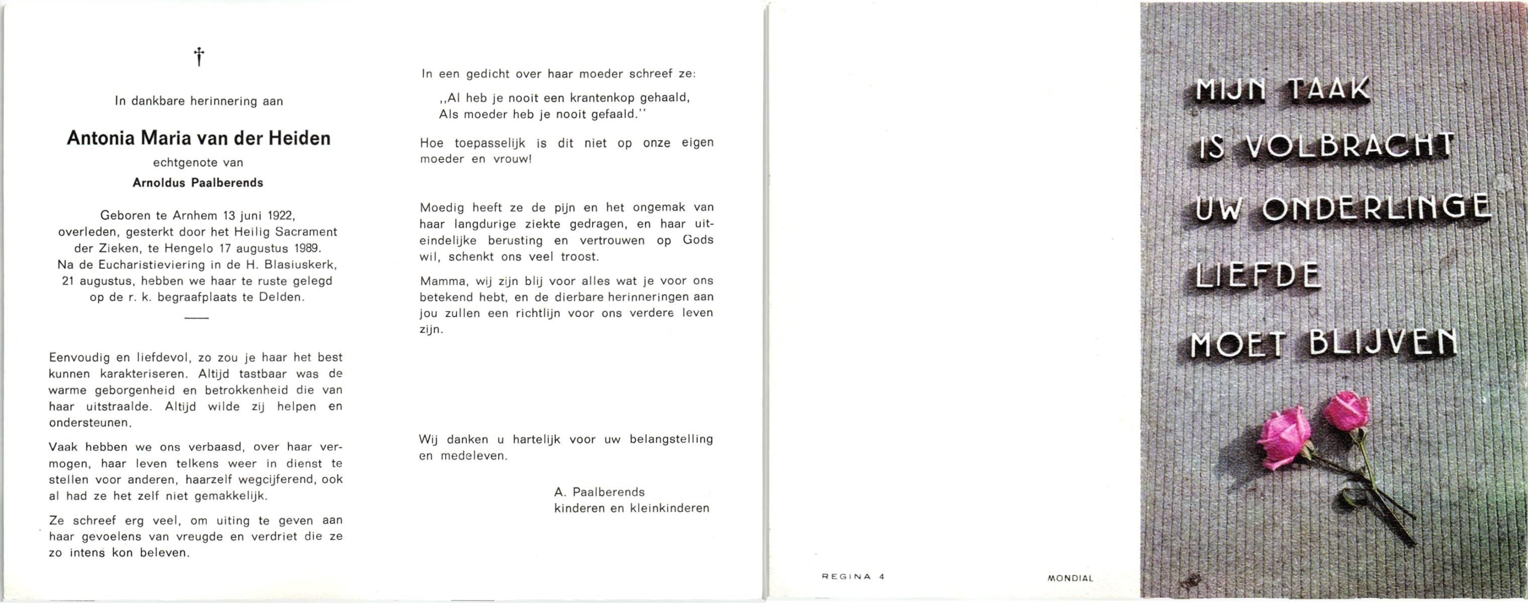 HEIDEN, van, Antonia Maria, geboren op 13-6-1922 te Arnhem, overleden op 17-8-1989 te Hengelo (O) op 67-jarige leeftijd, begraven op 21-8-1989 te Delden.