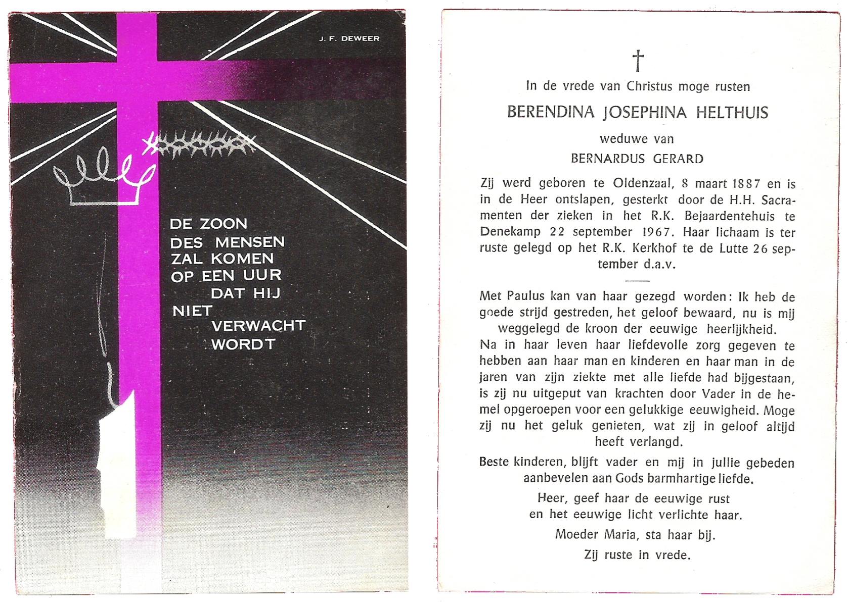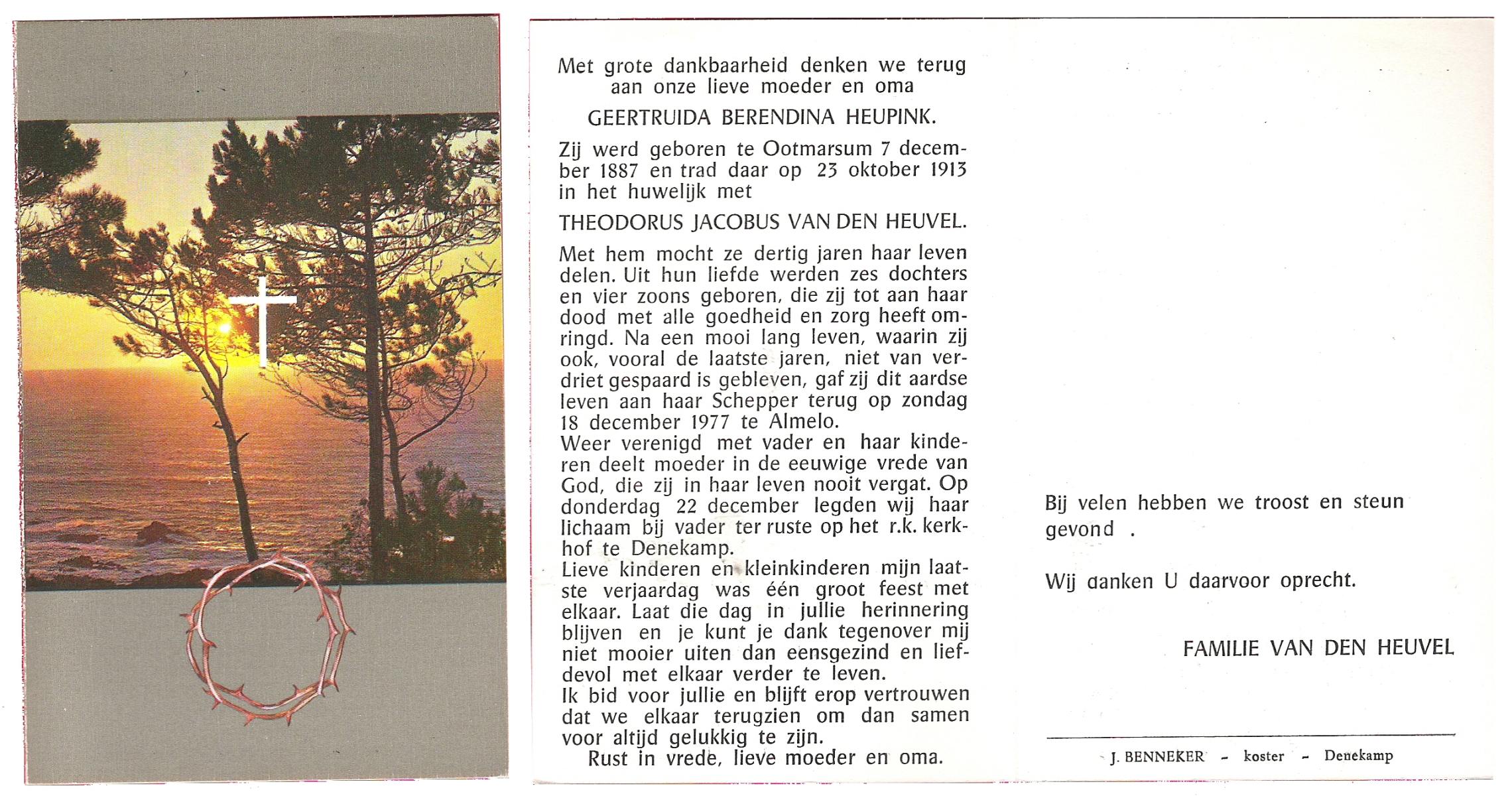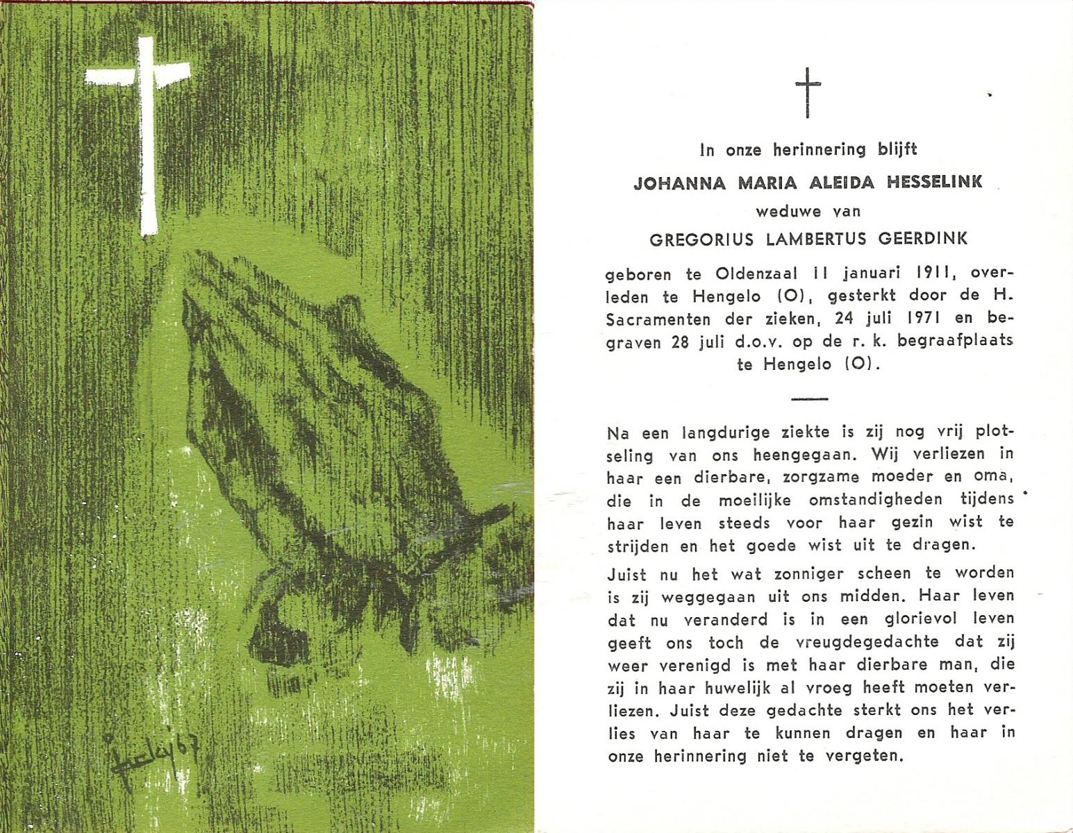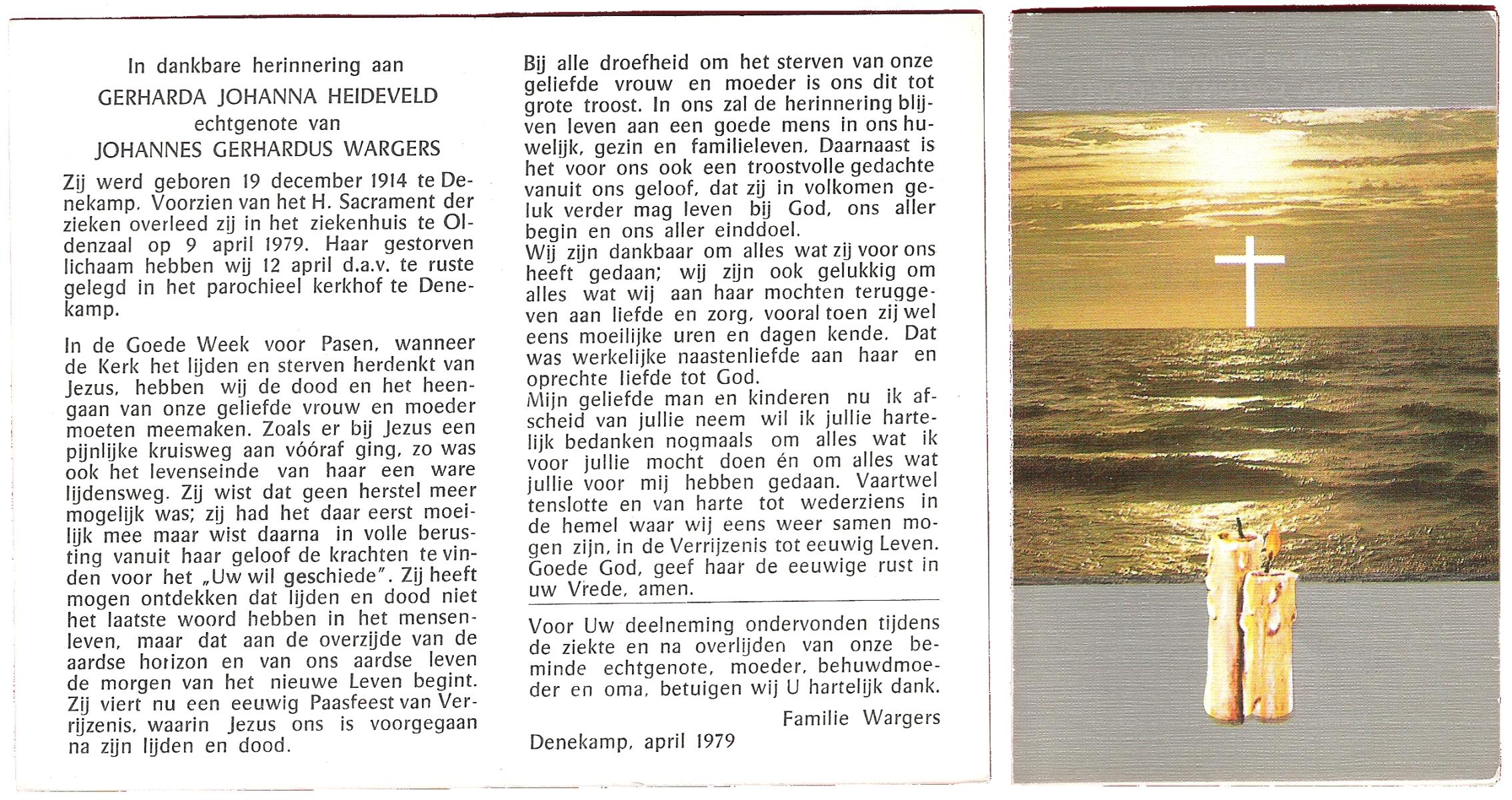 HEIDEVELD, Gerharda Johanna, geboren op 19-12-1914 te Denekamp, overleden op 9-4-1979 te Oldenzaal op 65-jarige leeftijd, begraven op 12-4-1979 te Denekamp.
