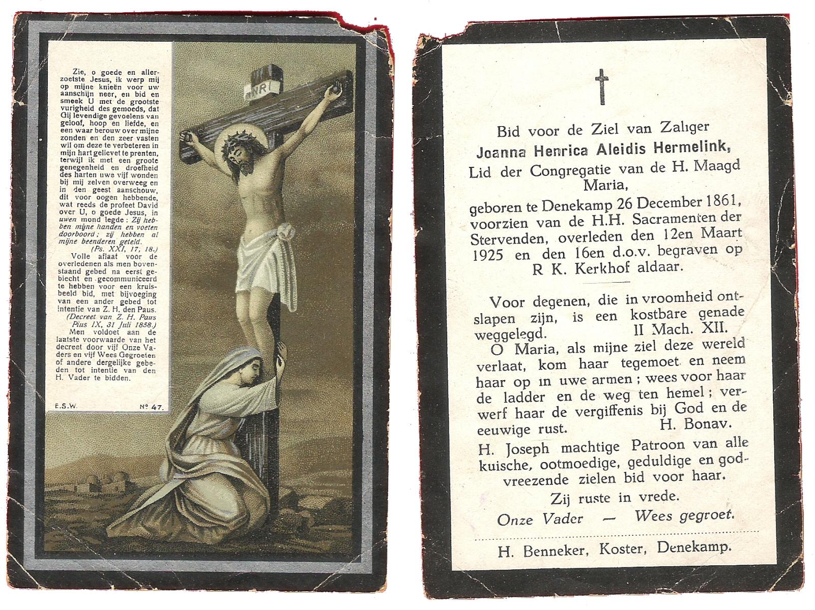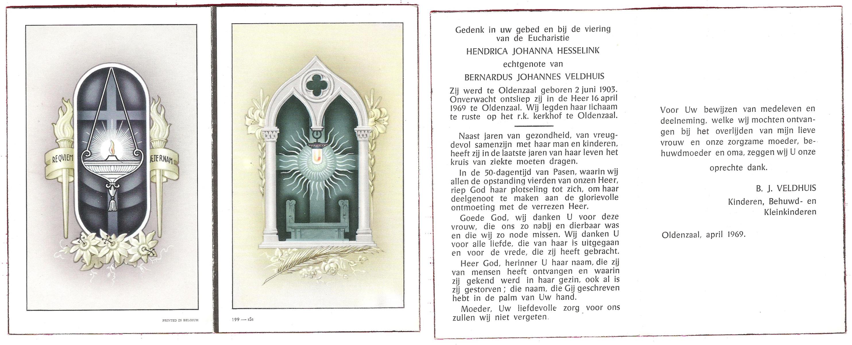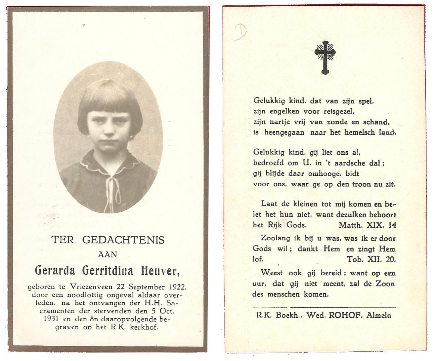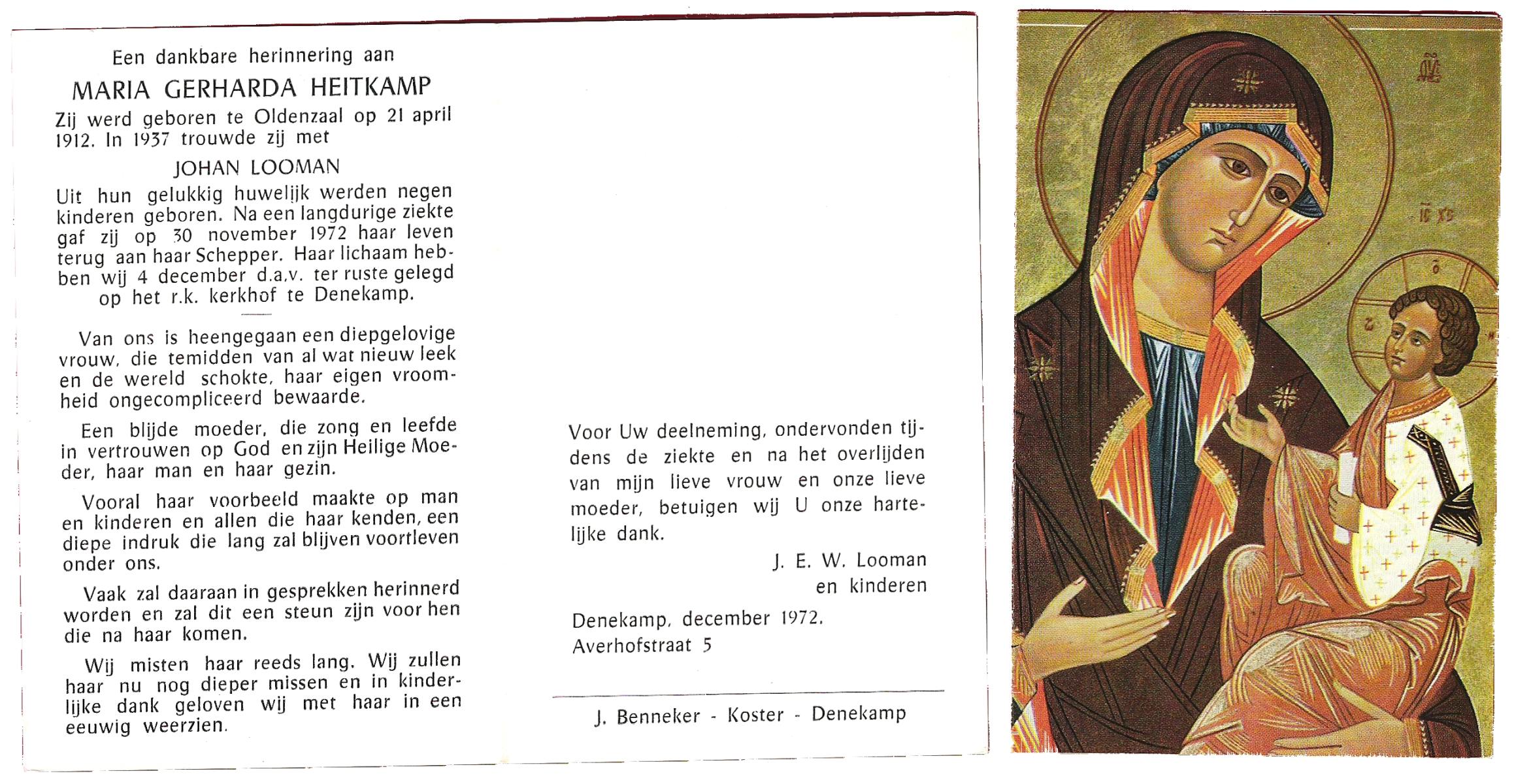 HEIDEVELD, Gerharda Johanna, geboren op 19-12-1914 te Denekamp, overleden op 9-4-1979 te Oldenzaal op 65-jarige leeftijd, begraven op 12-4-1979 te Denekamp.