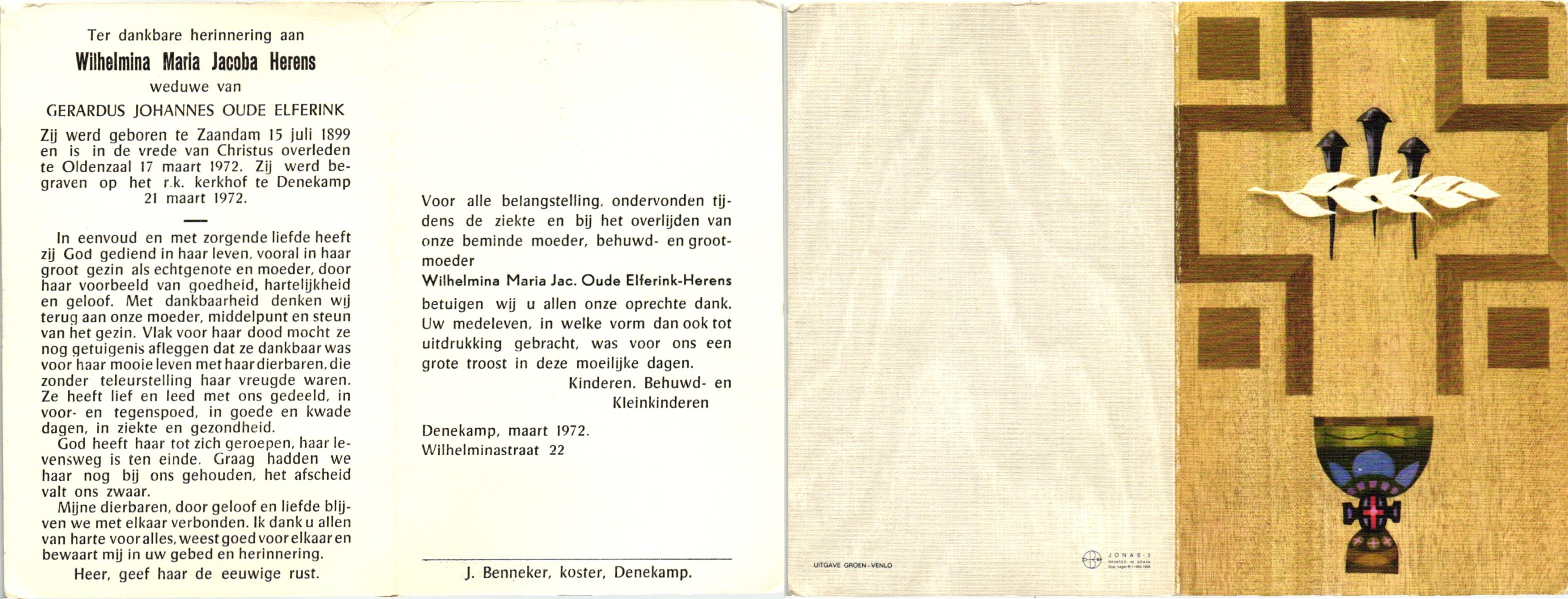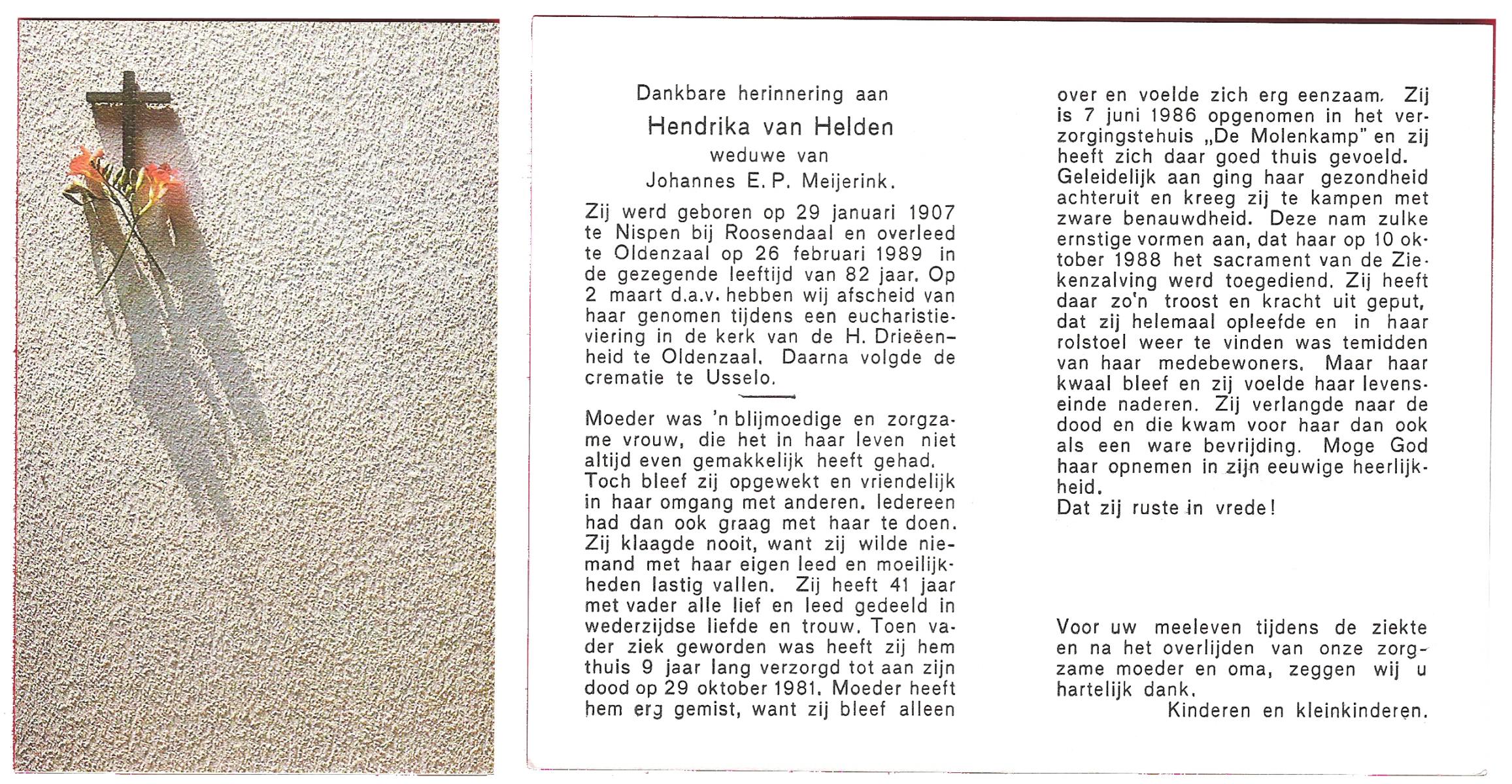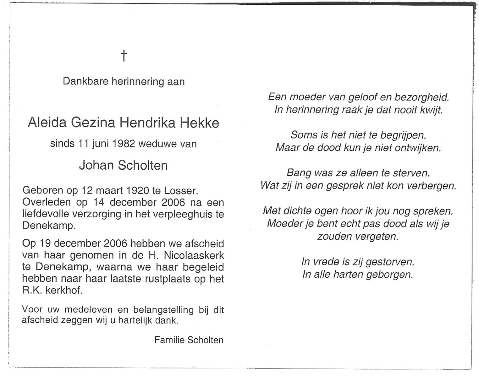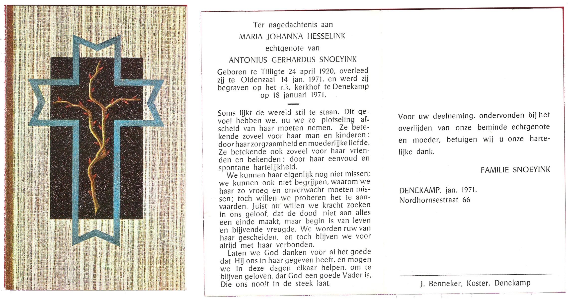 HEIDEVELD, Gerharda Johanna, geboren op 19-12-1914 te Denekamp, overleden op 9-4-1979 te Oldenzaal op 65-jarige leeftijd, begraven op 12-4-1979 te Denekamp.