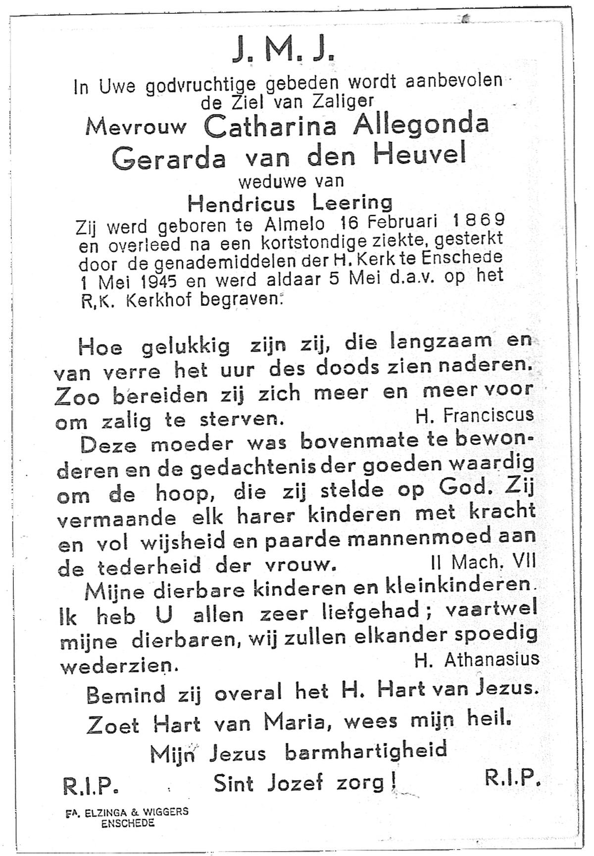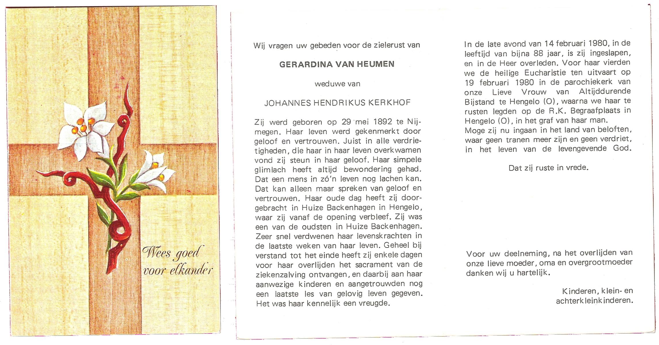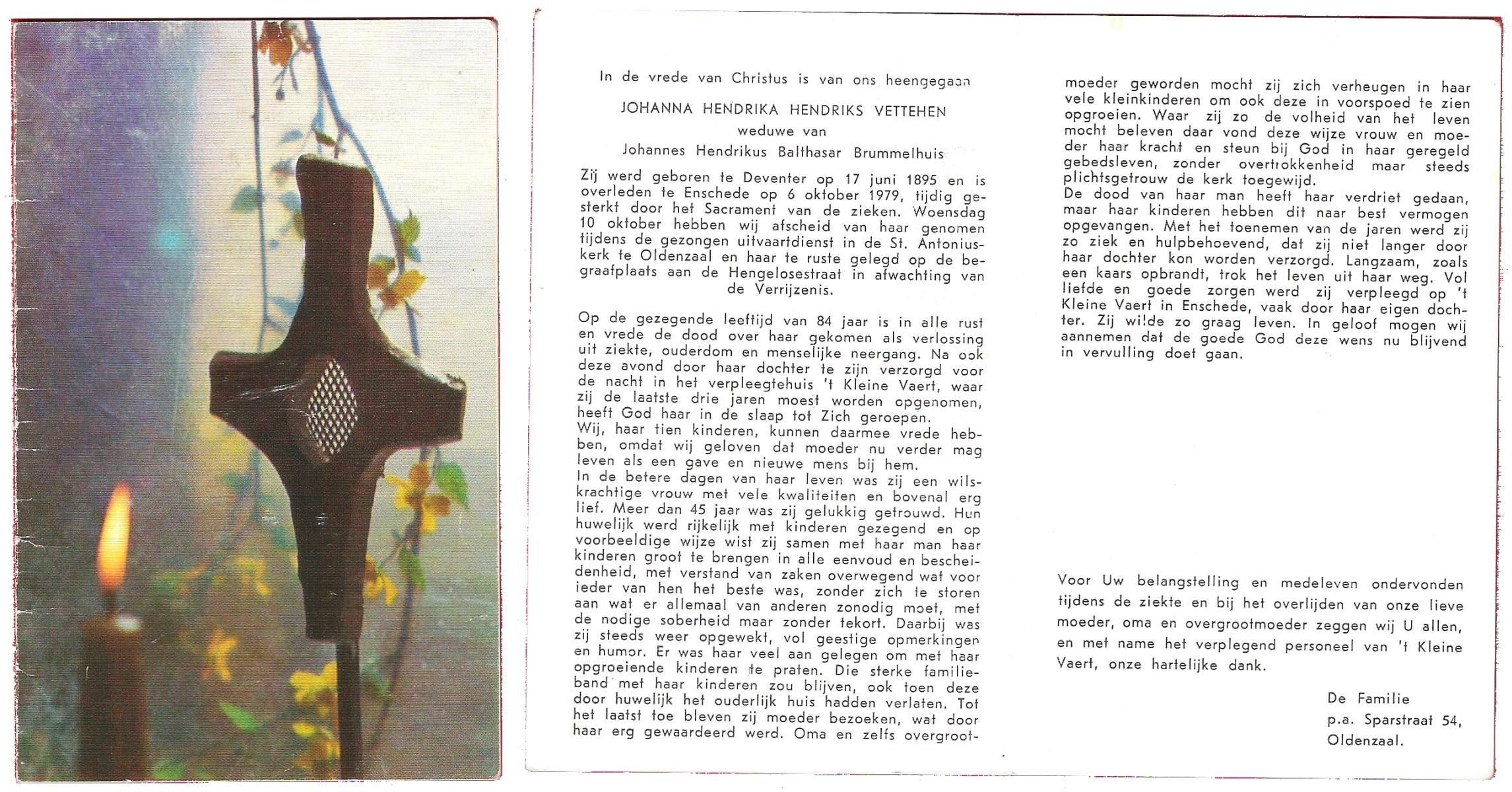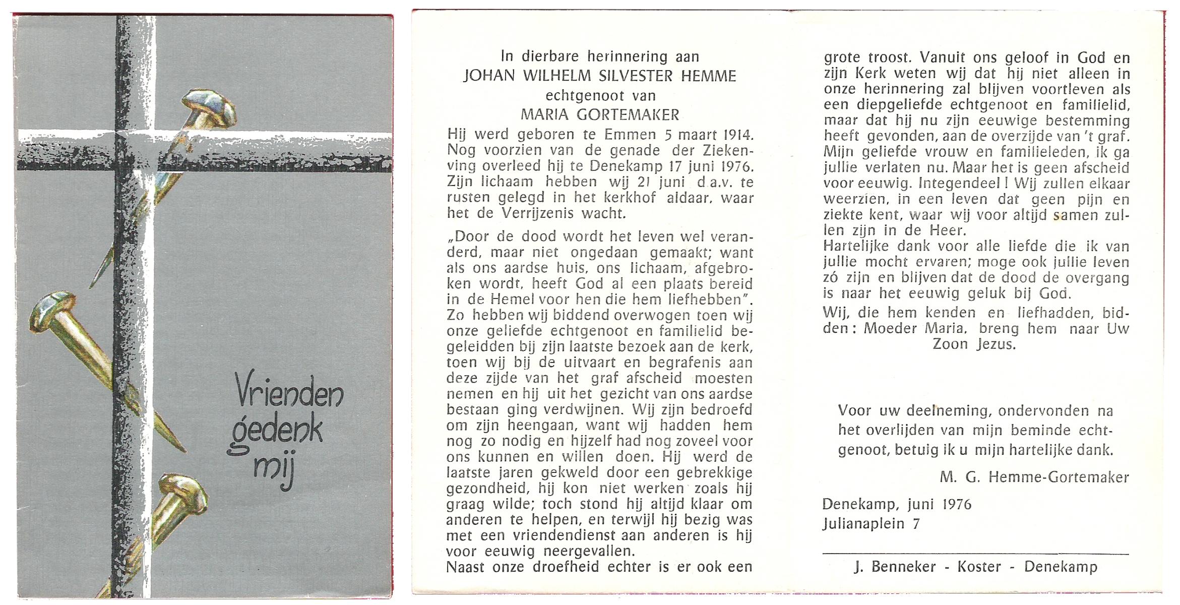 HEIDEVELD, Gerharda Johanna, geboren op 19-12-1914 te Denekamp, overleden op 9-4-1979 te Oldenzaal op 65-jarige leeftijd, begraven op 12-4-1979 te Denekamp.