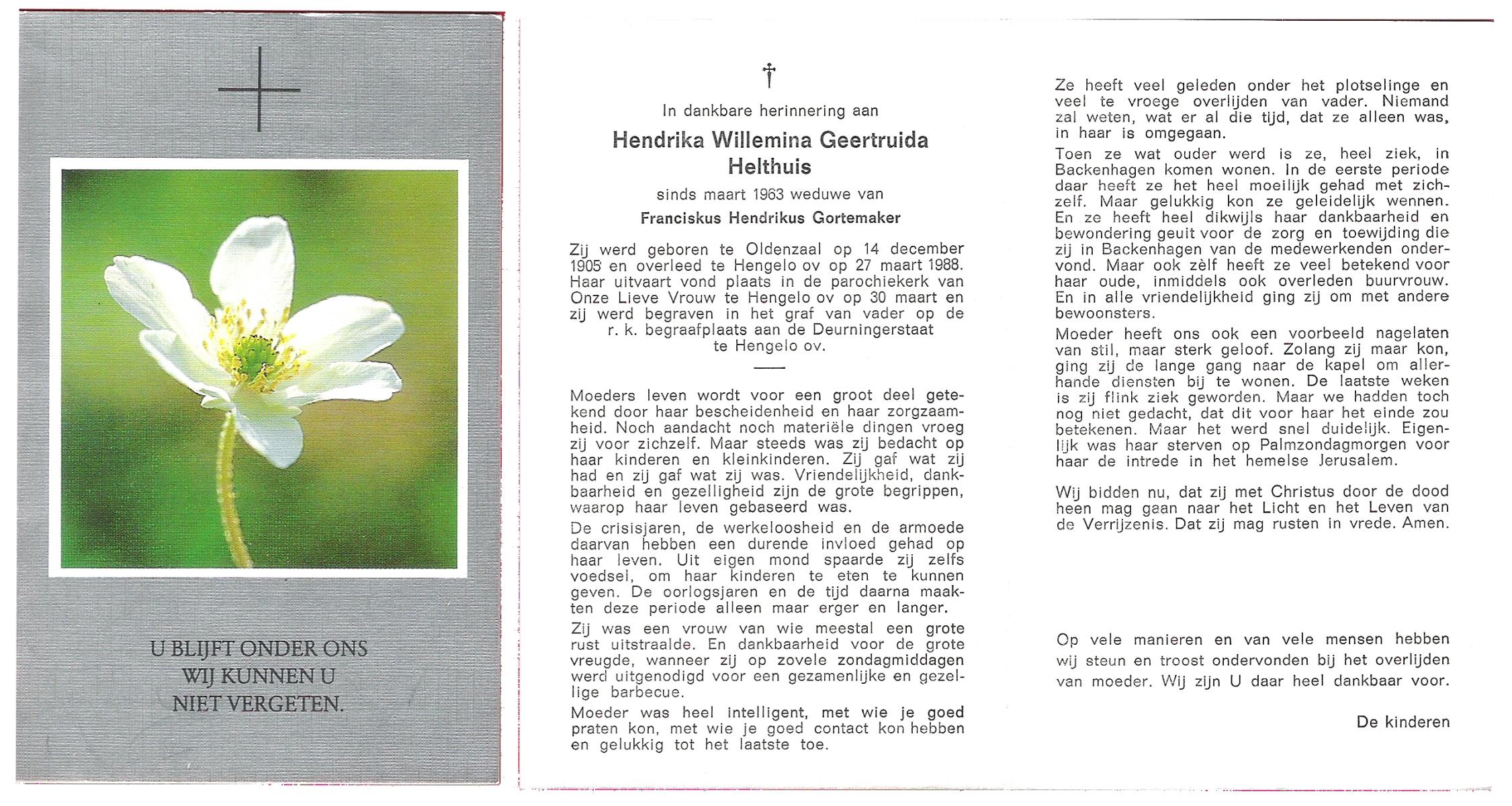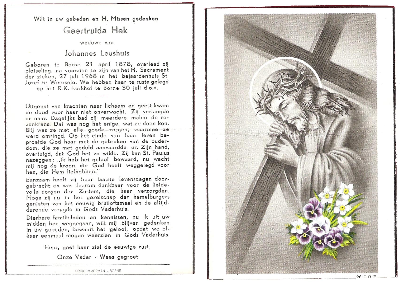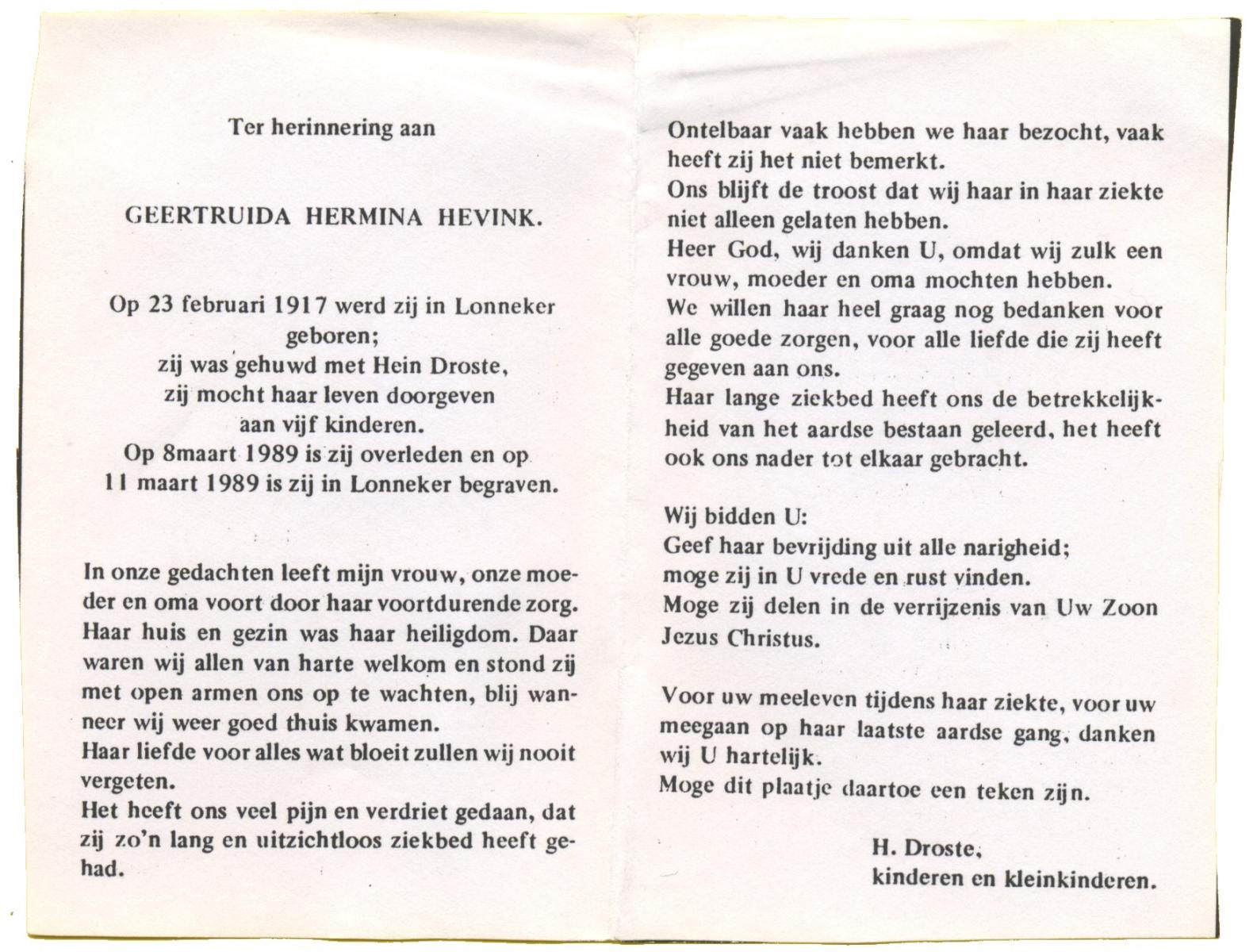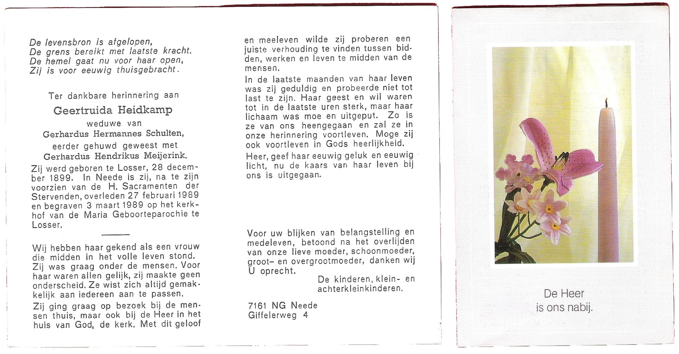 HEIDKAMP, Geertruida, geboren op 28-12-1899 te Losser, overleden op 27-2-1989 te Neede op 89-jarige leeftijd, begraven op 3-3-1989 te Losser.