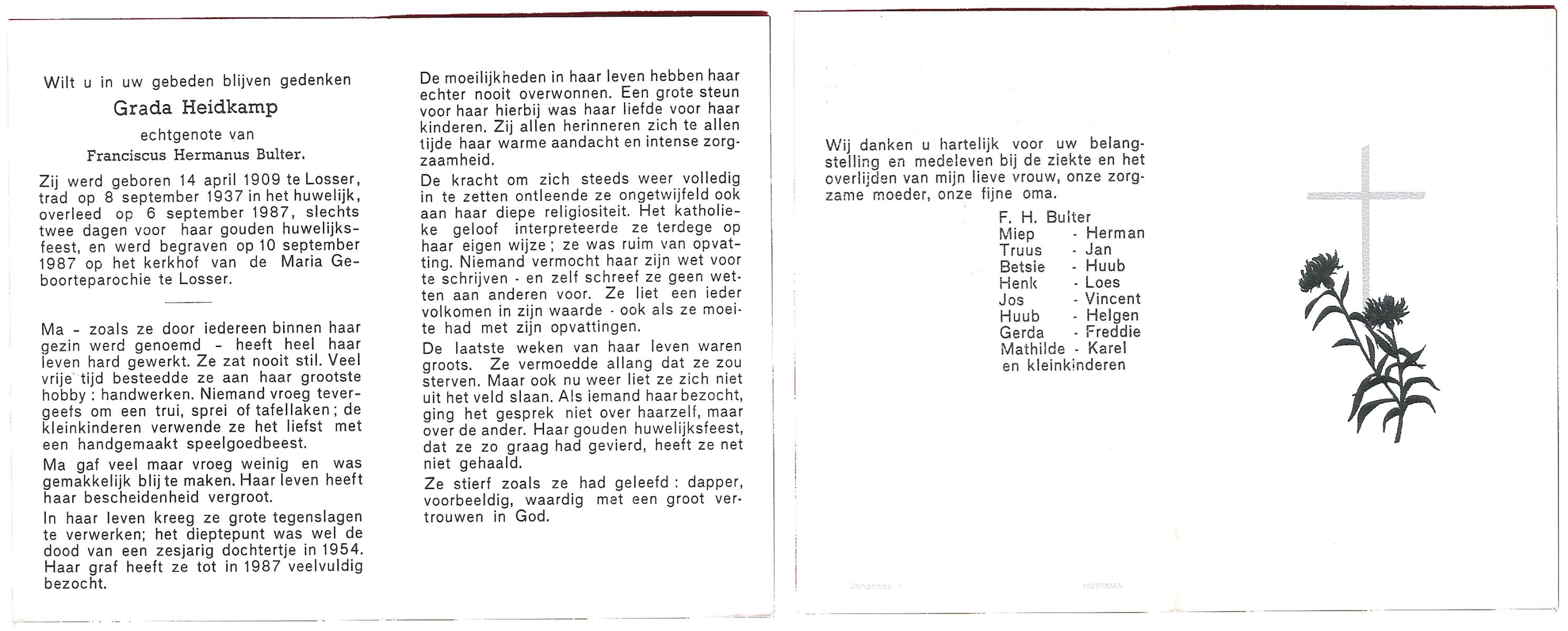 HEIDKAMP, Grada, geboren op 14-4-1909 te Losser, overleden op 6-9-1987 te Losser op 77-jarige leeftijd, begraven op 10-9-1987 te Losser.