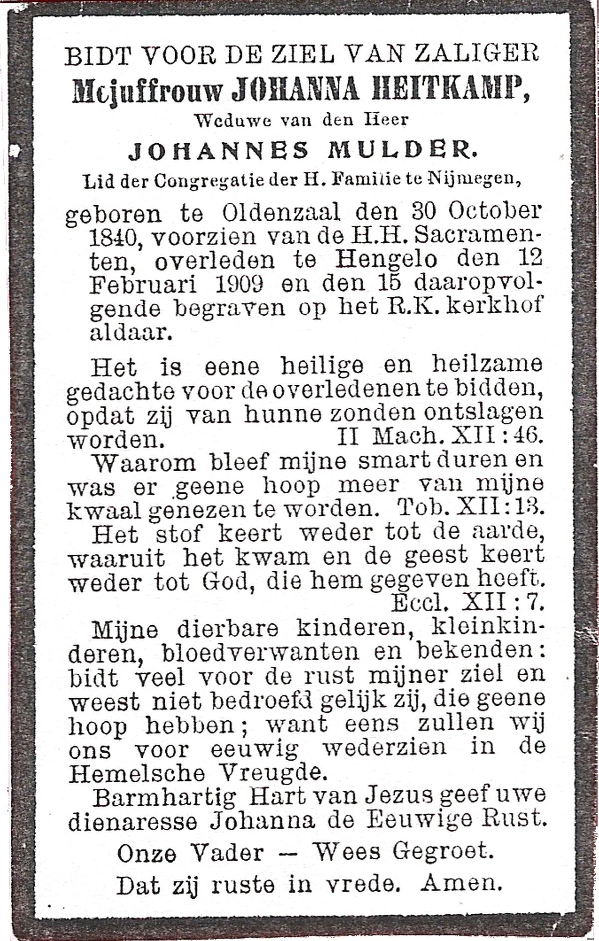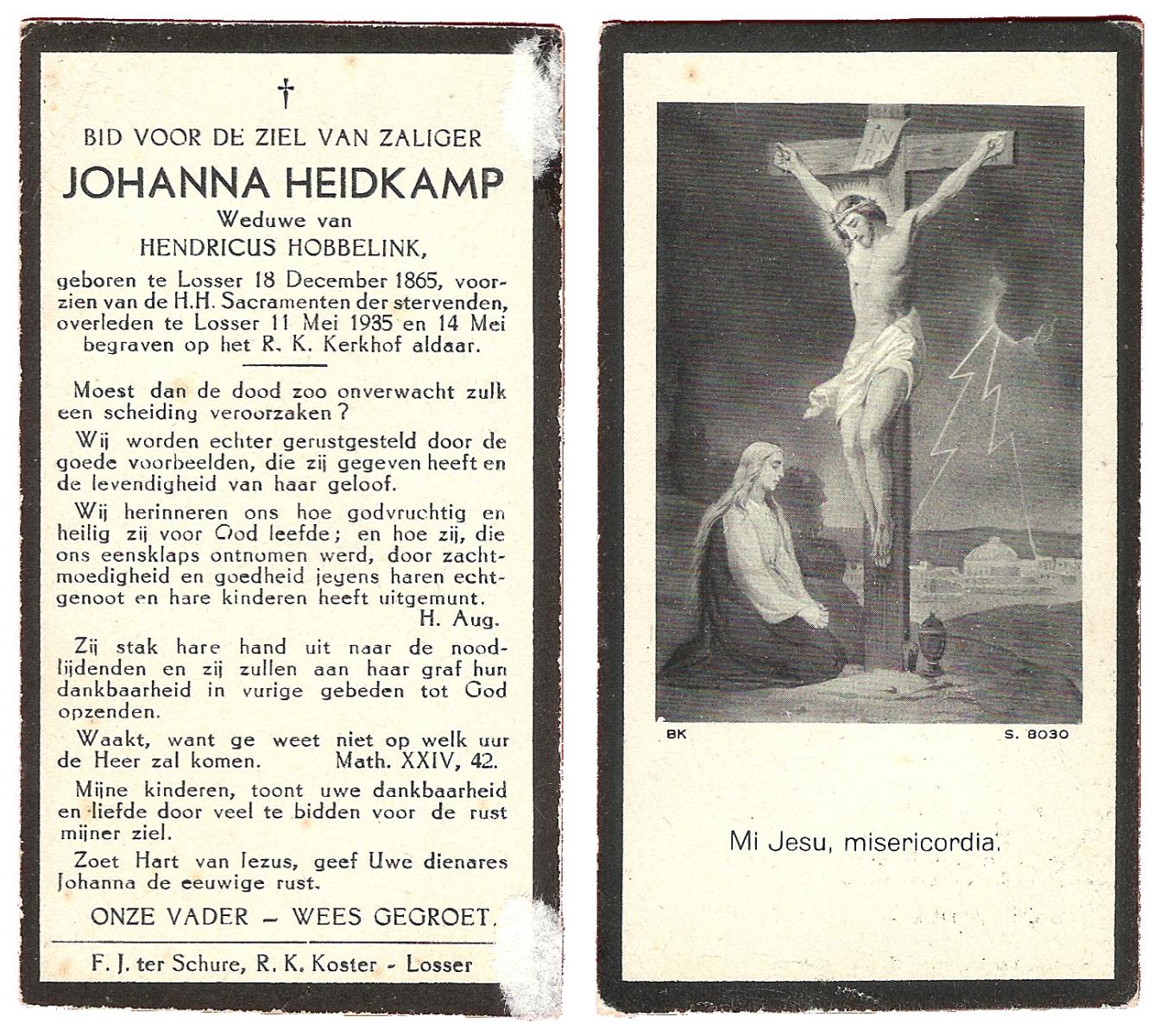 HEIDKAMP, Johanna, geboren op 18-12-1865 te Losser, overleden op 11-5-1935 te Losser op 69-jarige leeftijd, begraven op 14-5-1935 te Losser.