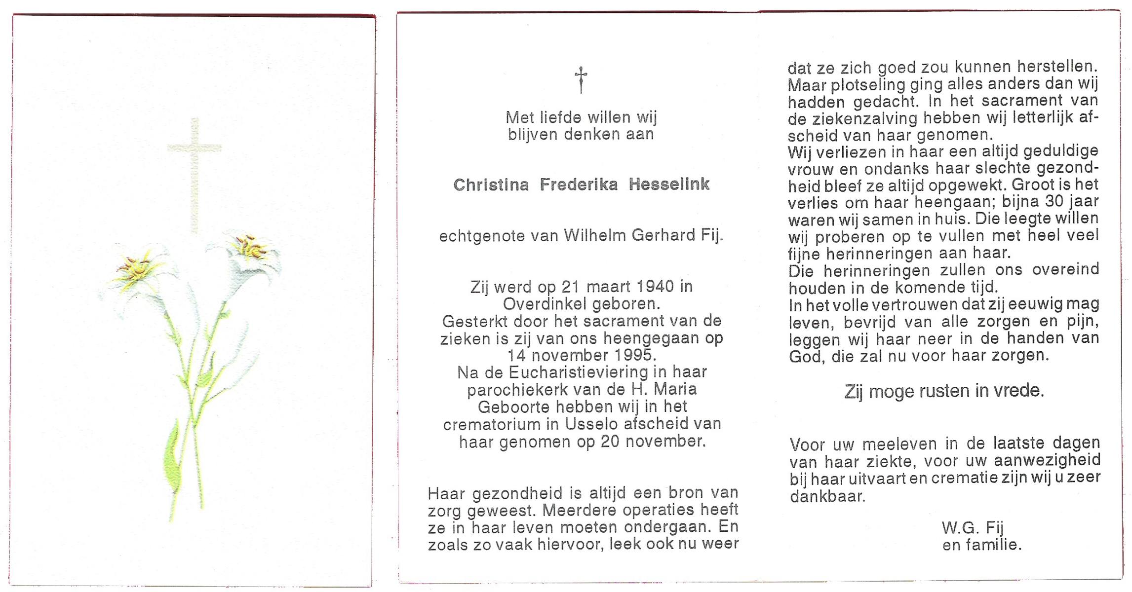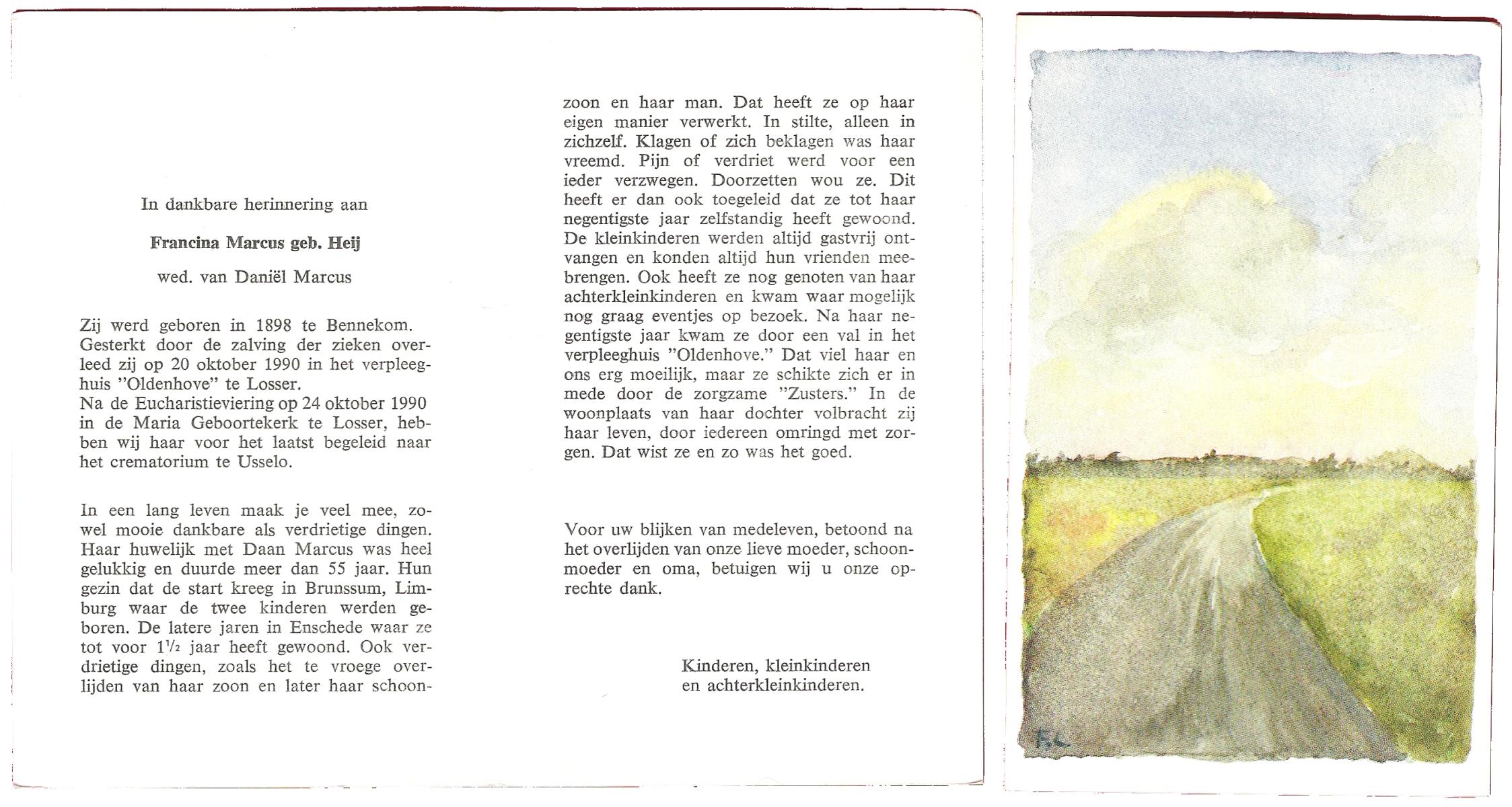 HEIJ, Francina, geboren op ca 1898 te Bennekom, overleden op 20-10-1990 te Losser op 92-jarige leeftijd, gecremeerd op 24-10-1990 te Usselo.