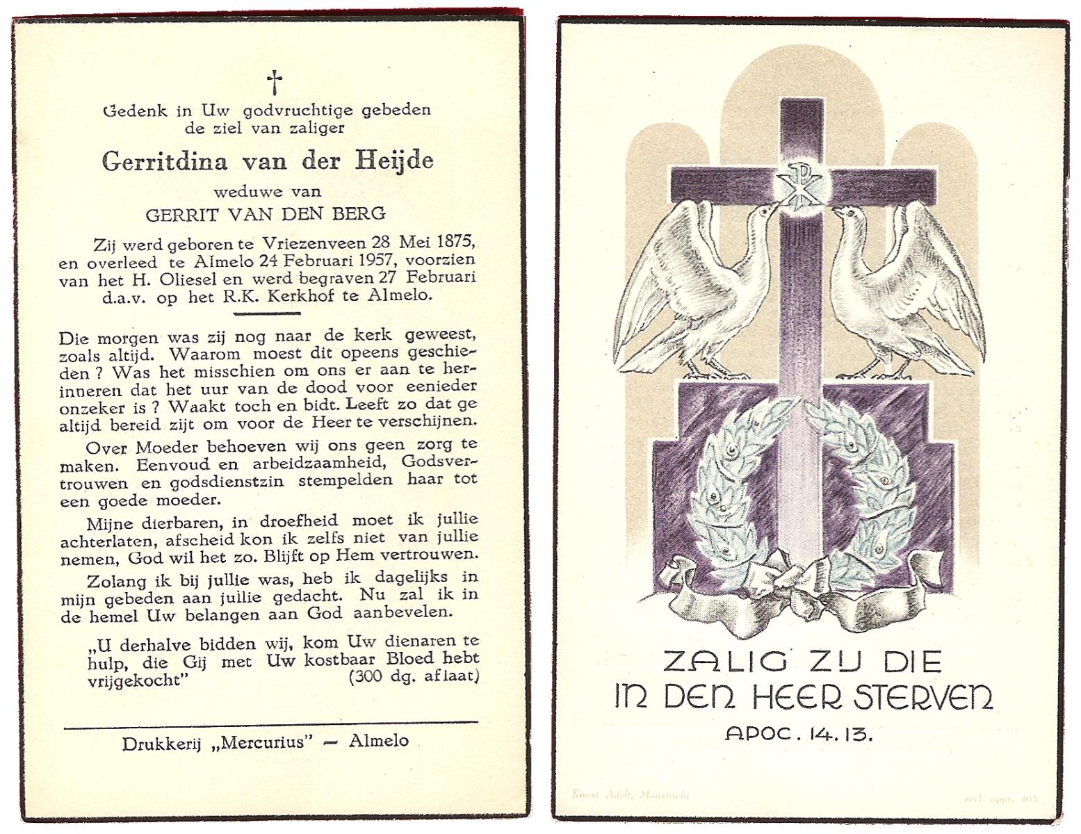 HEIJDE, van der, Gerritdina, geboren op 28-05-1875 te Vriezenveen, overleden op 24-2-1957 te Almelo op 81-jarige leeftijd, begraven op 27-2-1957 te Almelo.