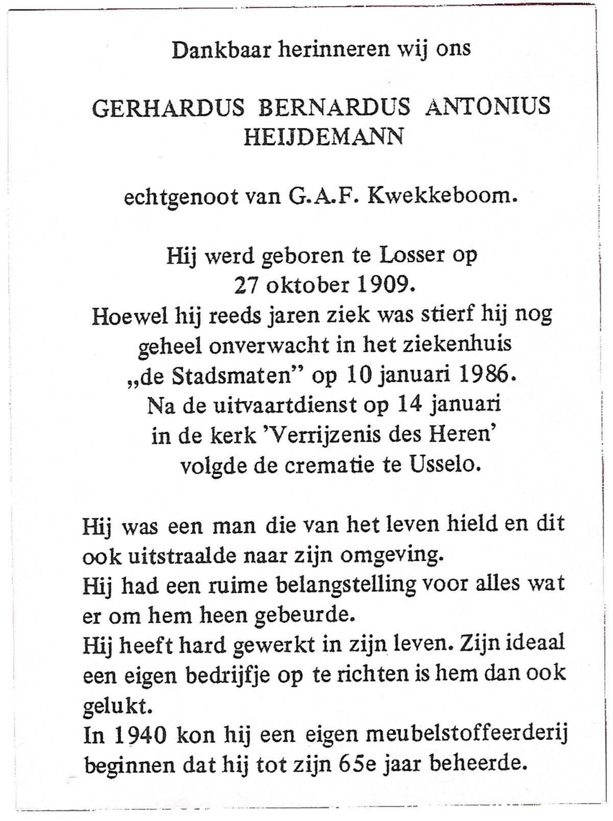 HEIJDEMANN, Gerhardus Bernardus Antonius, geboren op 27-10-1909 te Losser, overleden op 10-1-1986 te Enschede op 76-jarige leeftijd, gecremeerd op 14-1-1986 te Usselo.