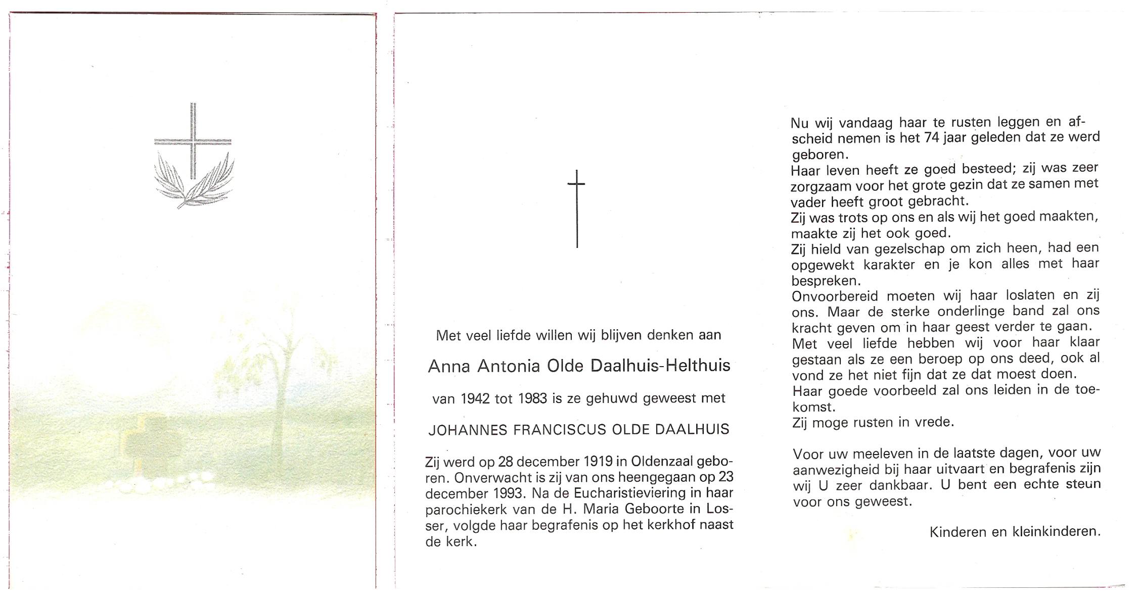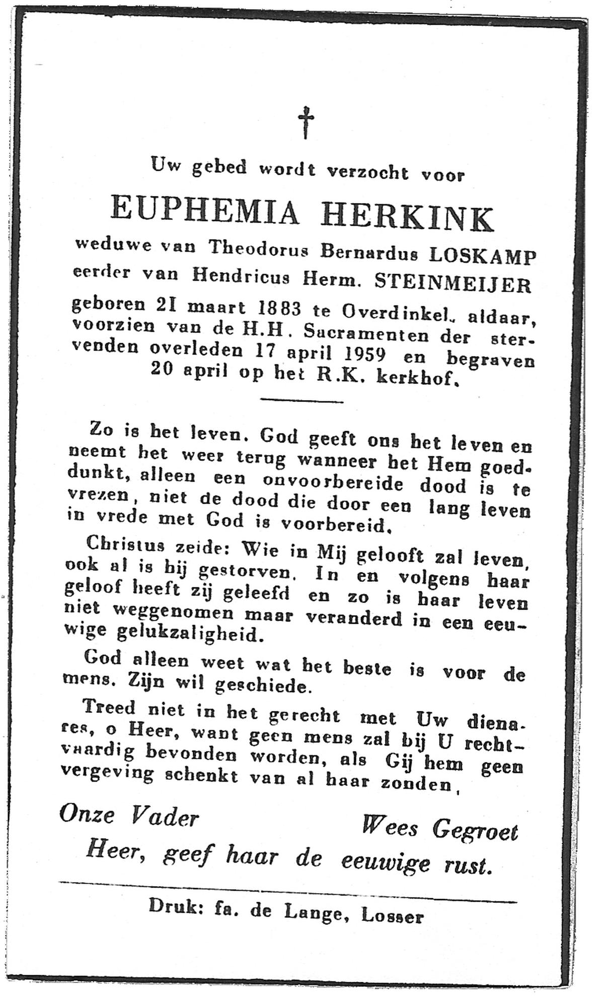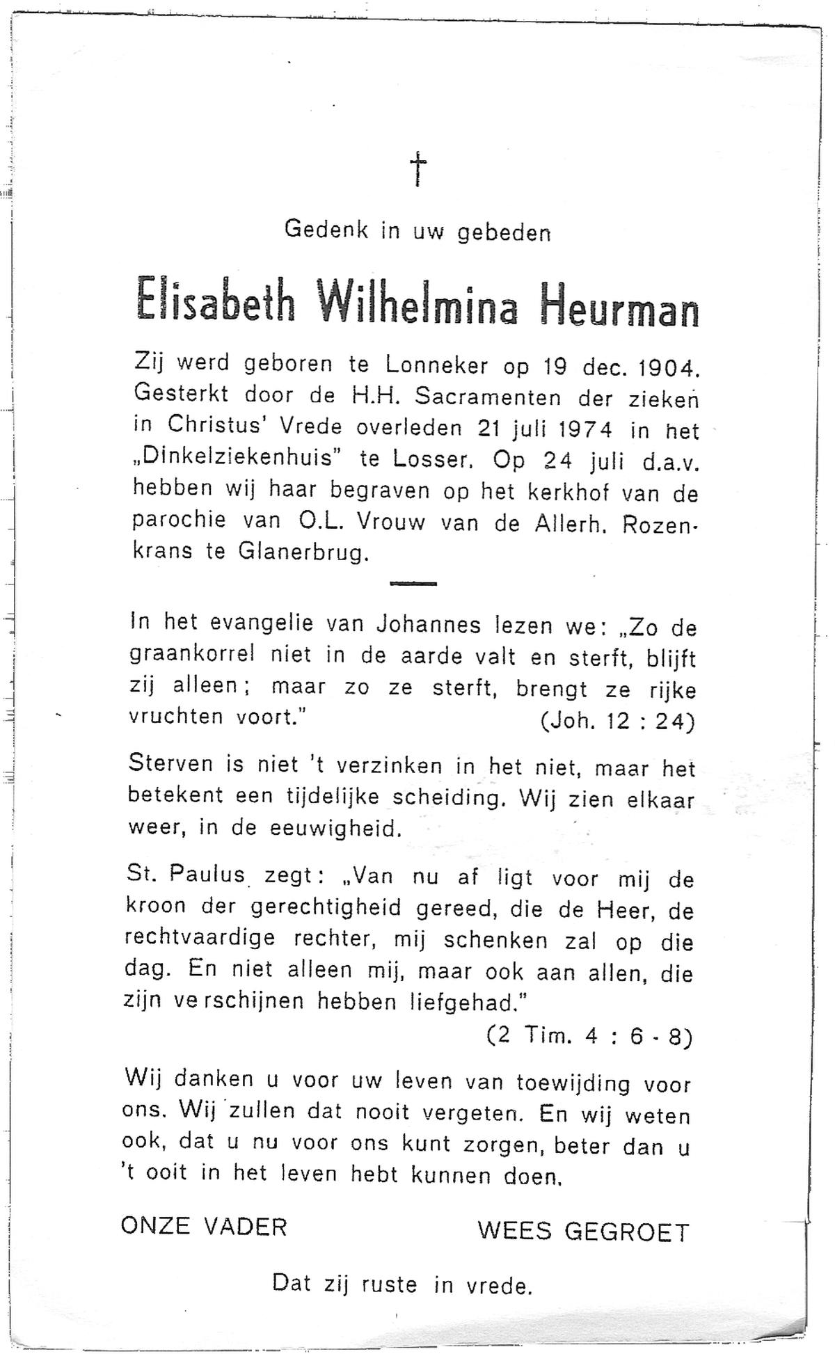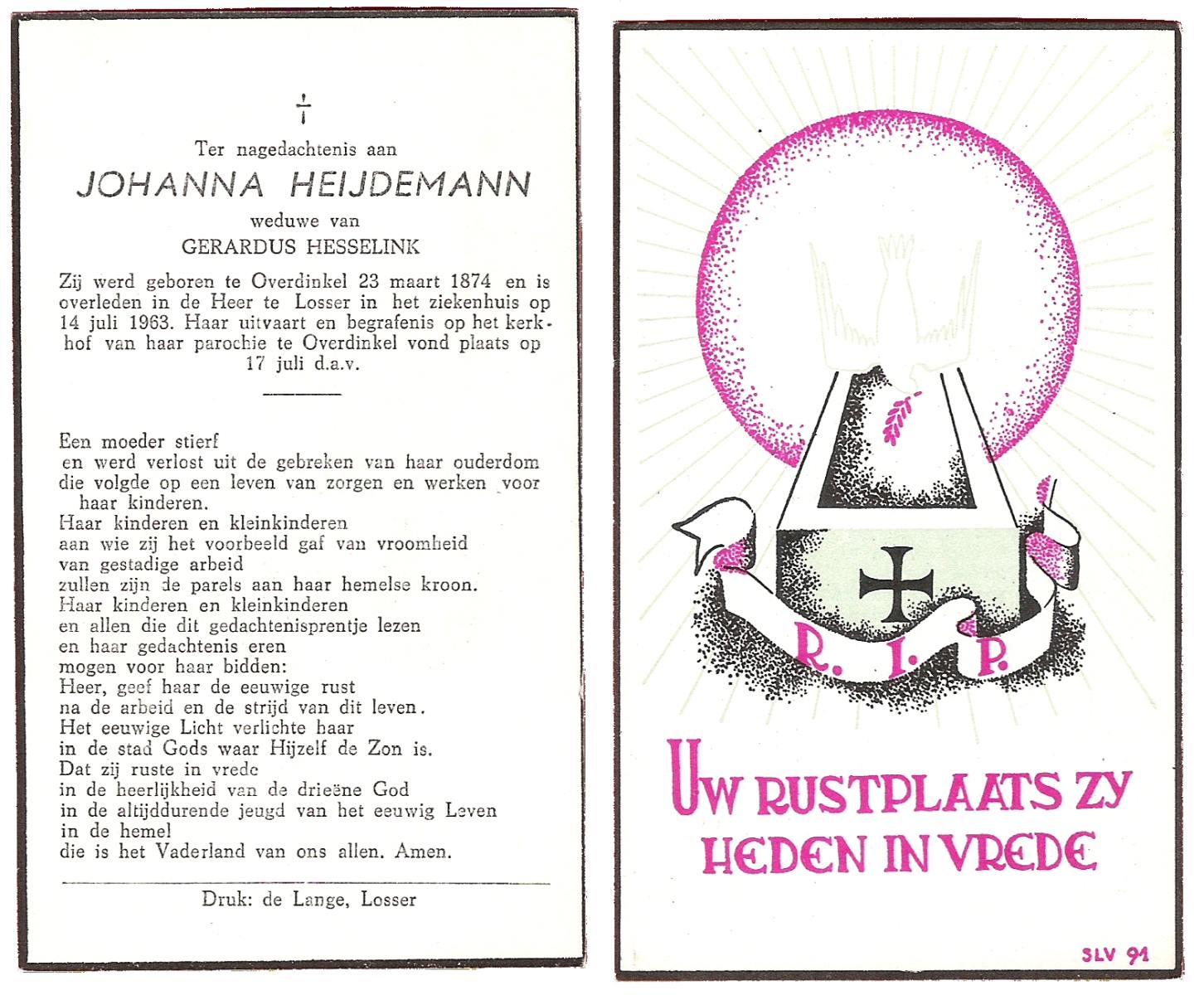 HEIJDEMANN, Johanna, geboren op 23-03-1874 te Overdinkel, overleden op 14-7-1963 te Losser op 89-jarige leeftijd, begraven op 17-7-1963 te Overdinkel.