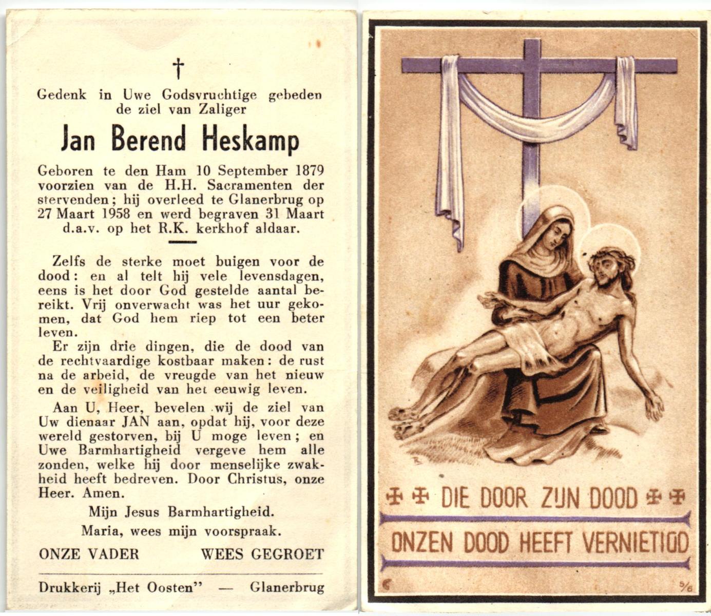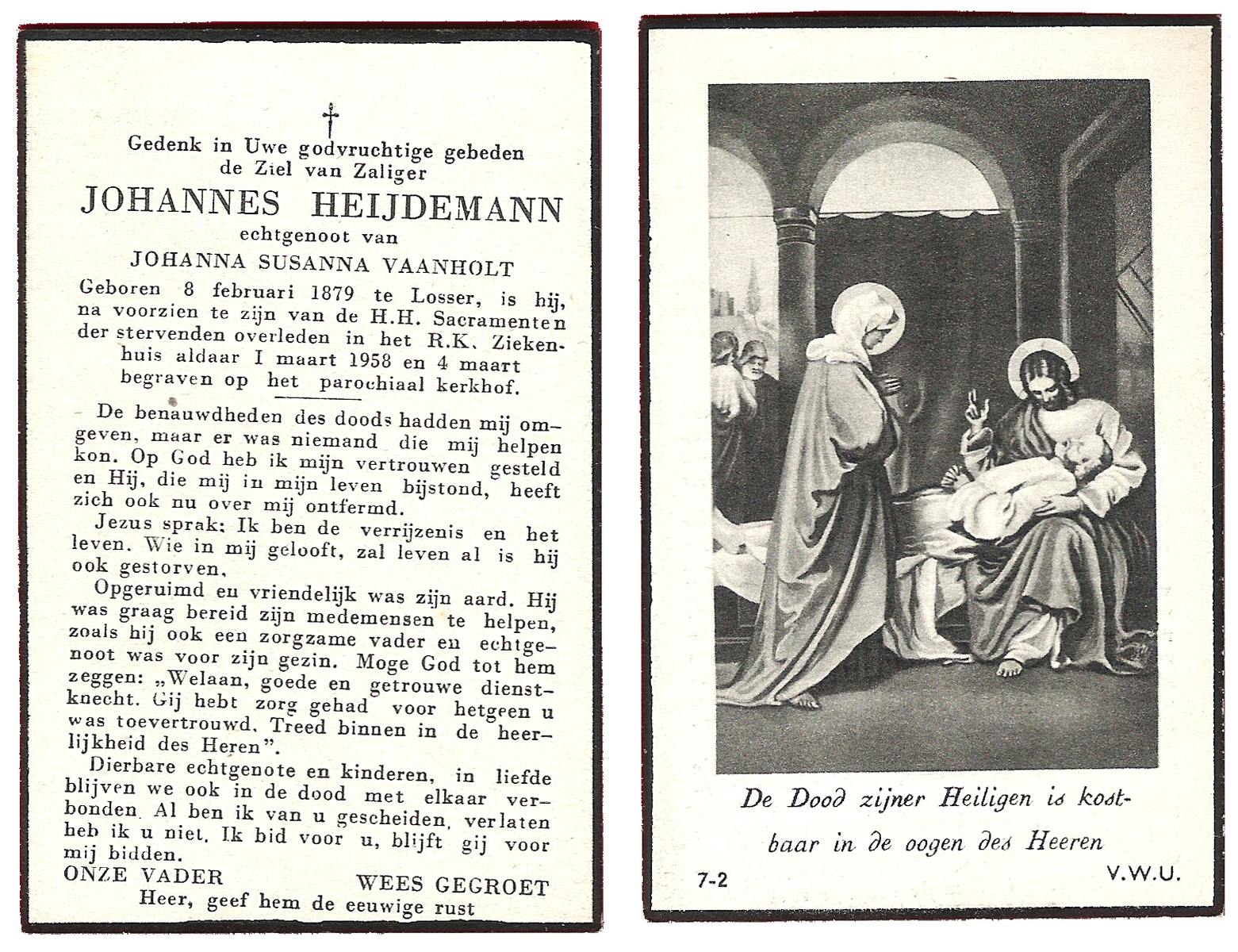 HEIJDEMANN, Johannes, geboren op 08-02-1879 te Losser, overleden op 1-3-1958 te Losser op 79-jarige leeftijd, begraven op 4-3-1958 te Losser.