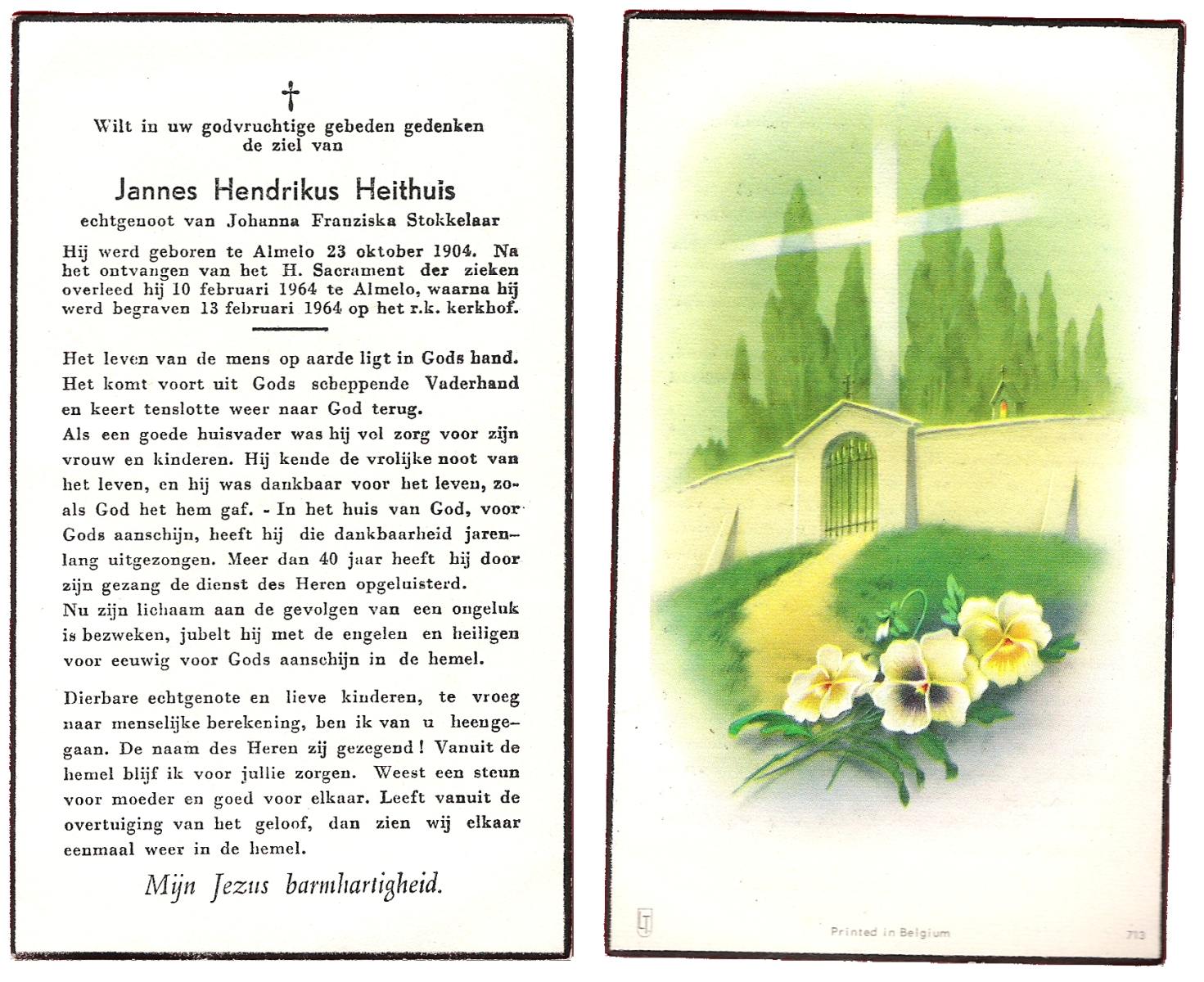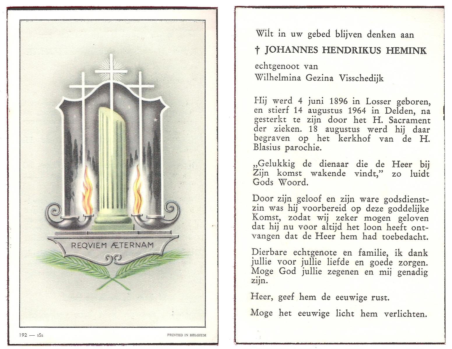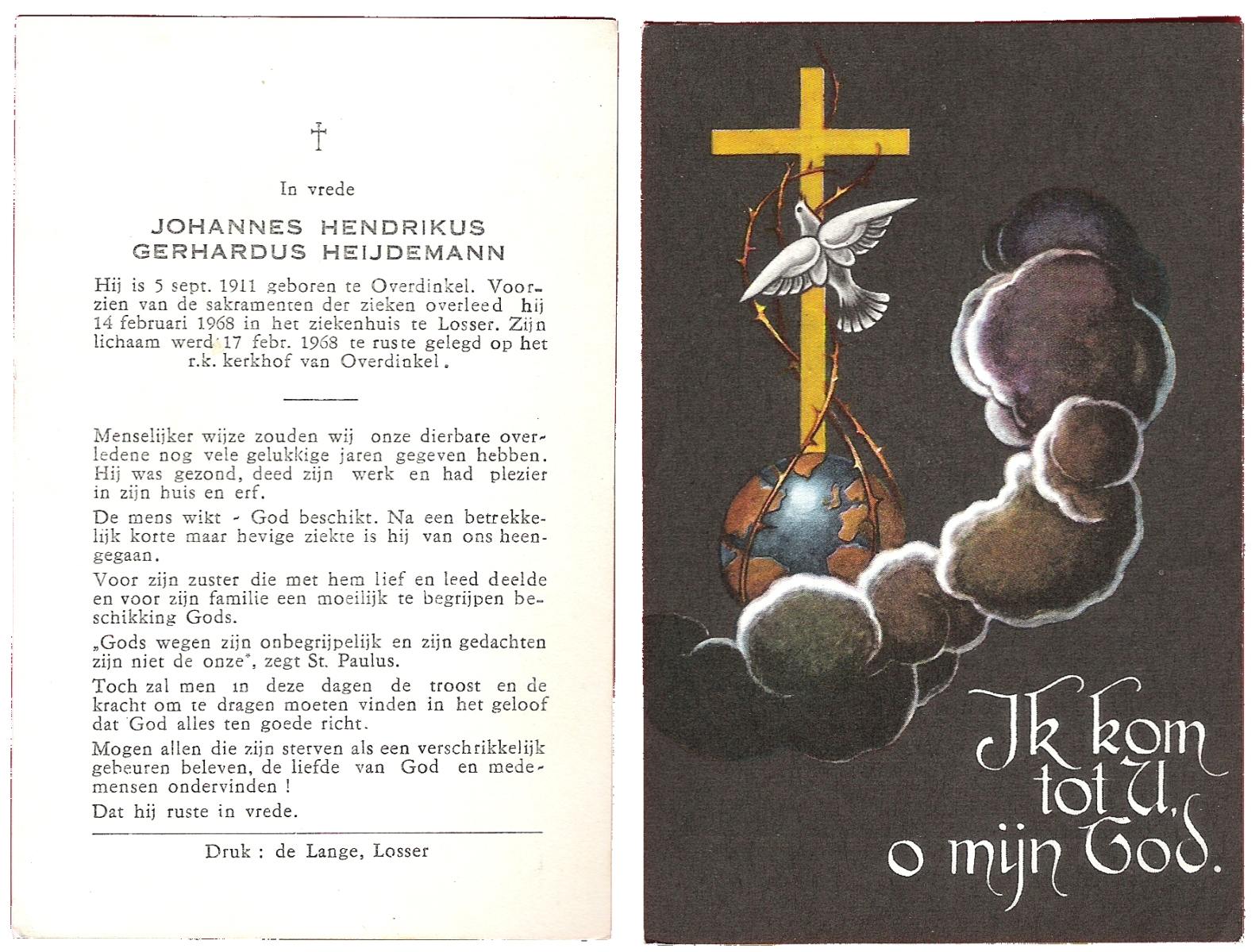 HEIJDEMANN, Johannes Hendrikus Gerhardus, geboren op 5-9-1911 te Overdinkel, overleden op 14-2-1968 te Losser op 56-jarige leeftijd, begraven op 17-2-1968 te Overdinkel.