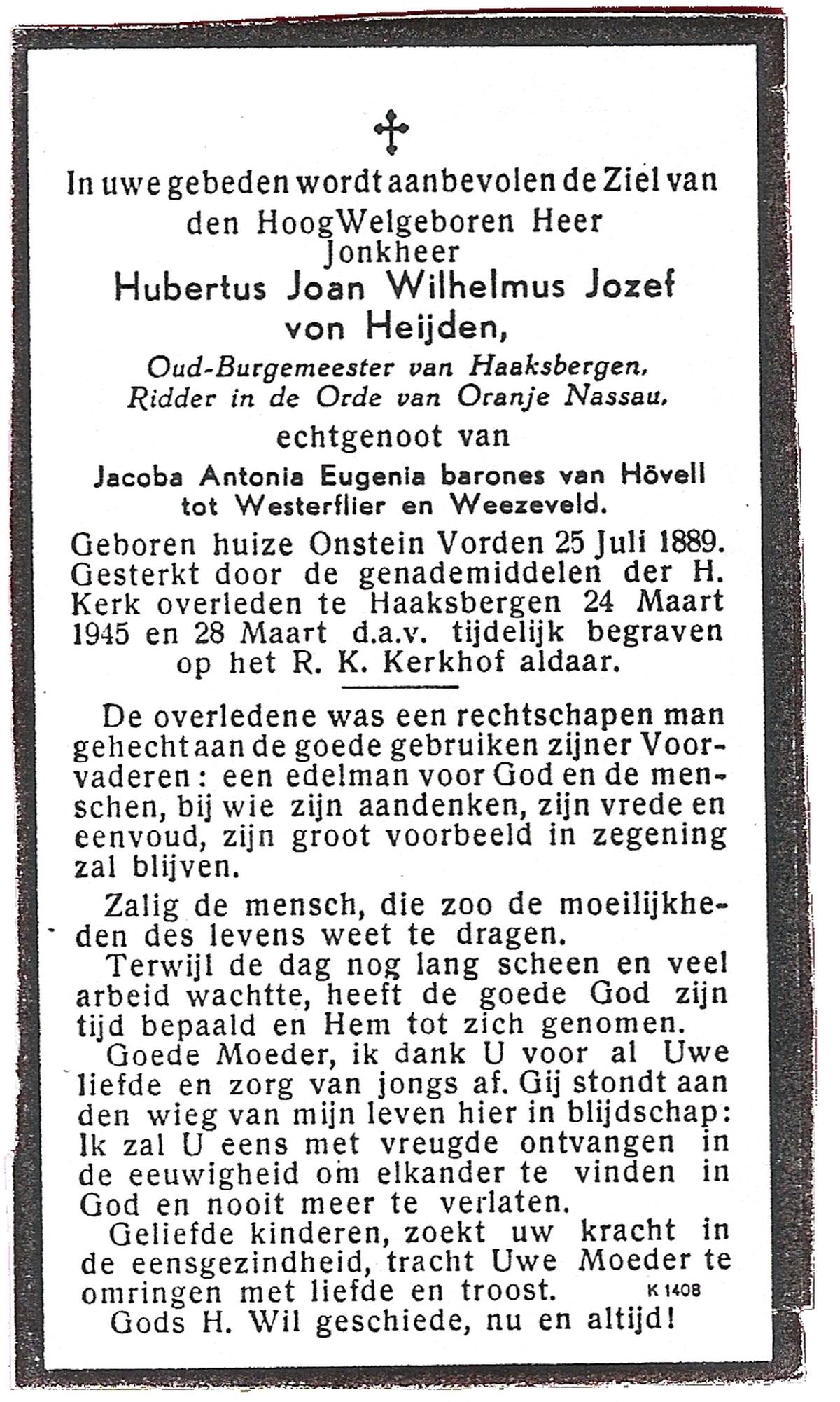 HEIJDEN, von, Hubertus Joan Wilhelmus Jozef, geboren op 25-07-1889 te Vorden, overleden op 24-3-1945 te Haaksbergen op 55-jarige leeftijd, begraven op 28-3-1945 te Haaksbergen.