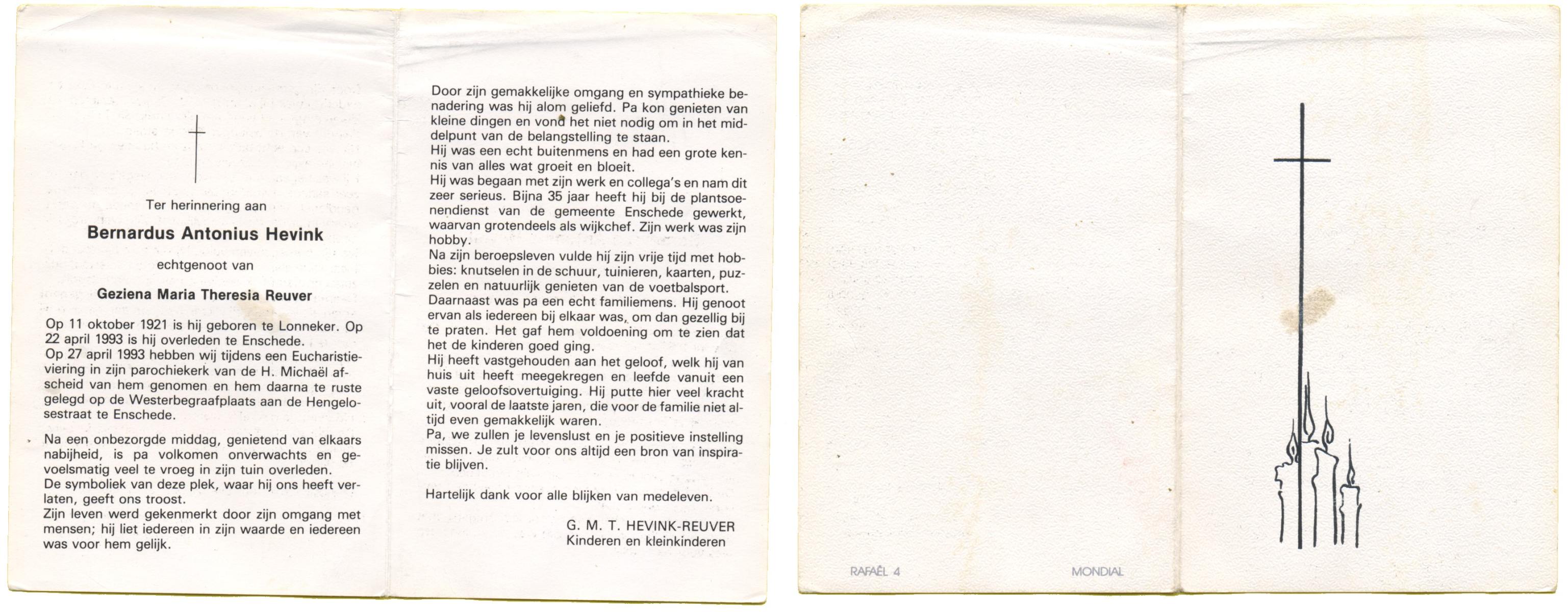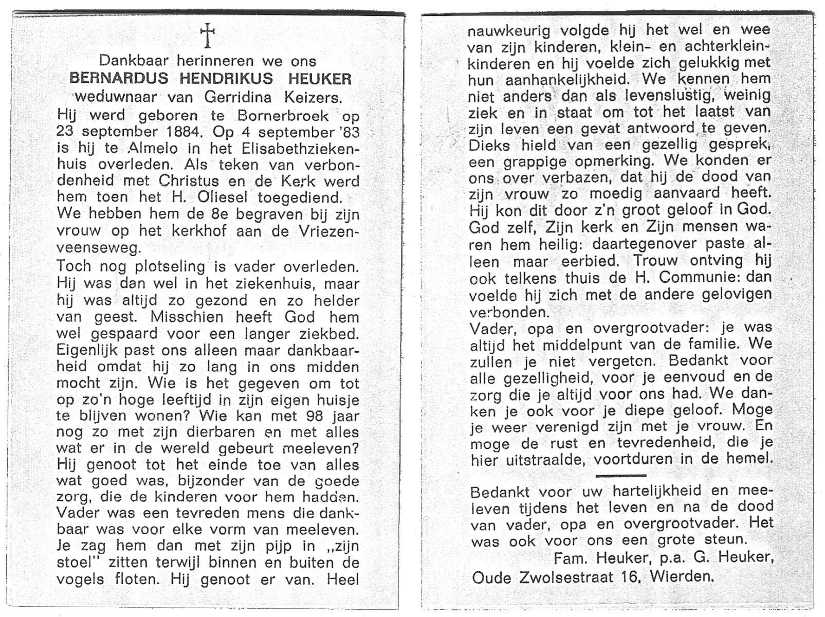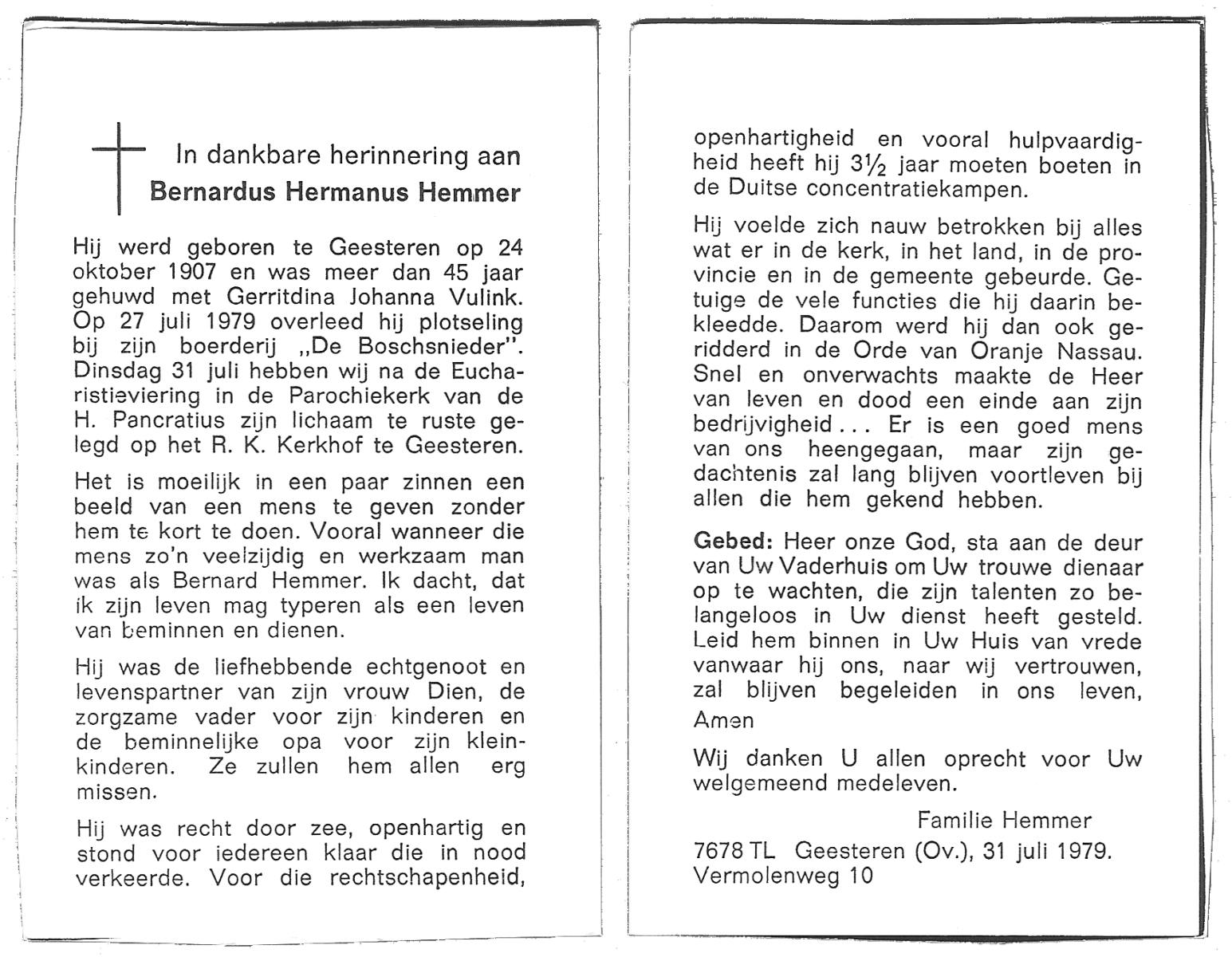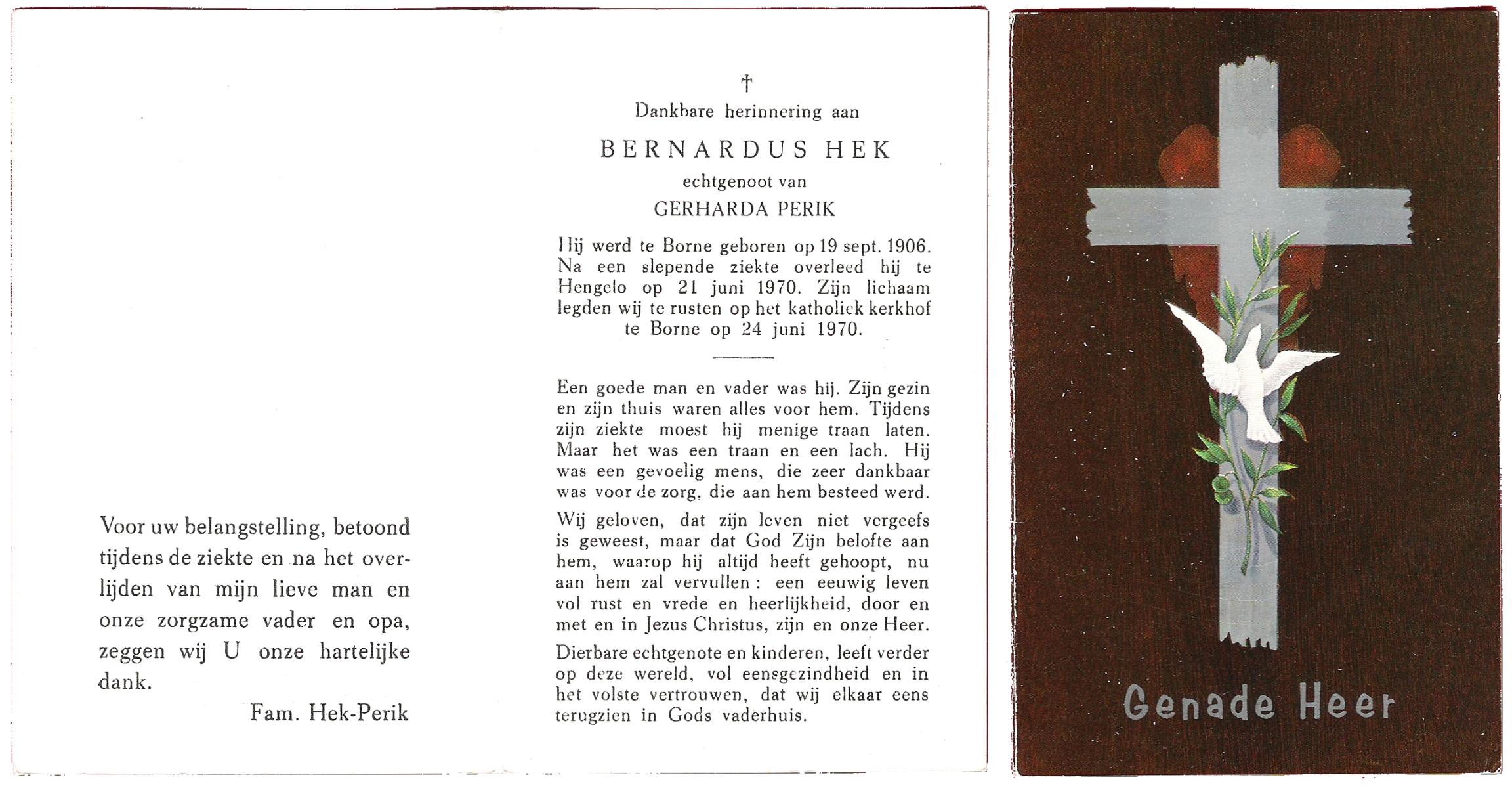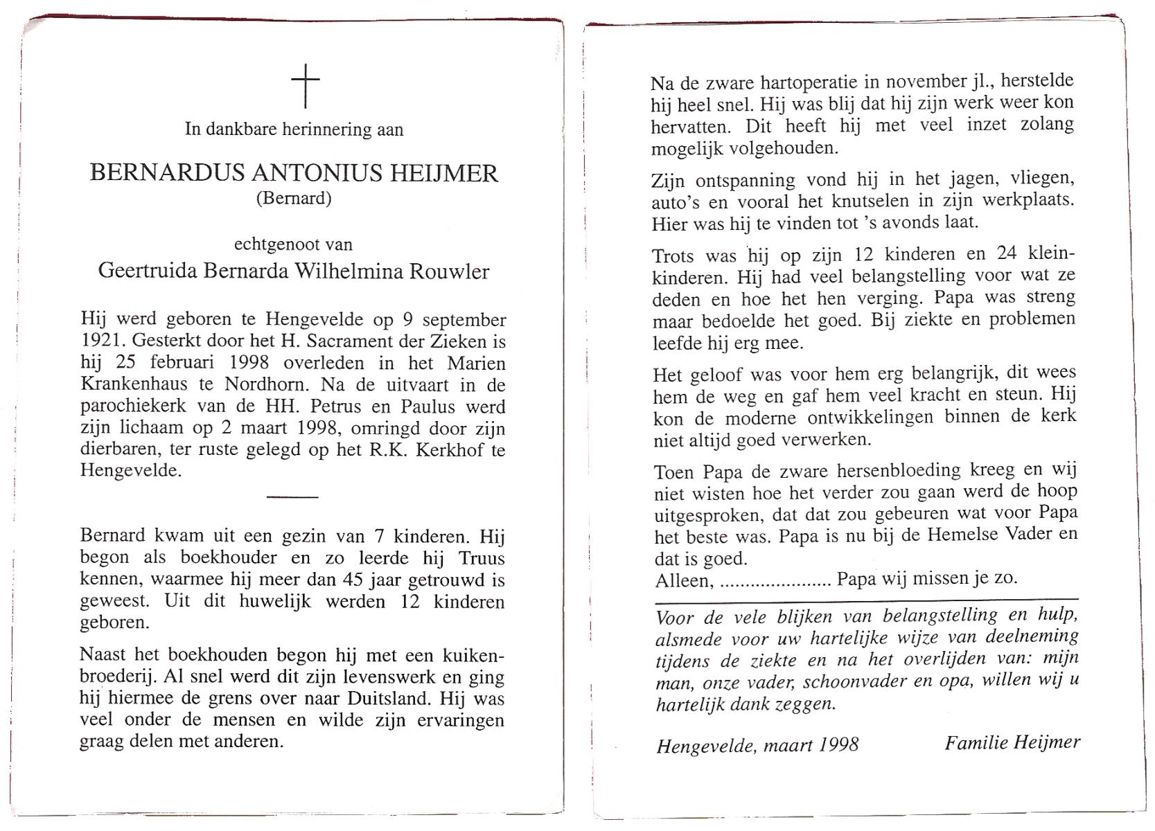 HEIJMER, Bernardus Antonius (Bernard), geboren op 9-9-1921 te Hengevelde, overleden op 25-2-1998 te Nordhorn, Dld op 76-jarige leeftijd, begraven op 2-3-1998 te Hengevelde.