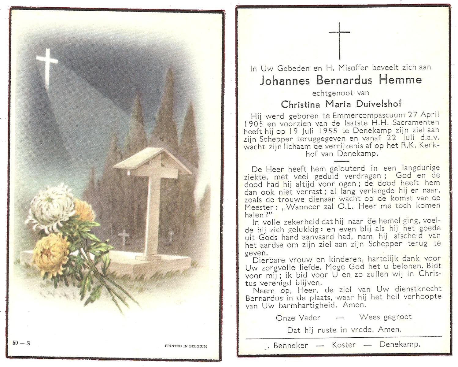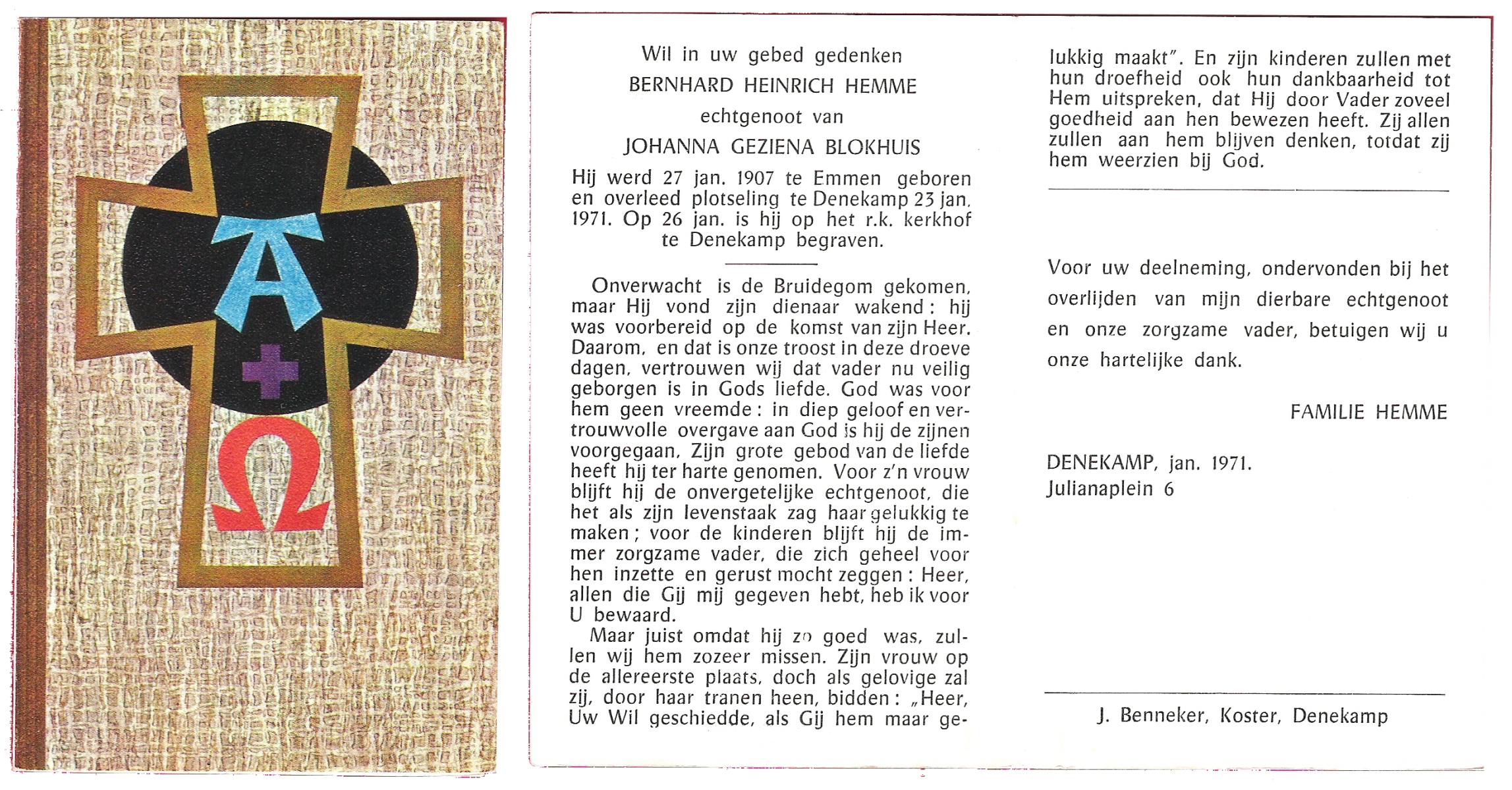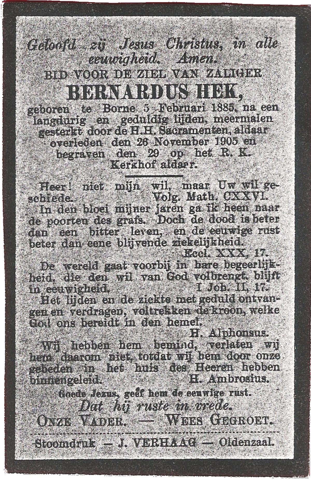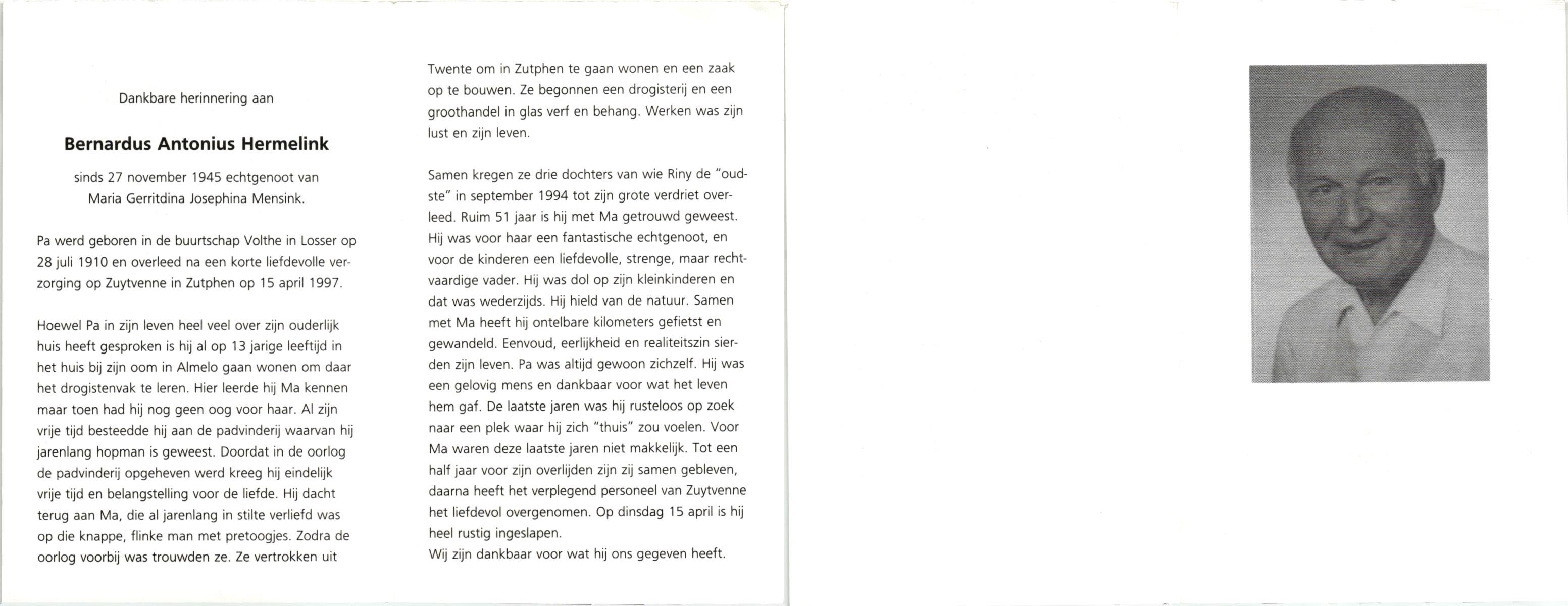HEIJMER, Bernardus Antonius (Bernard), geboren op 9-9-1921 te Hengevelde, overleden op 25-2-1998 te Nordhorn, Dld op 76-jarige leeftijd, begraven op 2-3-1998 te Hengevelde.