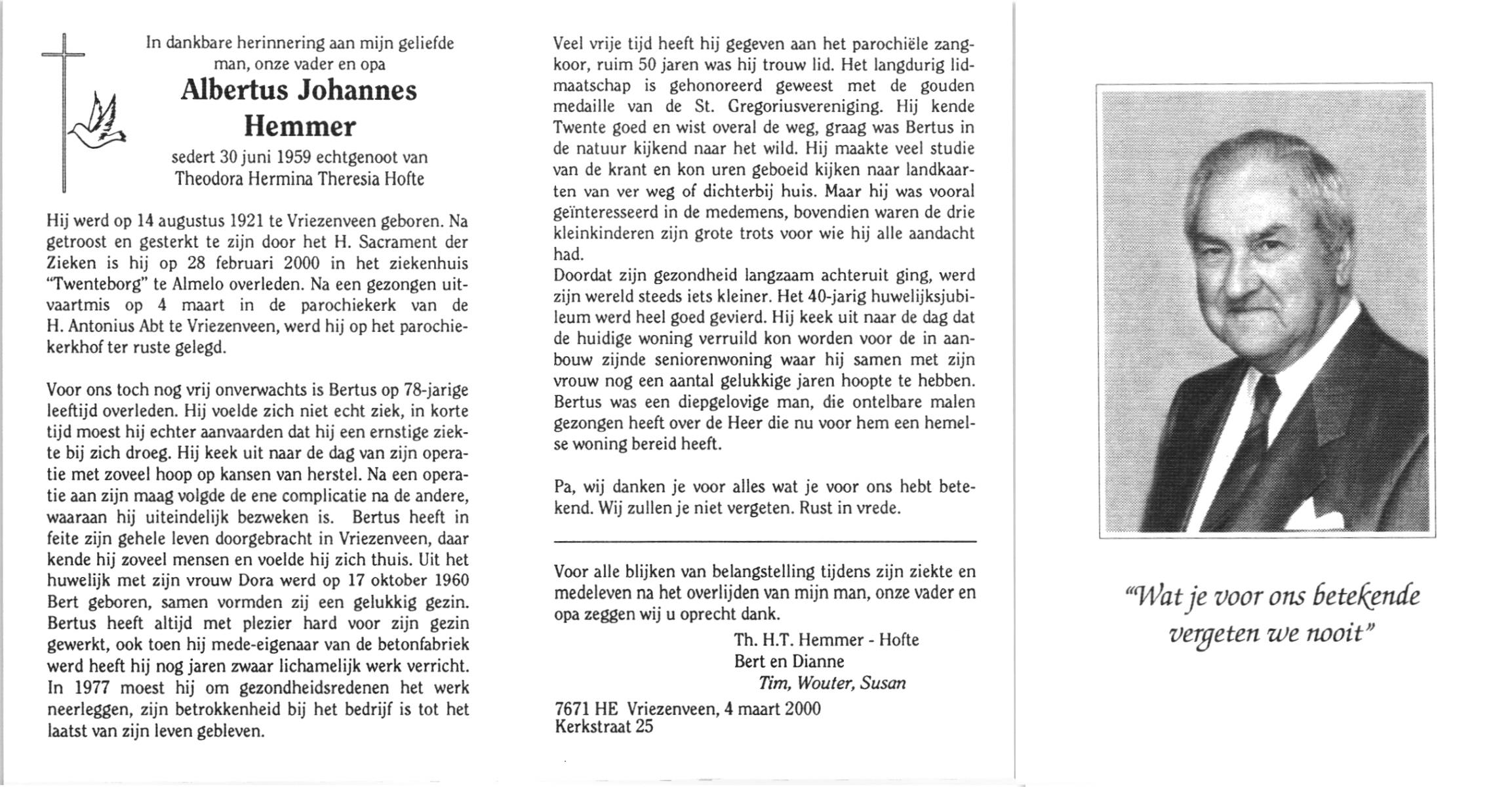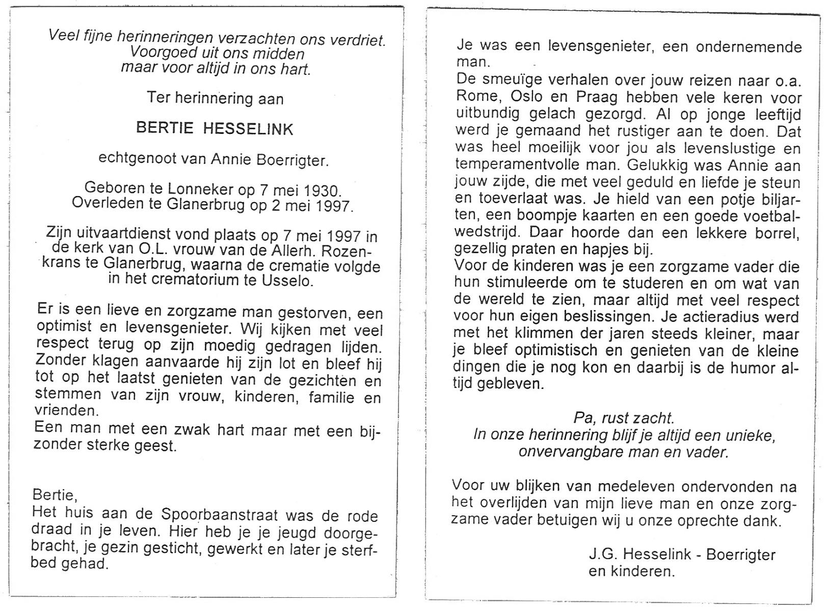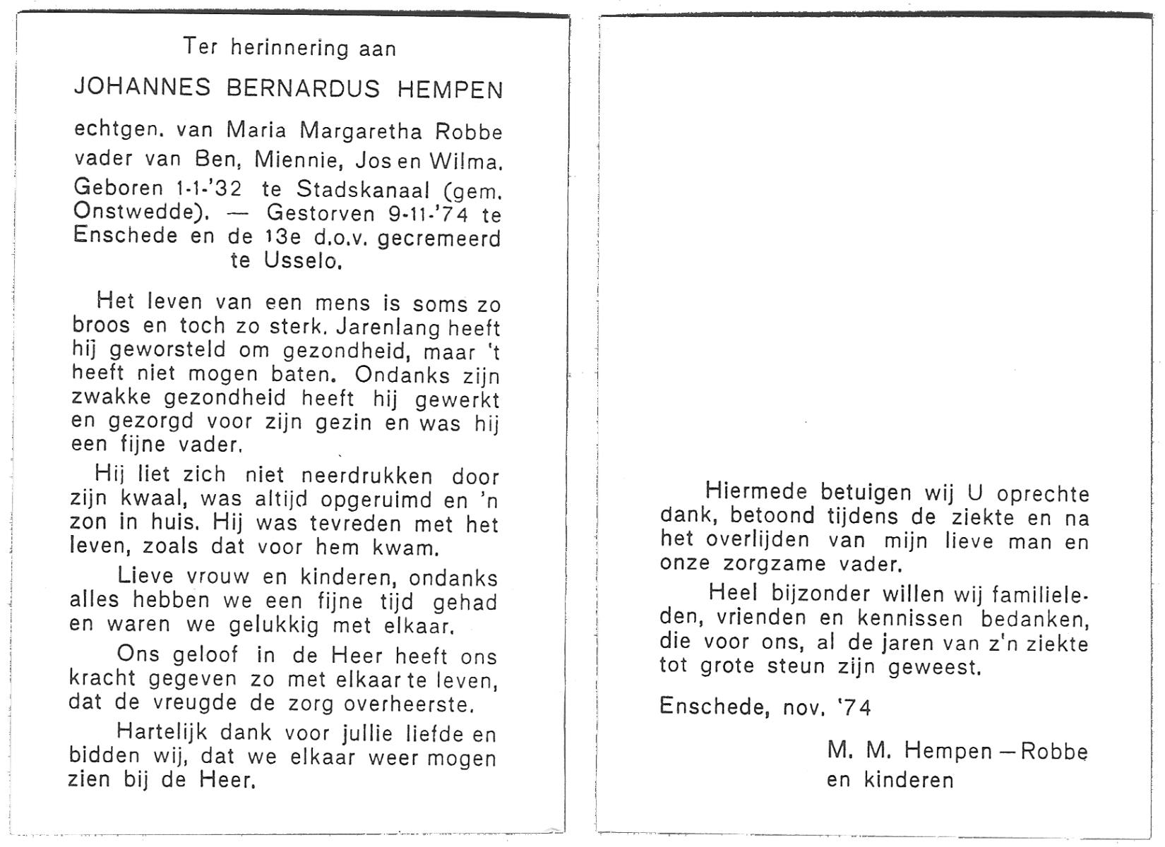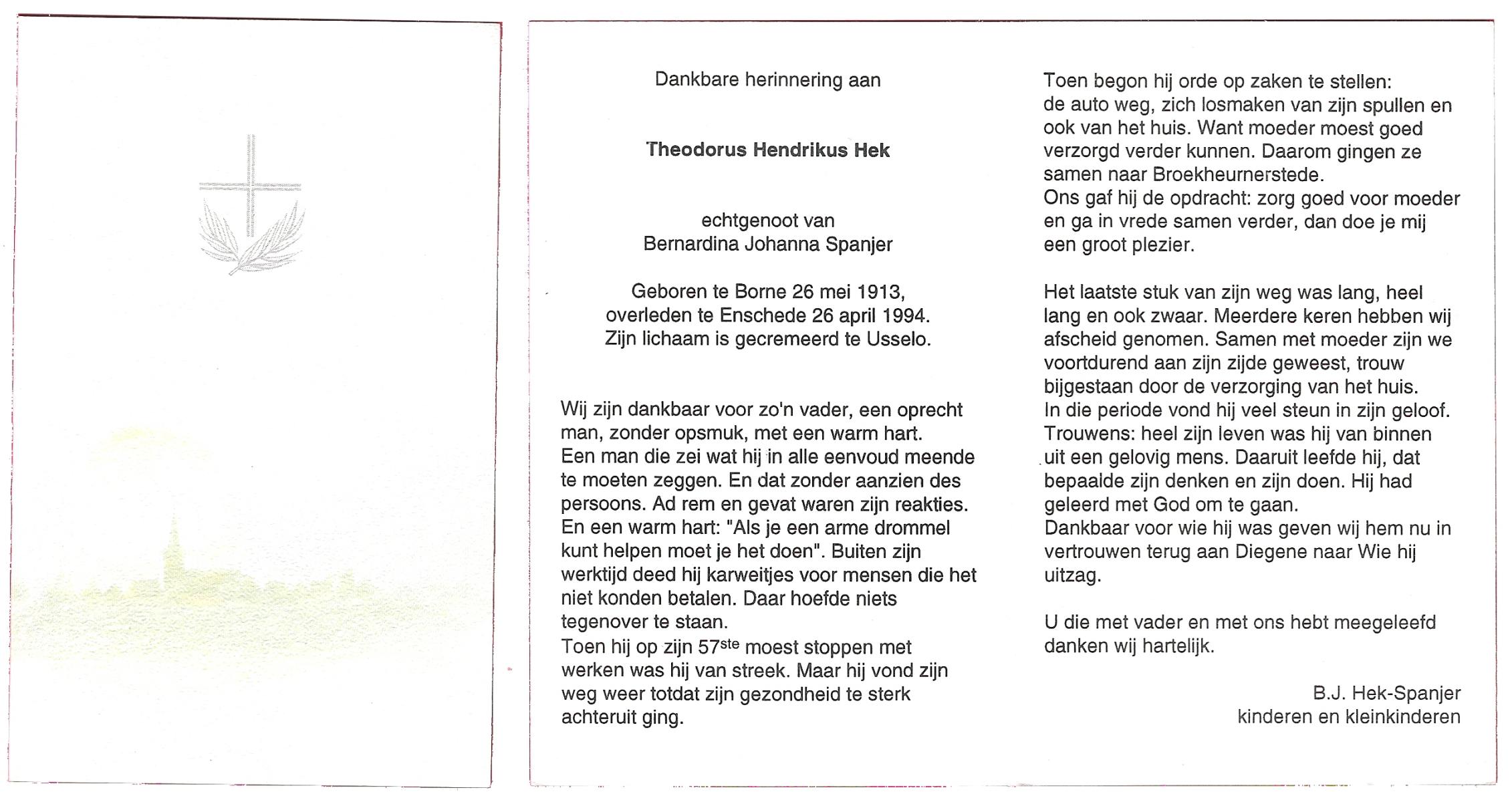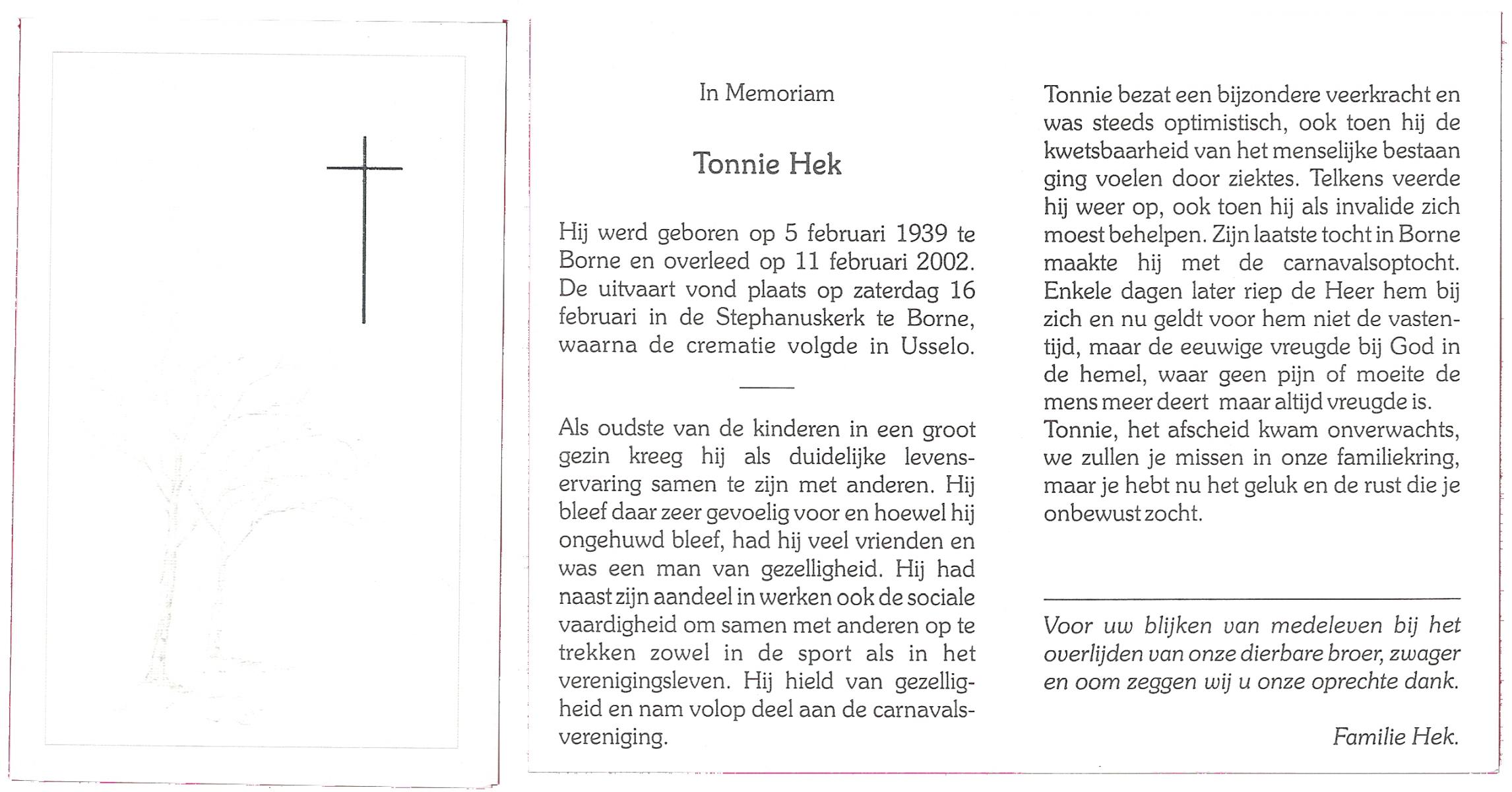 HEIJMER, Bernardus Antonius (Bernard), geboren op 9-9-1921 te Hengevelde, overleden op 25-2-1998 te Nordhorn, Dld op 76-jarige leeftijd, begraven op 2-3-1998 te Hengevelde.