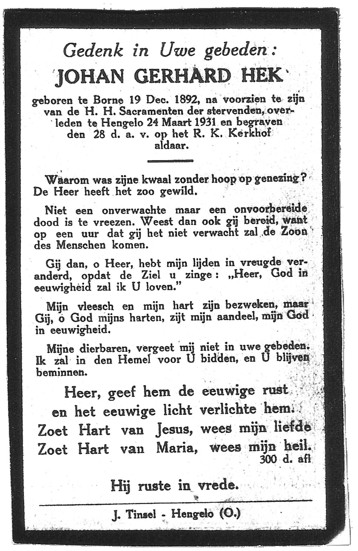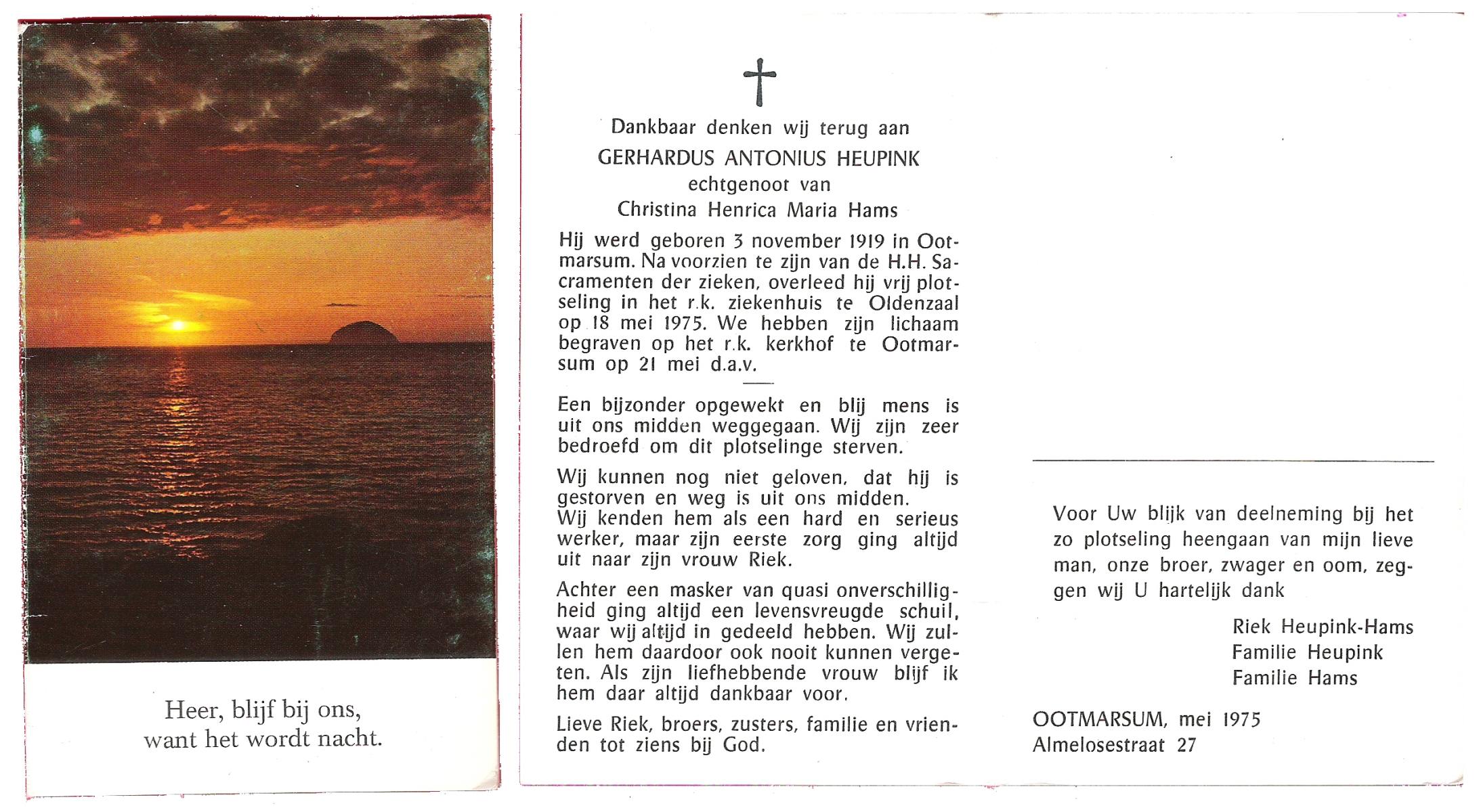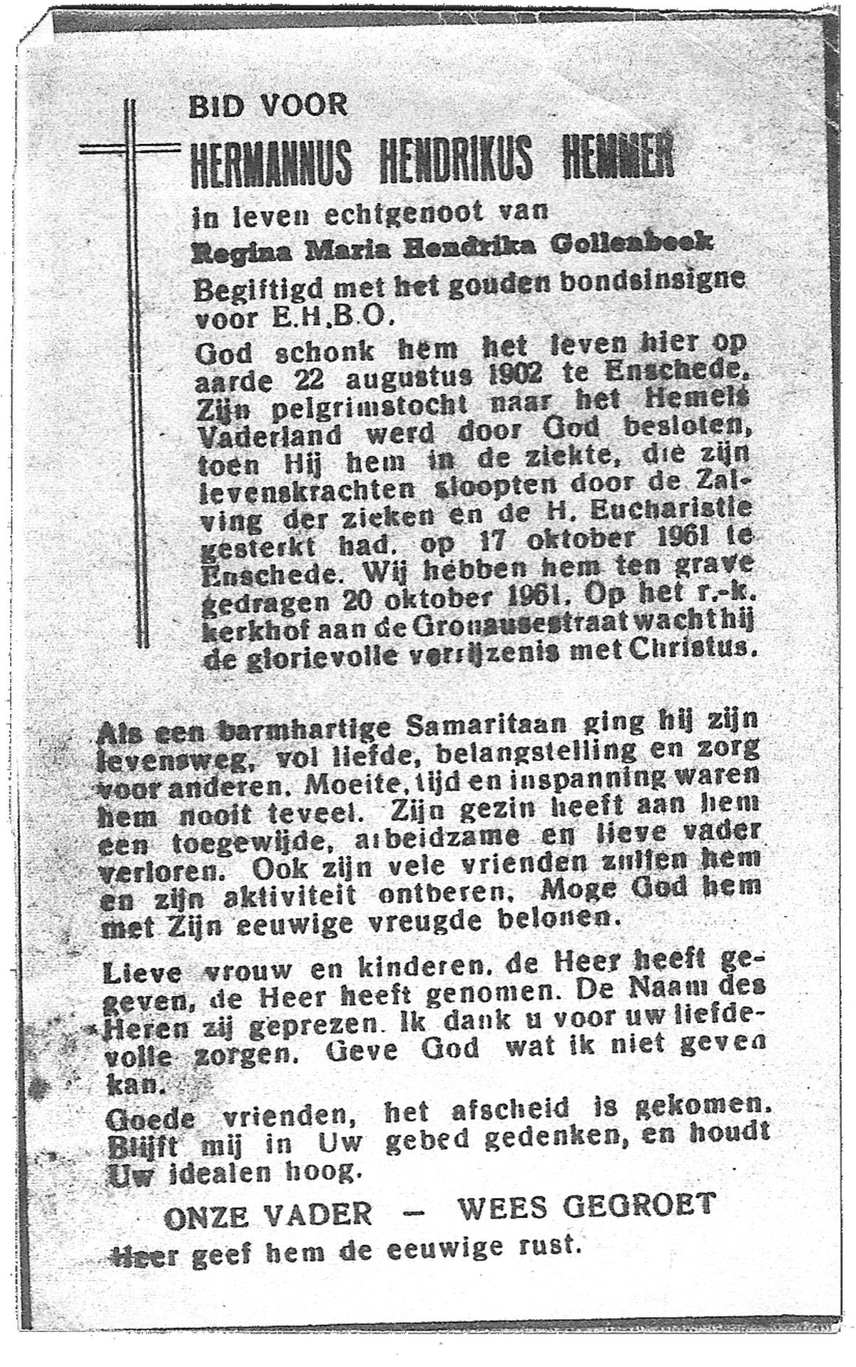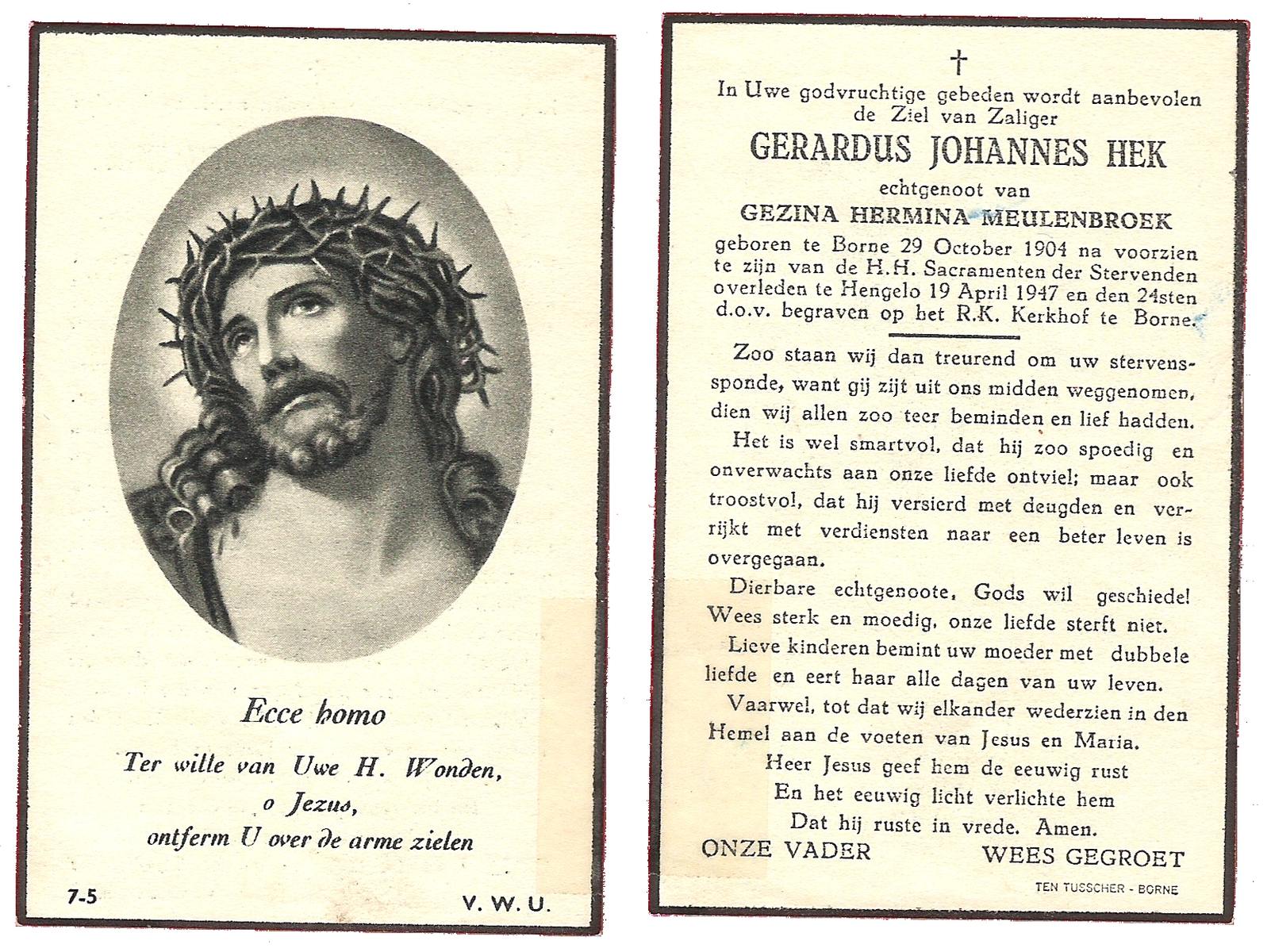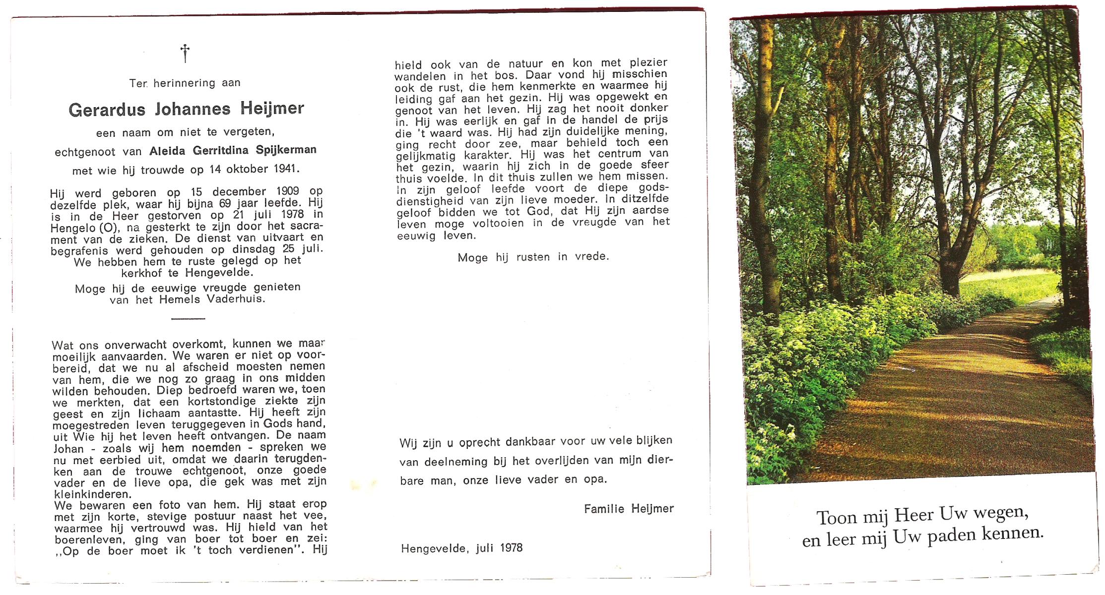 HEIJMER, Gerardus Johannes, geboren op 15-12-1909 te Hengevelde, overleden op 21-7-1978 te Hengelo (Ov.) op 68-jarige leeftijd, begraven te Hengevelde.