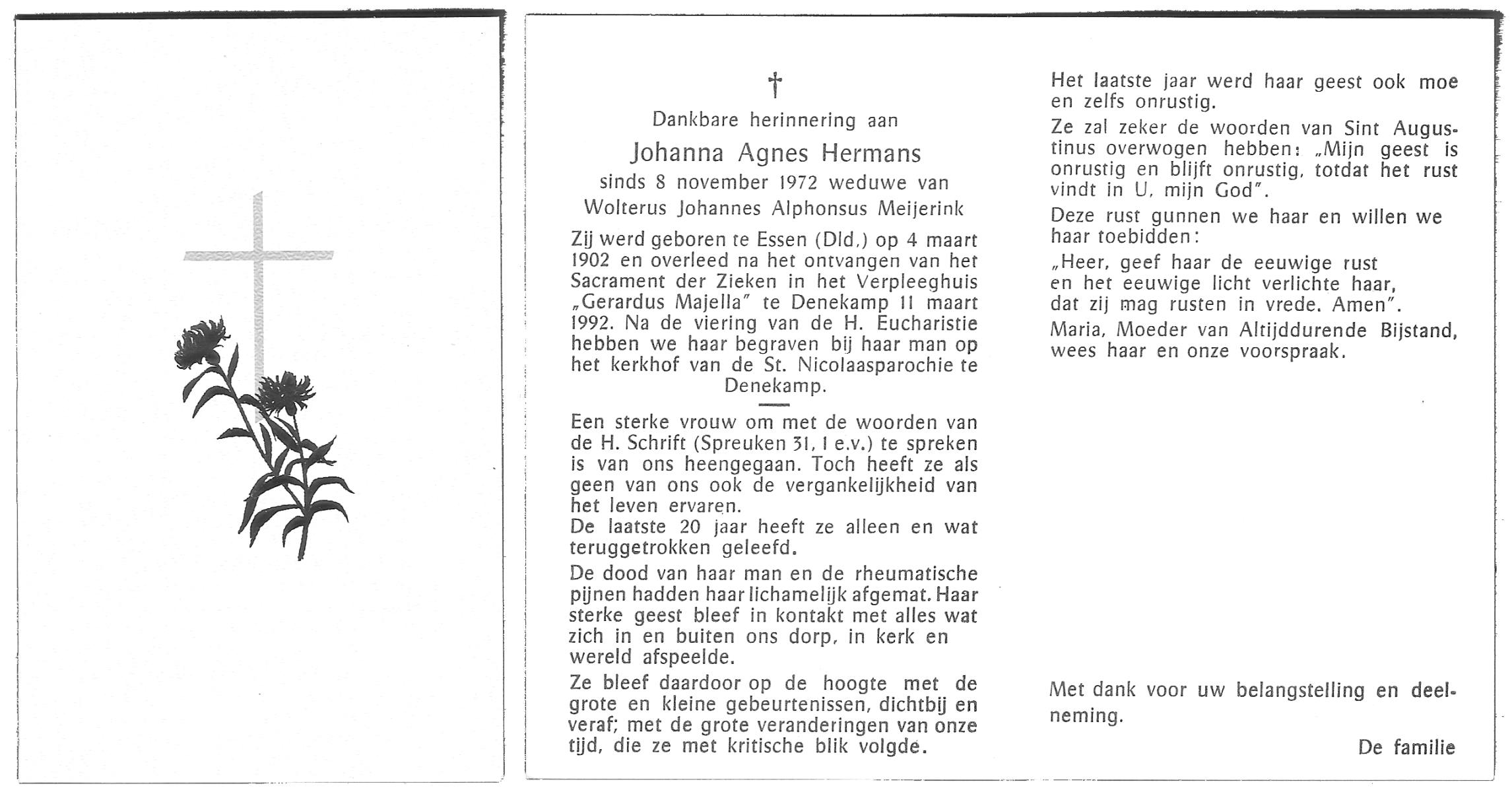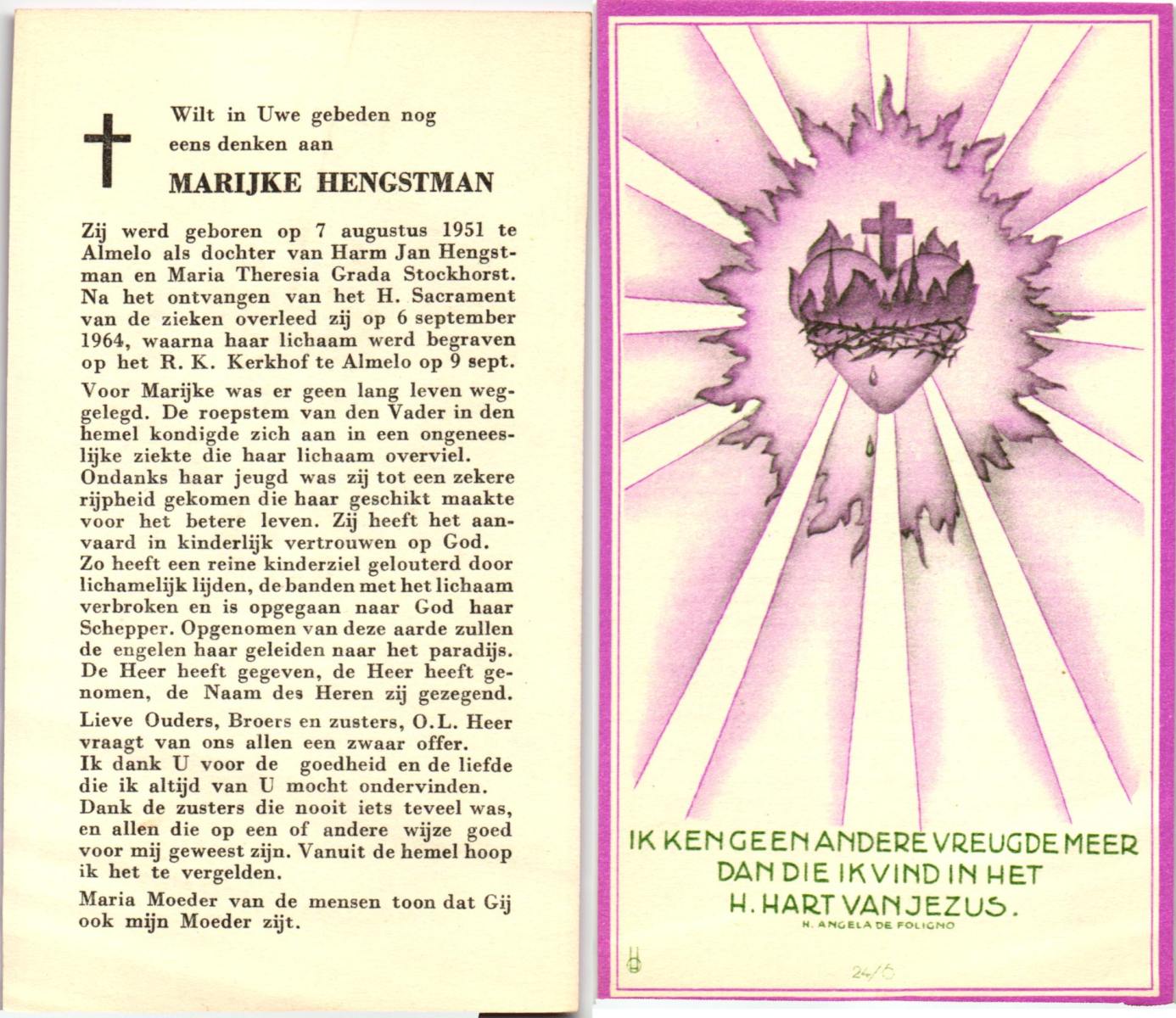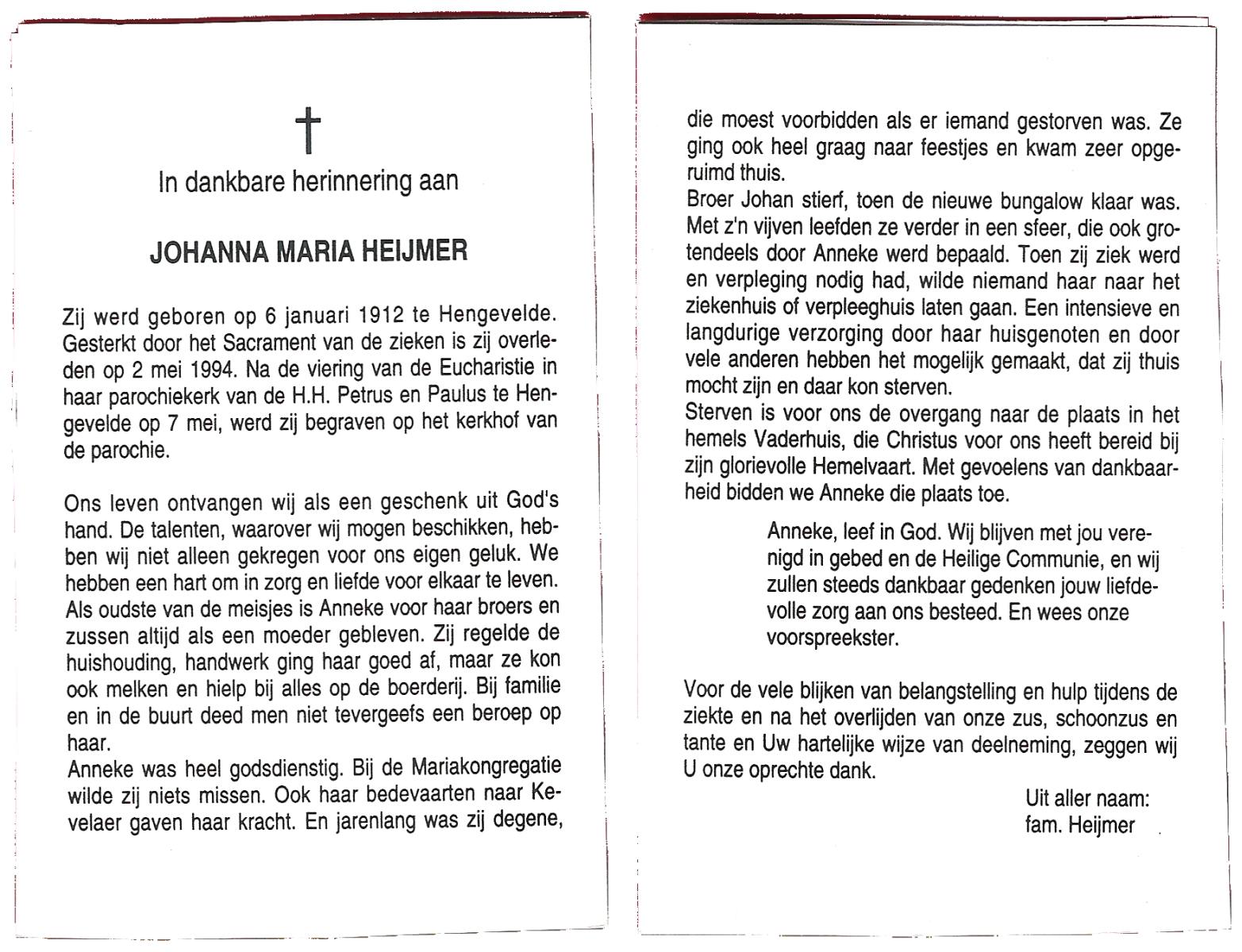 HEIJMER, Johanna Maria, geboren op 6-1-1912 te Hengevelde, overleden op 2-5-1994 op 82-jarige leeftijd, begraven op 7-5-1994 te Hengevelde.