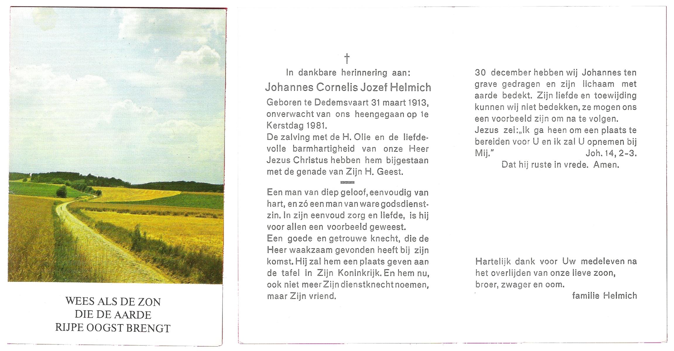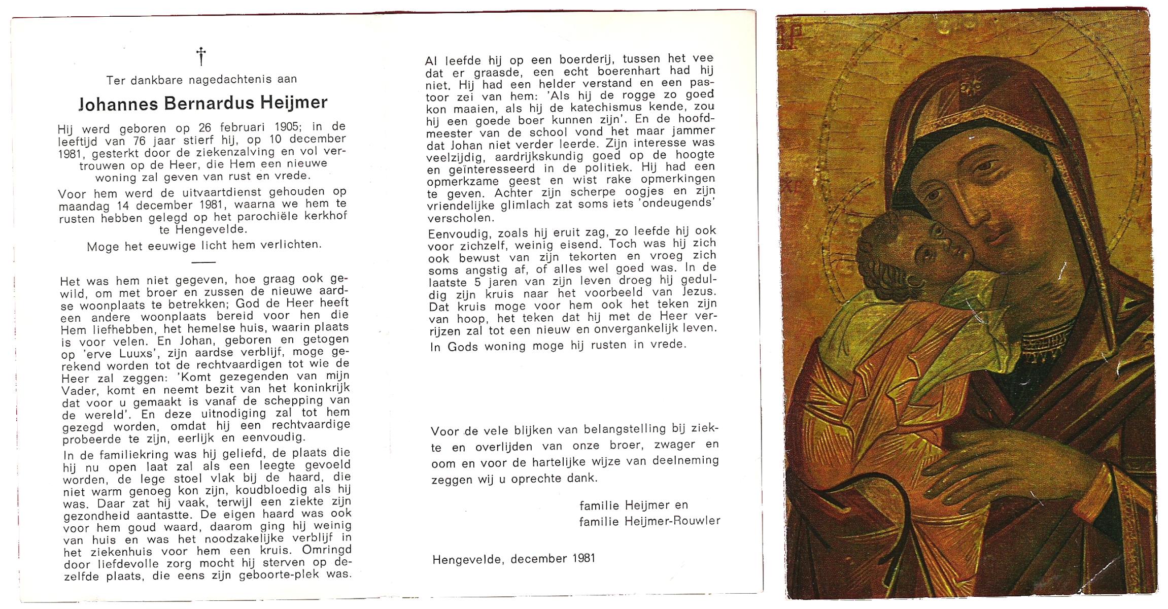 HEIJMER, Johannes Bernardus, geboren op 26-2-1905, overleden op 10-12-1981 op 76-jarige leeftijd, begraven op 14-12-1981 te Hengevelde.