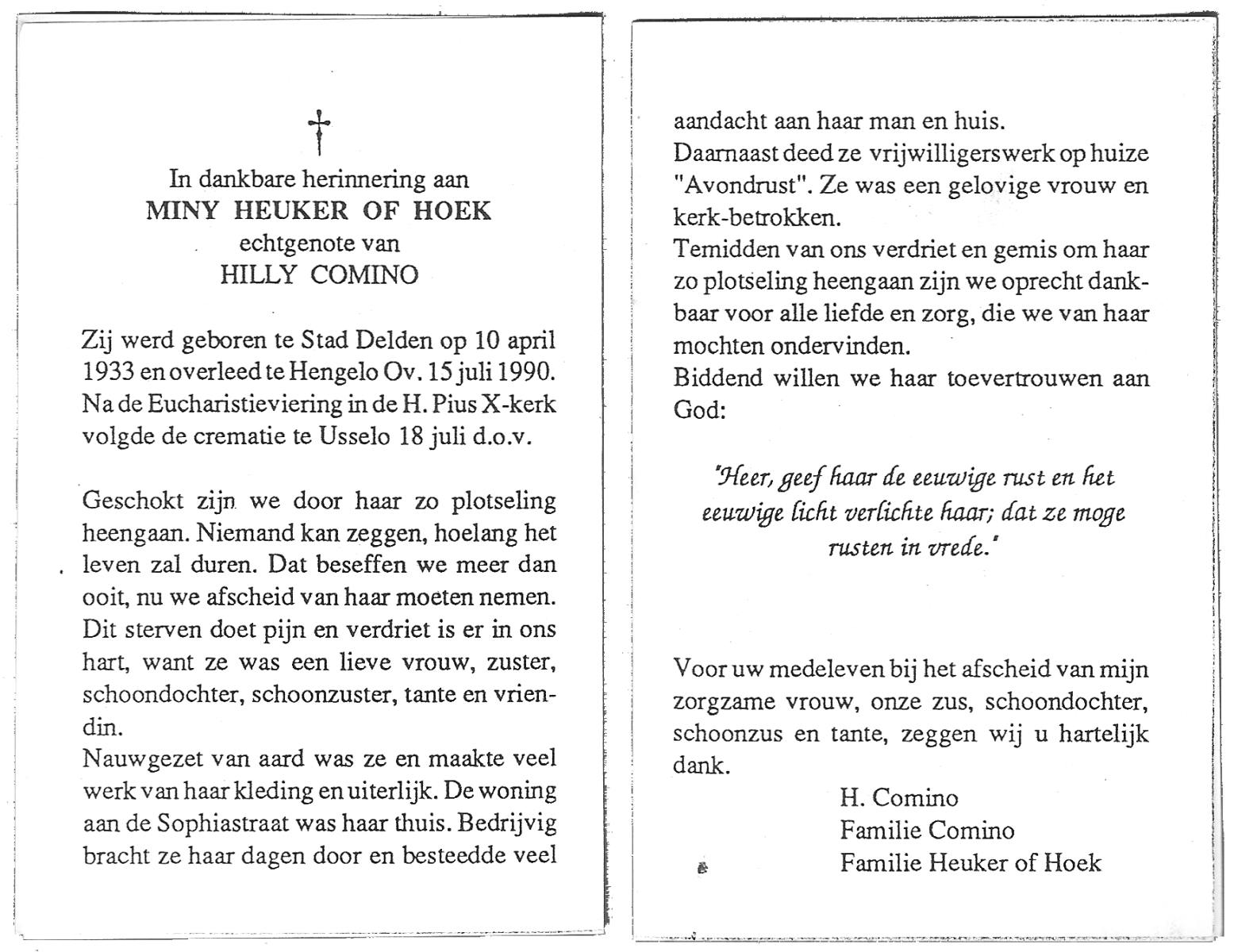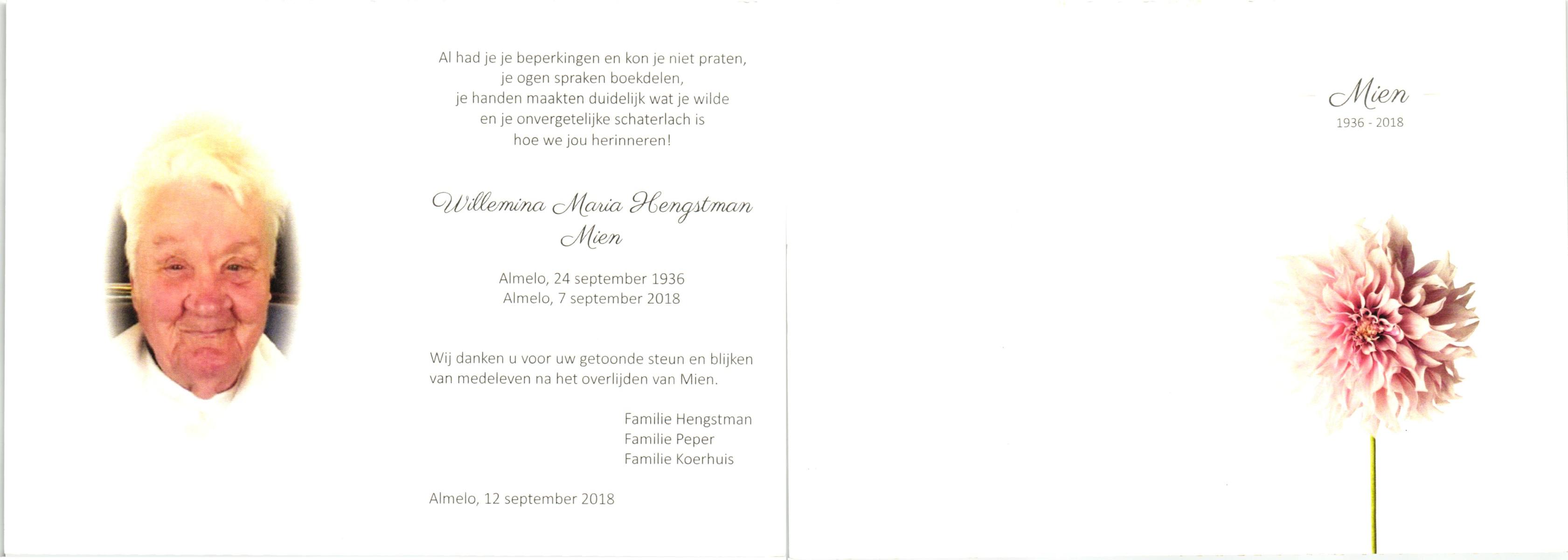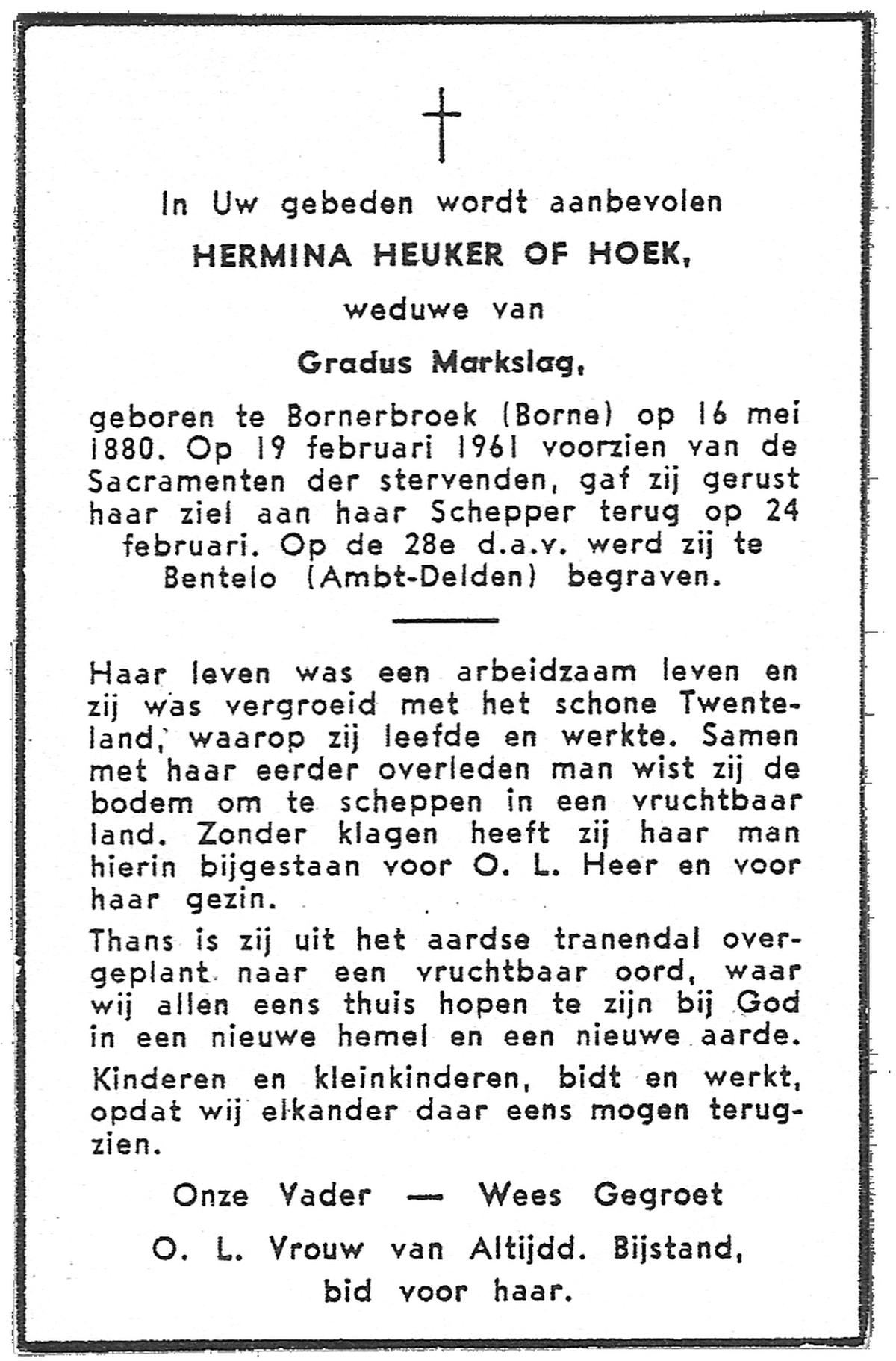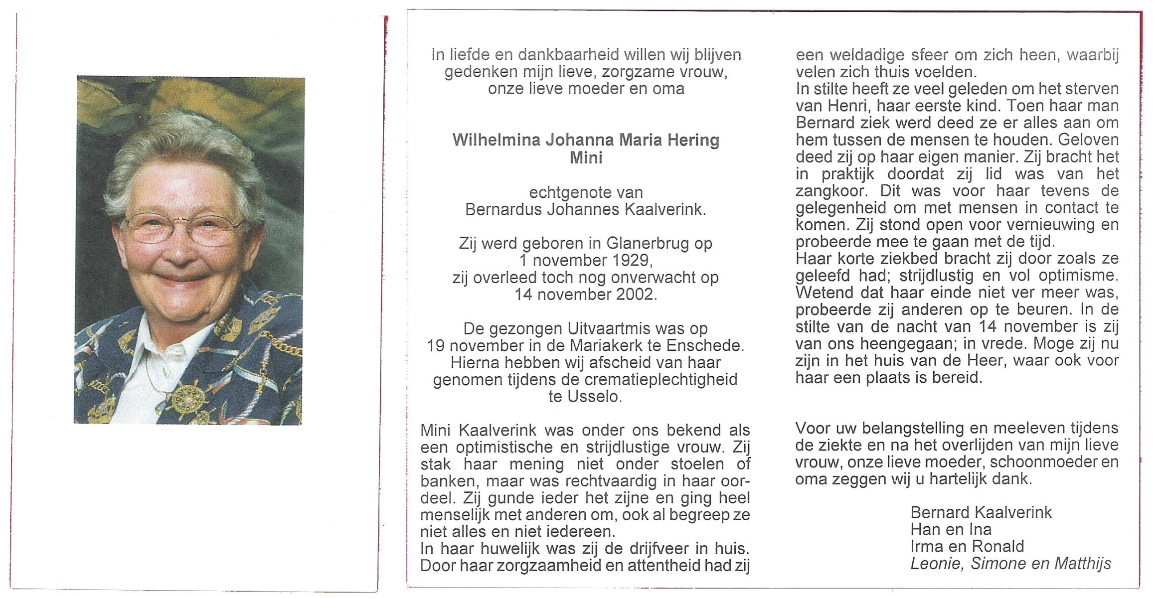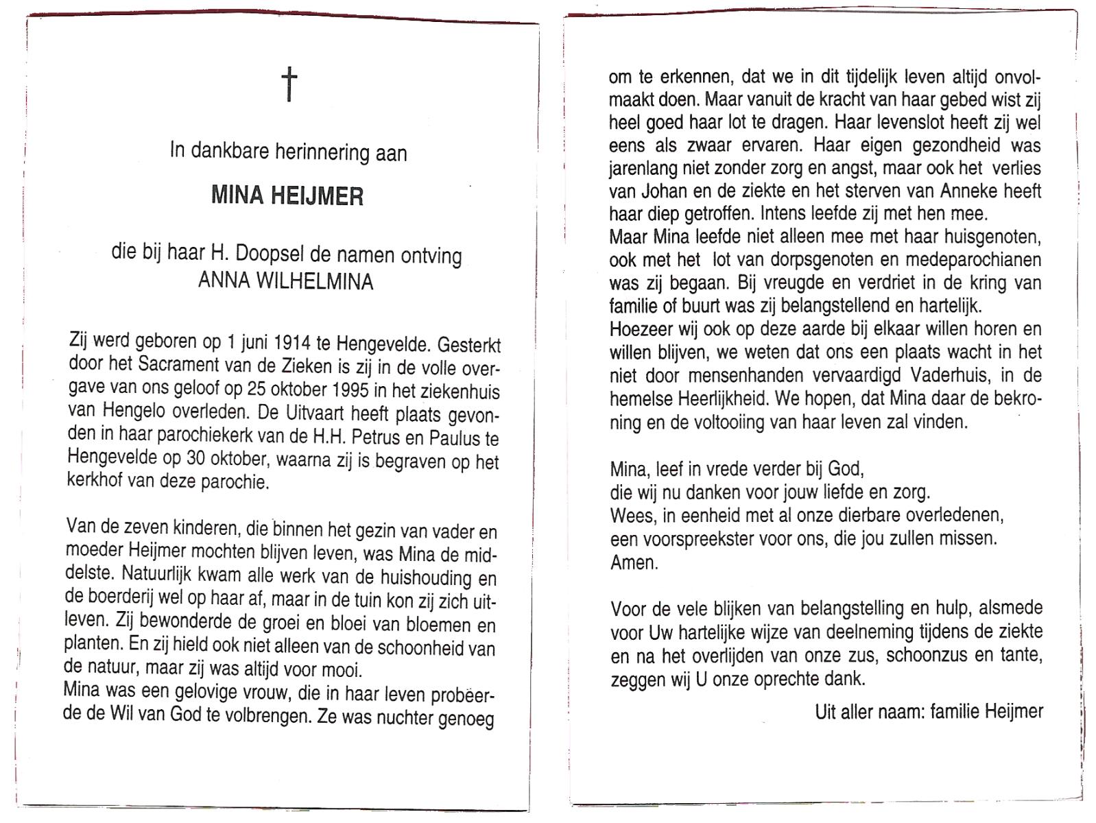 HEIJMER, Mina (Anna Wilhelmina), geboren op 1-6-1914 te Hengevelde, overleden op 25-10-1995 te Hengelo (Ov.) op 81-jarige leeftijd, begraven op 30-10-1995 te Hengevelde.
