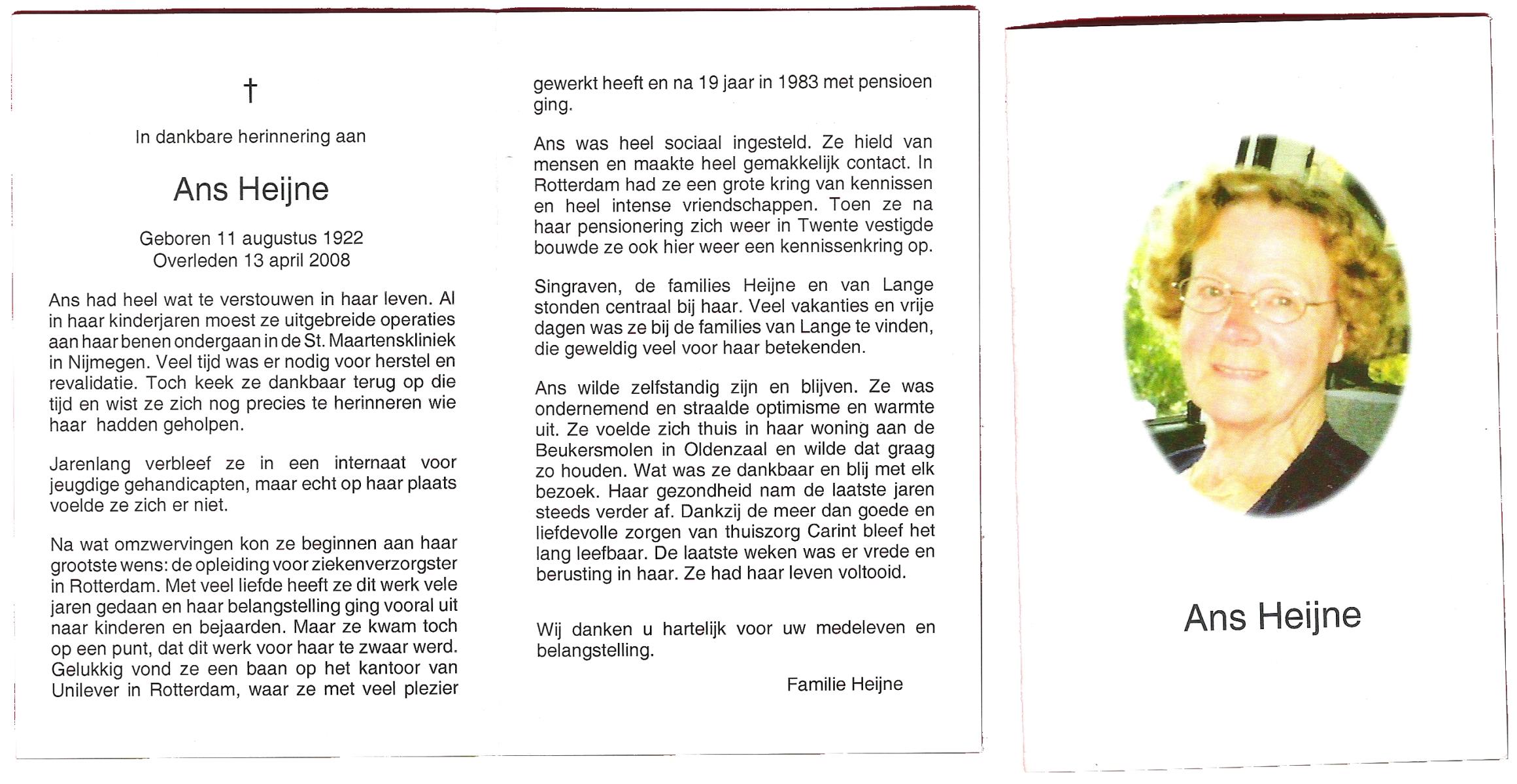 HEIJNE, Ans, geboren op 11-8-1922, overleden op 13-4-2008 te Oldenzaal op 77-jarige leeftijd.