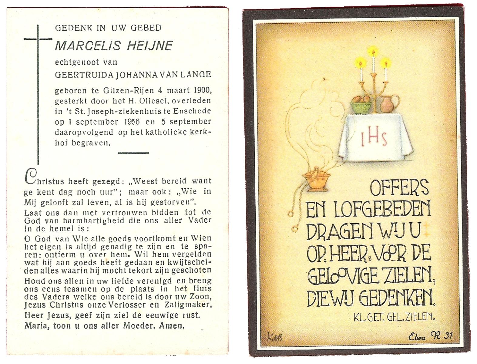 HEIJNE, Marcelis, geboren op 4-3-1900 te Gilzen-Rijen, overleden op 1-9-1956 te Enschede op 56-jarige leeftijd, begraven op 5-9-1956 te Enschede.