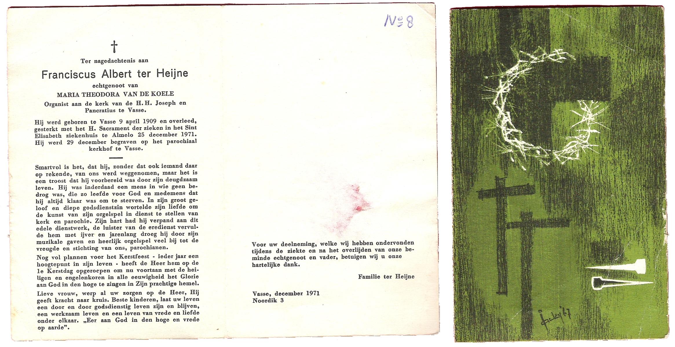 HEIJNE, ter, Franciscus Albert, geboren op 9-4-1909 te Vasse, overleden op 25-12-1971 te Almelo op 62-jarige leeftijd, begraven op 29-12-1971 te Vasse.