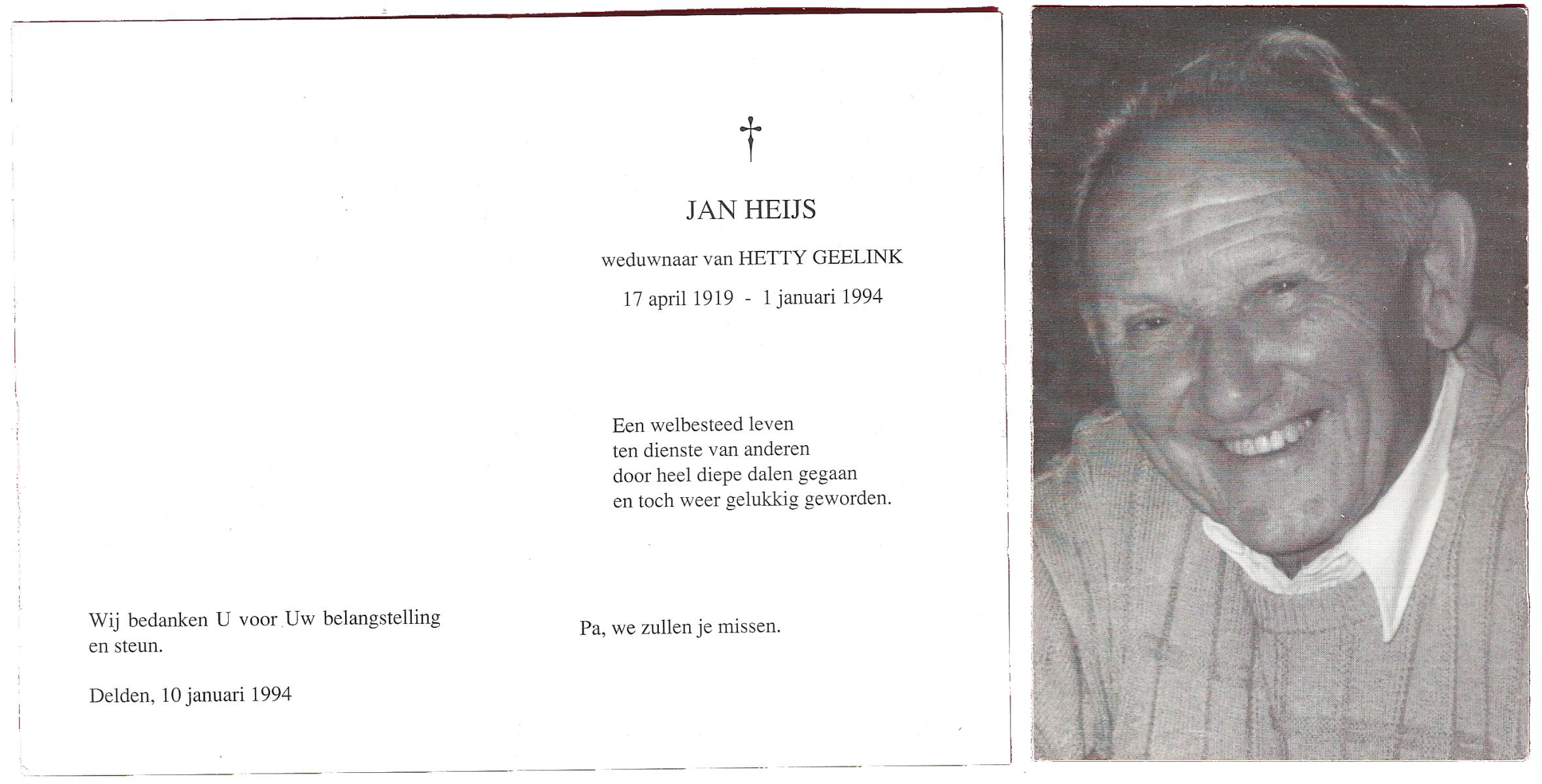 HEIJS, Jan, geboren op 17-4-1919, overleden op 1-1-1994 op 74-jarige leeftijd.