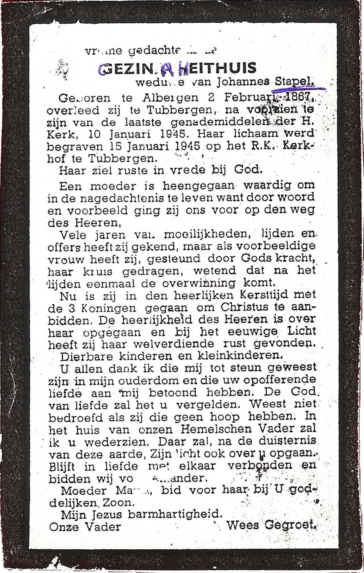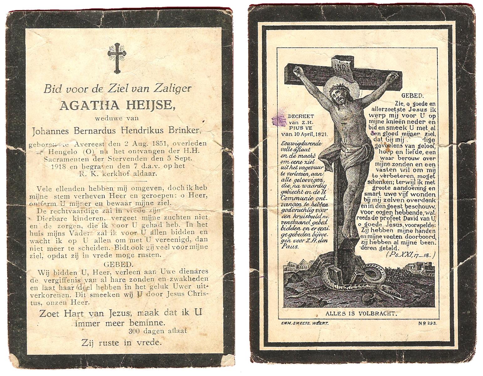 HEIJSE, Agatha, geboren op 02-08-1851 te Avereest, overleden op 5-9-1918 te Hengelo (Ov.) op 67-jarige leeftijd, begraven op 7-9-1918 te Hengelo (Ov.).