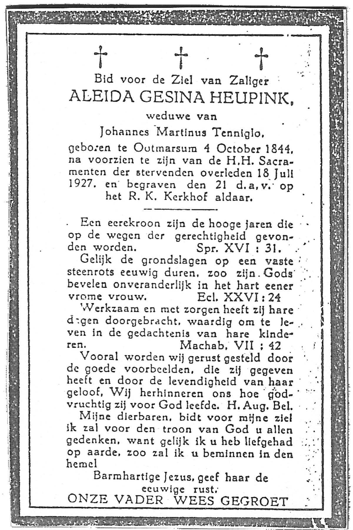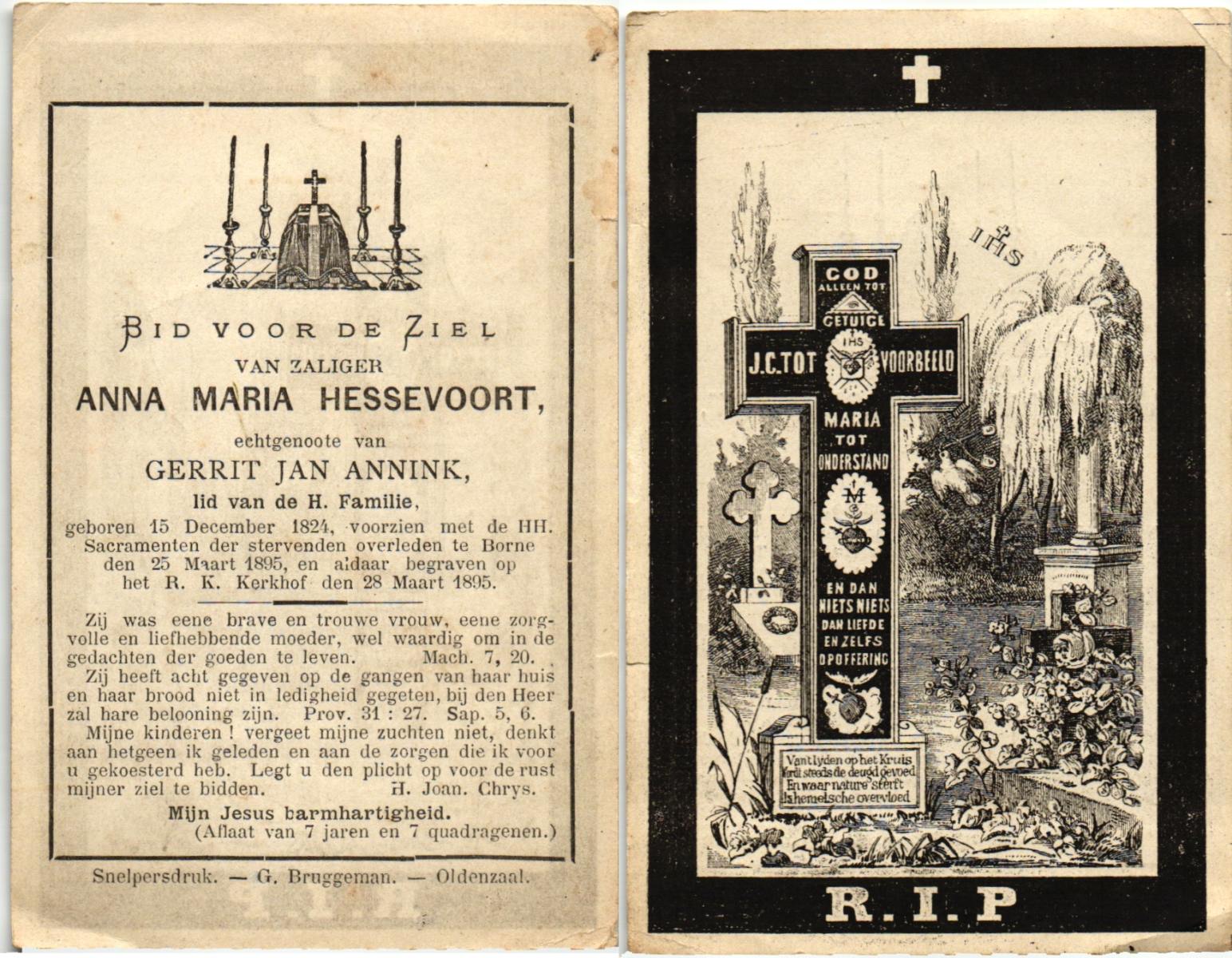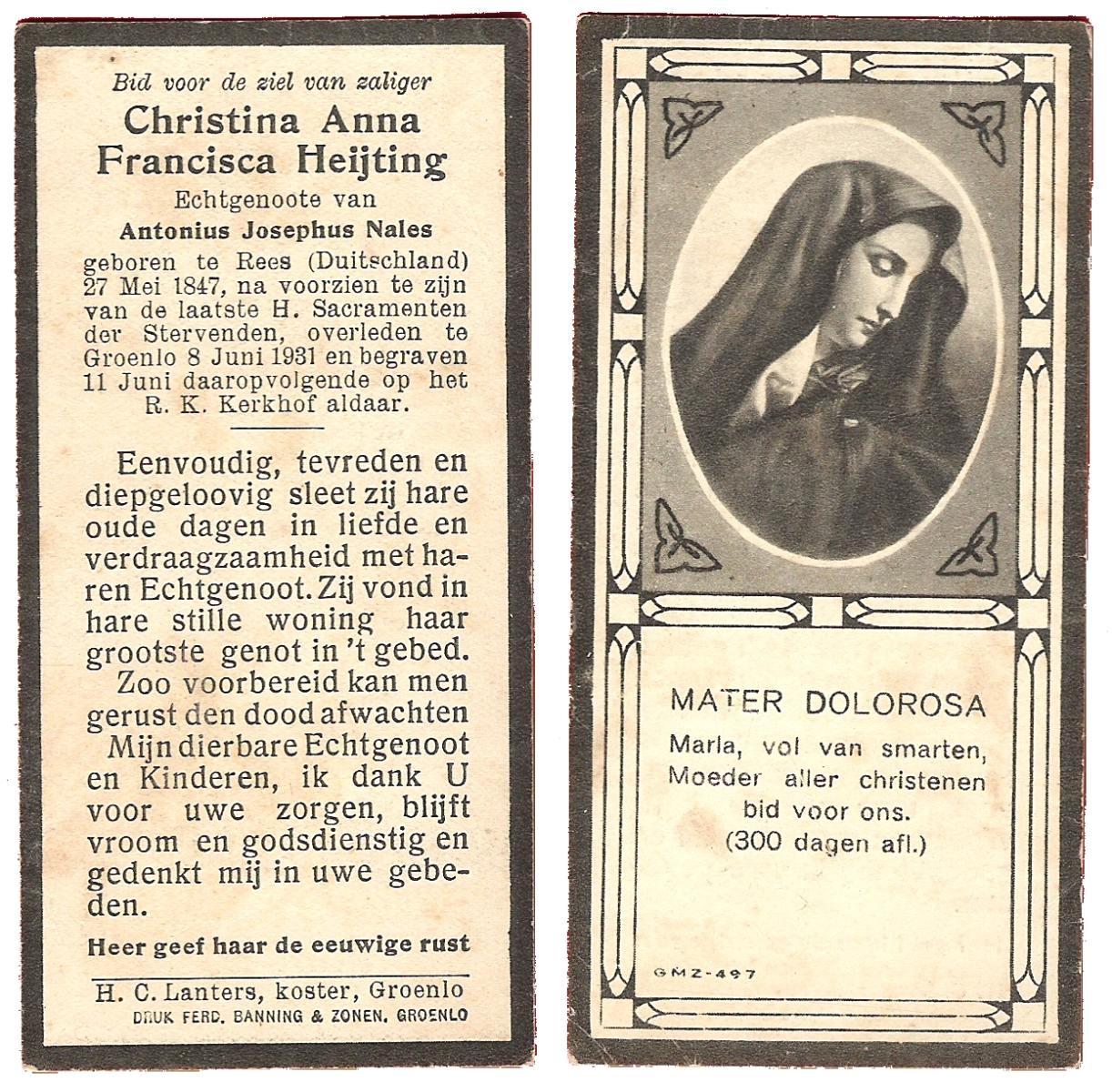 HEIJTING, Christina Anna Francisca, geboren op 27-05-1847 te Rees, overleden op 8-6-1931 te Groenlo op 84-jarige leeftijd, begraven op 11-6-1931 te Groenlo.