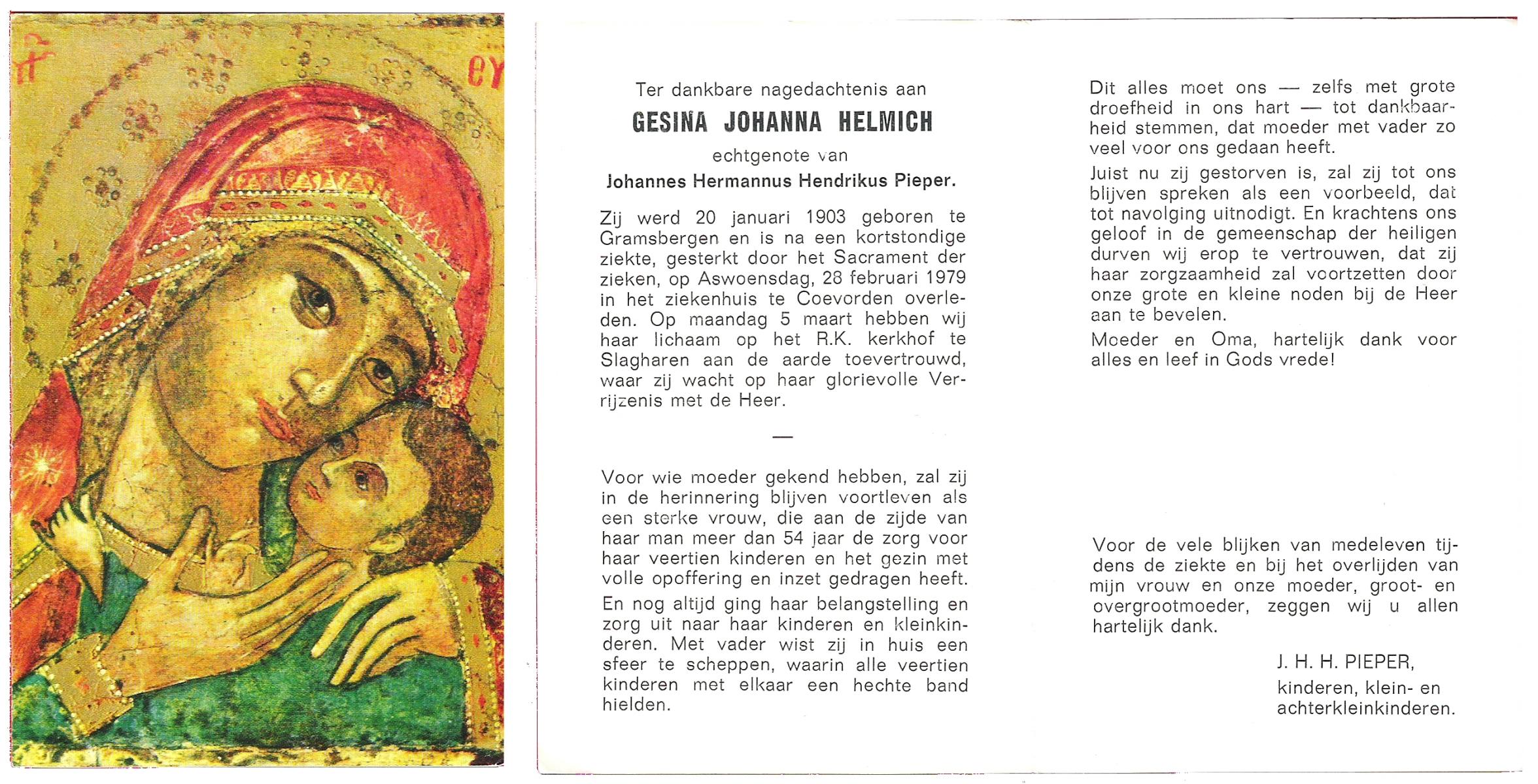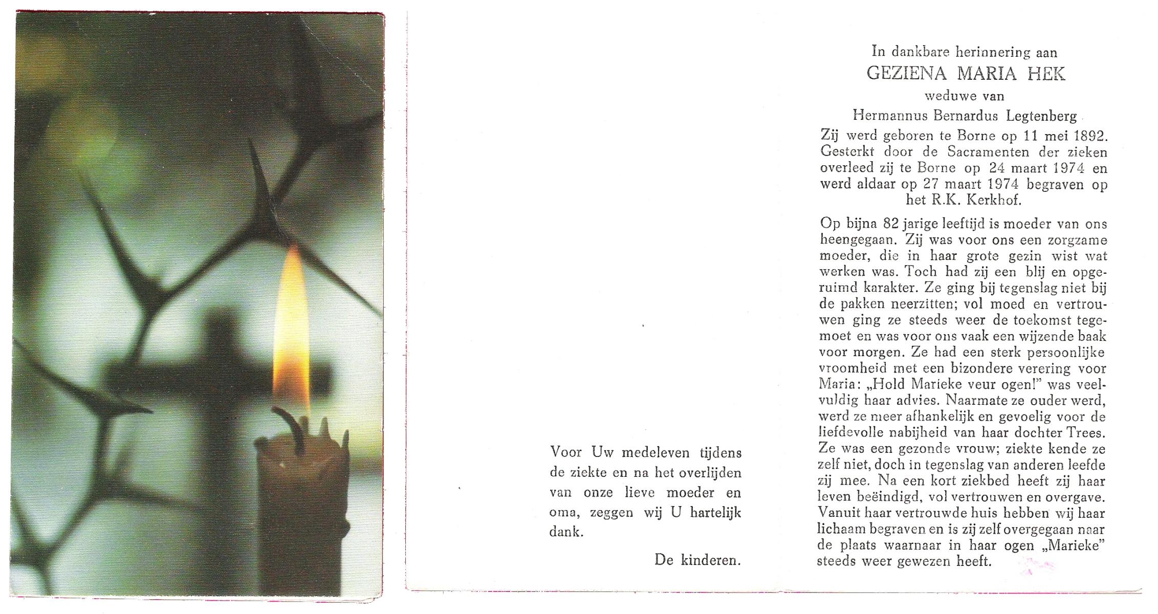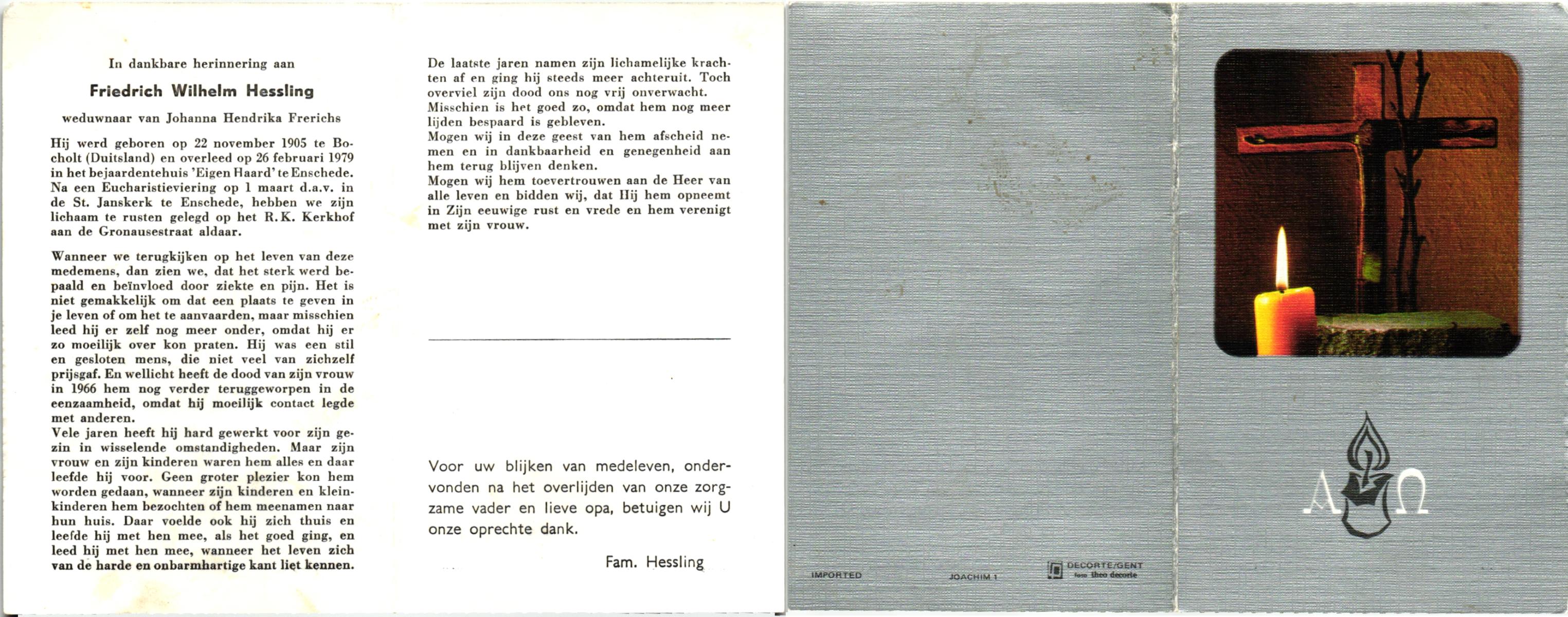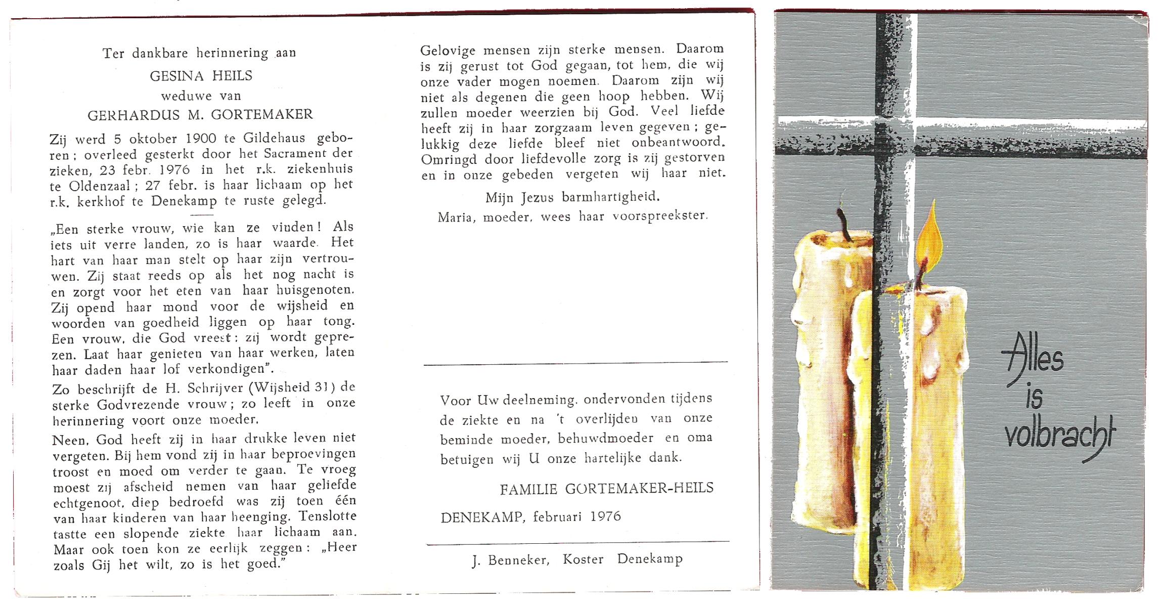 HEILS, Gesina, geboren op 5-10-1900 te Gildehaus (Dld.), overleden op 23-2-1976 te Oldenzaal op 76-jarige leeftijd, begraven op 27-2-1976 te Denekamp.